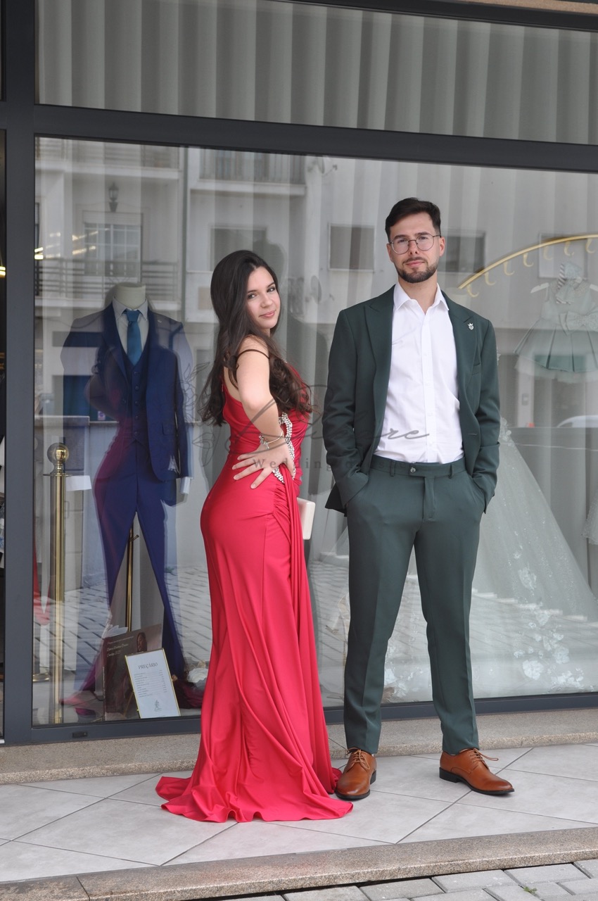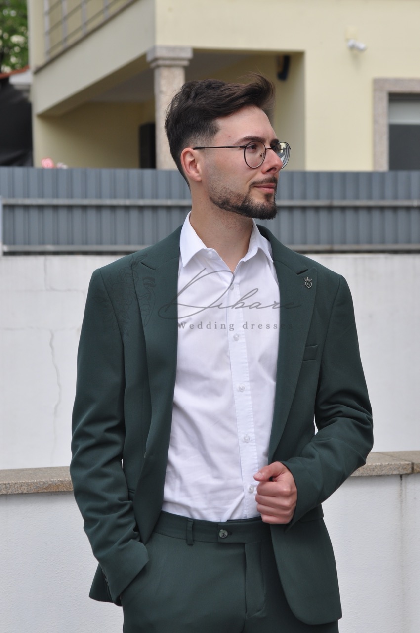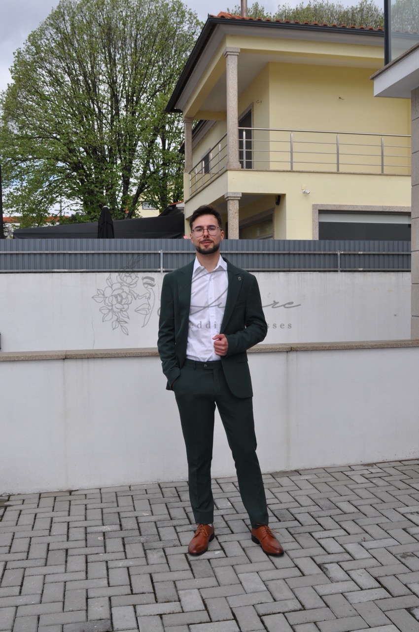 Este fato de três peças, apresentado num elegante tom de verde garrafa, é a personificação da sofisticação moderna para o guarda-roupa masculino. É ideal para eventos formais, casamentos ou ambientes de trabalho que exijam um código de vestuário casual elevado. A americana, com um corte slim-fit que realça a silhueta, apresenta lapelas entalhadas de largura média e um fecho de dois botões. A sua estrutura ligeiramente rígida garante um caimento impecável, enquanto o tecido de toque suave promete conforto durante todo o dia. As calças a condizer mantêm o corte slim-fit, terminando de forma polida acima do calçado, contribuindo para um look contemporâneo e alongado. A cor, um verde escuro profundo e subtil, oferece uma alternativa refrescante ao azul marinho ou cinzento tradicionais, mantendo-se perfeitamente versátil. Neste look, o contraste é criado pela clássica camisa branca com colarinho aberto, proporcionando um toque nítido e luminoso que equilibra a tonalidade escura do fato. O conjunto é finalizado com uns sapatos de couro em tons de castanho-cobre, que adicionam um ponto de cor quente e terroso, elevando a composição a um nível de estilo inquestionável.