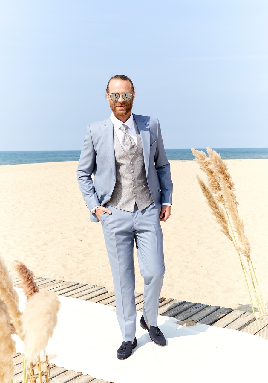 Este fato de três peças é a escolha ideal para quem procura uma elegância contemporânea e luminosa, sendo perfeito para cerimónias ao ar livre, casamentos na praia ou eventos estivais de prestígio. O conjunto destaca-se pelo seu tom azul-claro sofisticado, que confere uma aura de frescura e modernidade ao visual clássico. O casaco apresenta um corte slim fit que valoriza a silhueta, complementado por um colete em contraste num tom cinza pérola, que eleva o nível de formalidade e detalhe do traje. A calça, de vinco marcado e corte preciso, mantém a continuidade estética da peça principal.