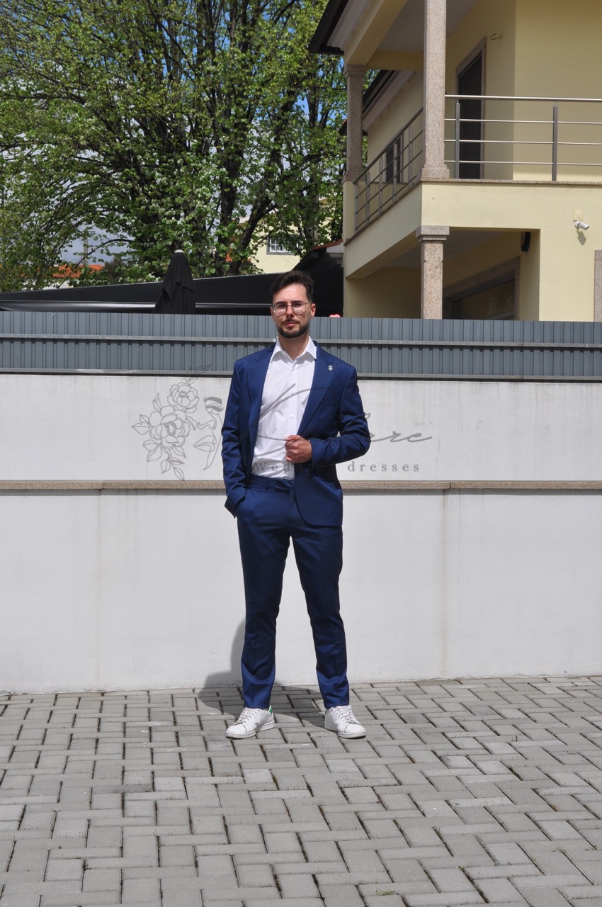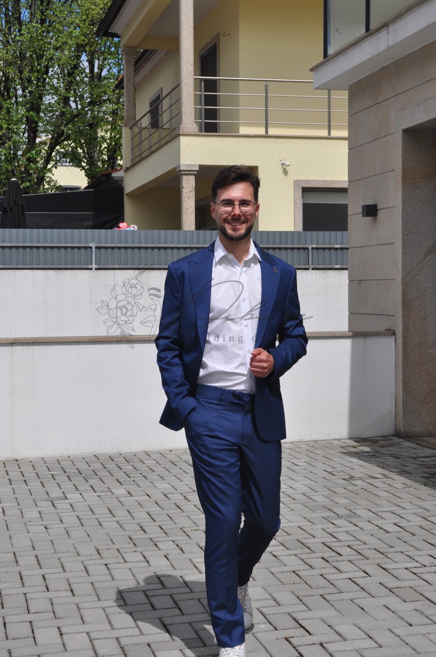 Este fato de três peças num vibrante e intemporal tom de azul petróleo é uma peça essencial que combina a formalidade tradicional com um toque contemporâneo. É a escolha perfeita para eventos de dia ou de noite, desde casamentos a reuniões de negócios importantes. A americana possui um corte slim-fit, que garante uma silhueta moderna e definida, abraçando o corpo sem restringir o movimento. Apresenta lapelas entalhadas clássicas e um fecho frontal de dois botões. O tecido, com um acabamento suave, sugere uma composição leve e confortável, ideal para uso prolongado. As calças a condizer mantêm a mesma linha slim-fit, com um corte limpo e moderno, garantindo uma transição perfeita para o calçado. Neste look, a cor forte do fato é inteligentemente conjugada com uma camisa social branca imaculada, criando um contraste nítido e elegante que ilumina o rosto. O toque final de informalidade inteligente é dado pelo calçado: uns ténis brancos discretos, que tornam o conjunto mais acessível e versátil para ambientes menos estritamente formais, mas que podem ser facilmente substituídos por sapatos de couro para um look mais clássico.