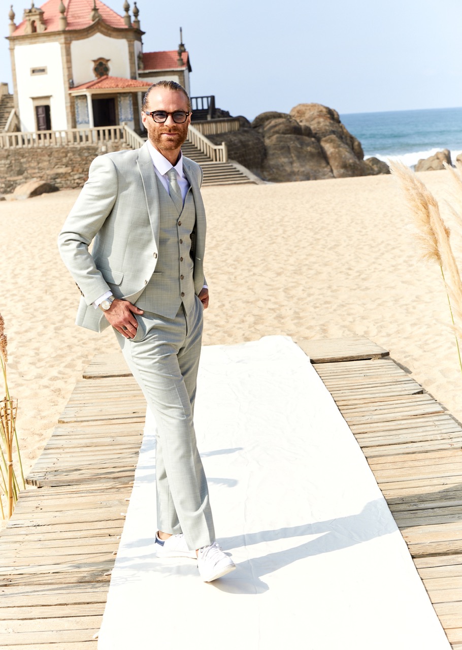 Este fato de três peças num sofisticado tom verde menta pálido é a escolha definitiva para o homem que procura um visual fresco, moderno e distinto. Especialmente concebido para eventos diurnos, celebrações ao ar livre ou casamentos com um conceito “boho-chique”, este traje destaca-se pela sua tonalidade suave que transmite serenidade e elegância contemporânea. Concebido com um corte slim fit, o fato molda-se ao corpo de forma impecável, garantindo uma silhueta esguia e atual. O casaco de dois botões apresenta lapelas de entalhe clássicas e bolsos laterais com paleta, equilibrando o design tradicional com uma cor vanguardista. O colete de cinco botões, confeccionado no mesmo tecido e tom, acrescenta uma camada de formalidade que permite ao noivo ou convidado manter uma presença elegante mesmo em momentos mais descontraídos. A harmonia visual é completada por uma gravata clássica coordenada, que mantém a fluidez cromática de todo o conjunto.
