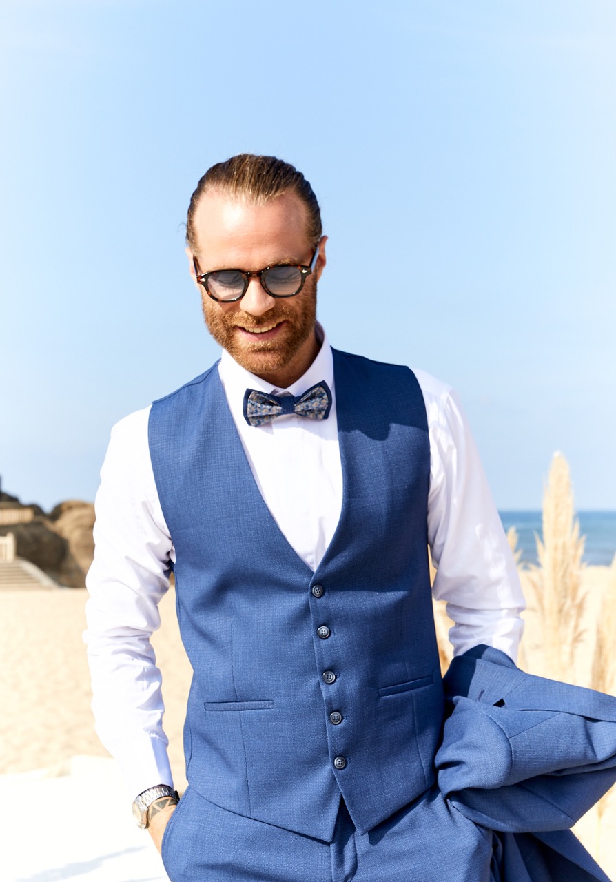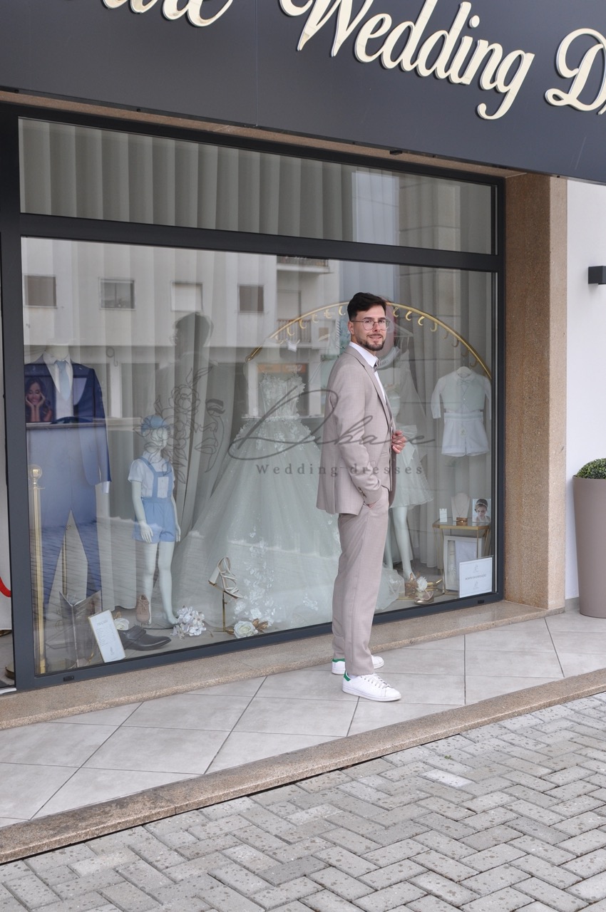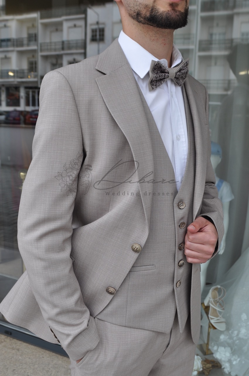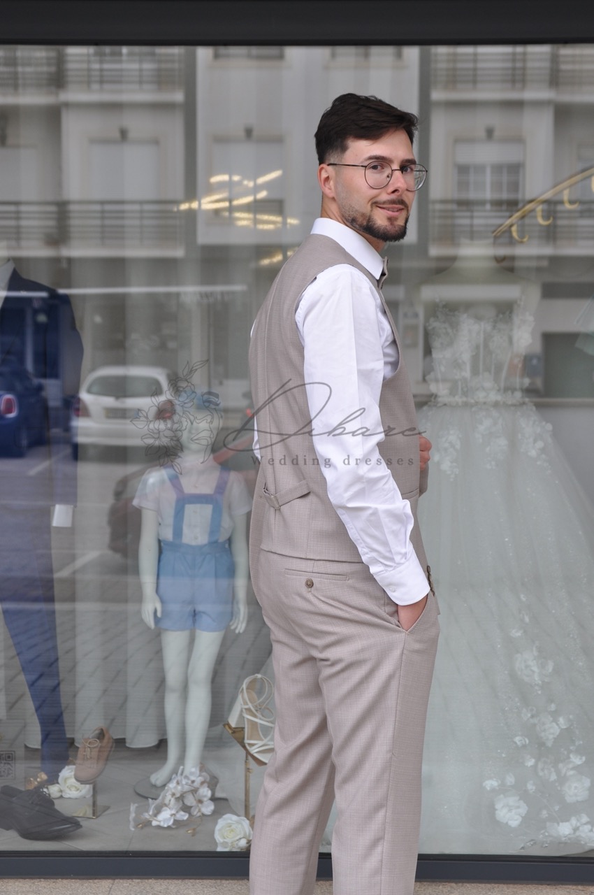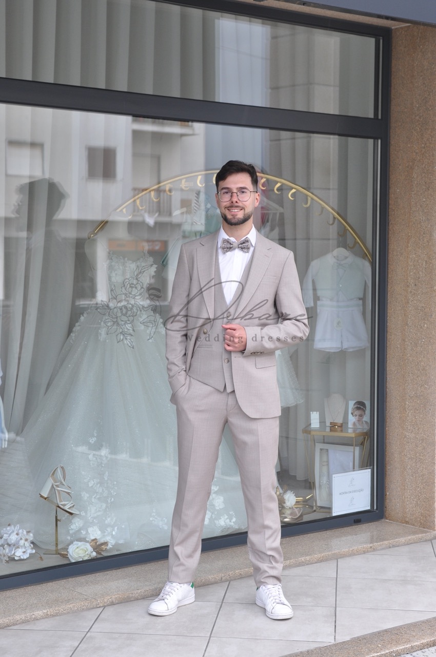 Este fato de três peças, numa tonalidade bege ou taupe clara e sofisticada, oferece uma abordagem moderna e elegante ao vestuário formal. O corte slim-fit ou ajustado realça a silhueta, conferindo-lhe um ar contemporâneo e polido. O conjunto é composto por um blazer de lapela notch, de botão único, que proporciona um fecho limpo e minimalista, complementado por um colete a condizer, ideal para adicionar uma camada extra de formalidade e requinte. As calças, com um corte direito e a condizer, completam o visual com um estilo coeso. A combinação com uma camisa branca e uma gravata borboleta discreta no mesmo tom do fato ou em branco cria um contraste subtil e elegante. A escolha de sapatos desportivos brancos (ténis) adiciona um toque inesperado de casualidade e conforto, tornando este fato excecionalmente versátil—perfeito tanto para cerimónias mais descontraídas ao ar livre quanto para eventos onde se exige um código de vestuário formal mas com um toque pessoal e moderno.