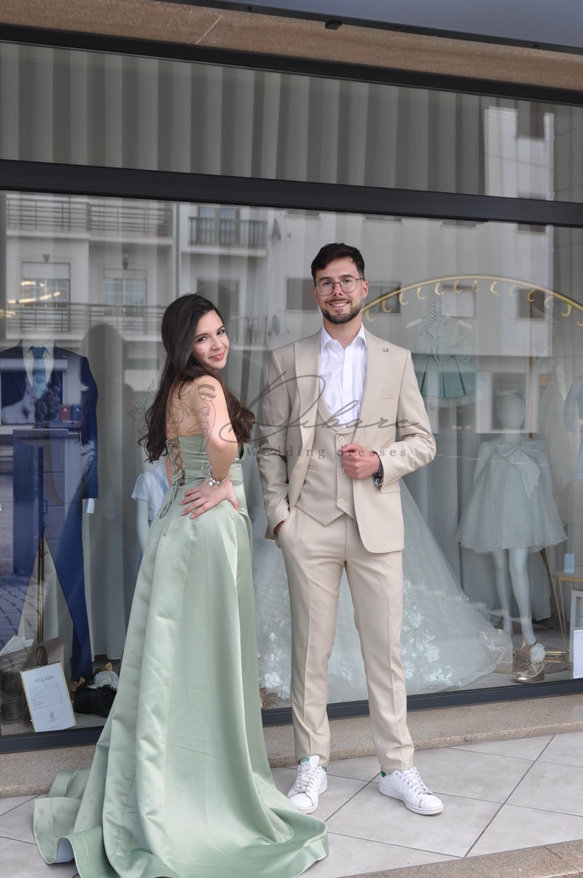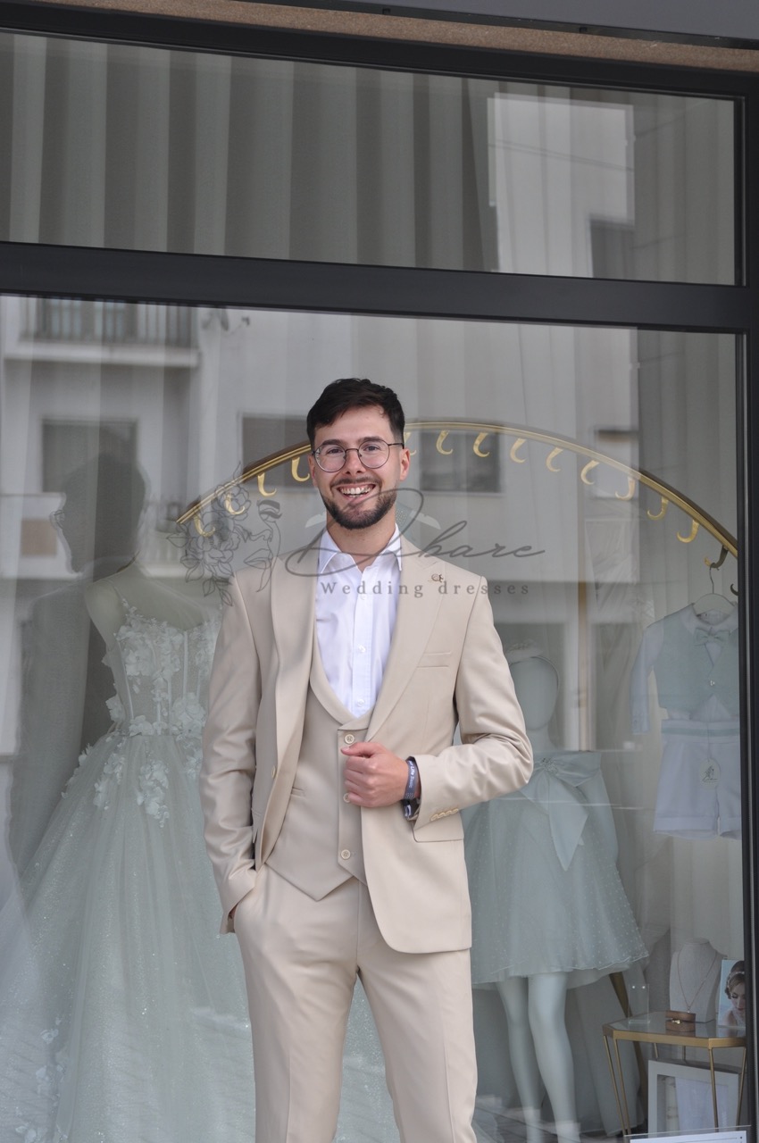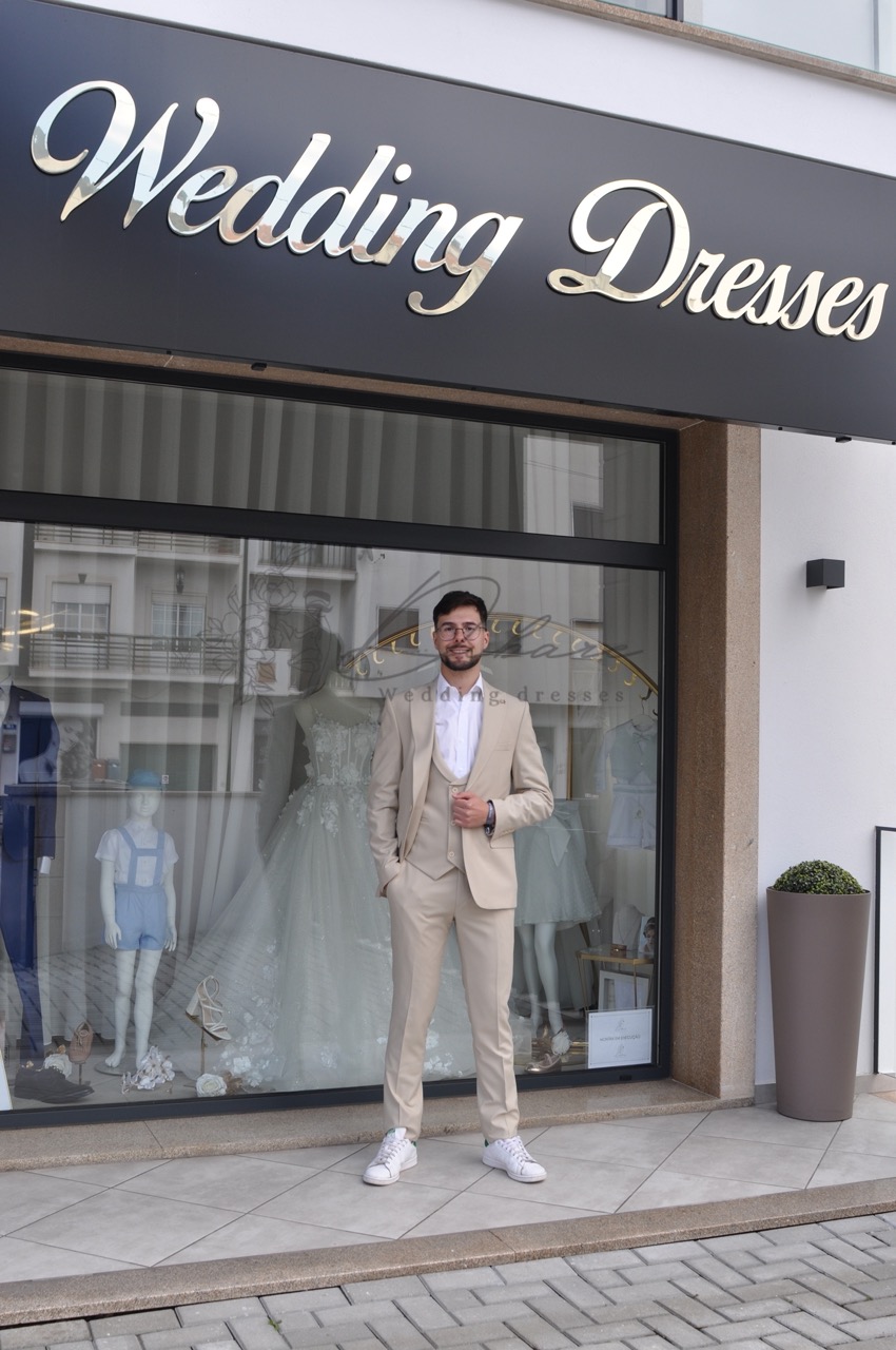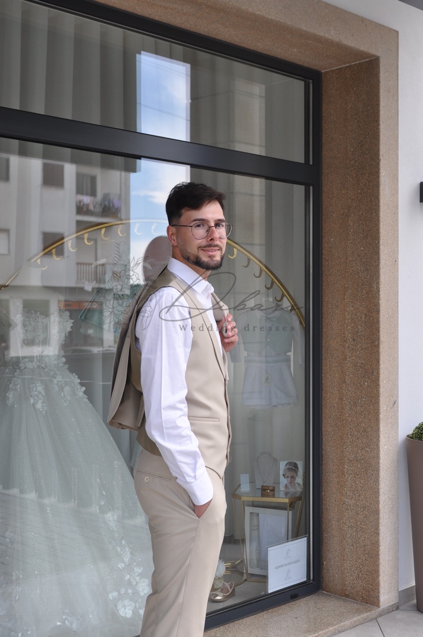 Apresentamos um fato de corte moderno e slim-fit, na tonalidade bege clara – a escolha ideal para noivos, convidados ou qualquer evento que exija sofisticação sem formalidades excessivas. Confeccionado num tecido de excelente caimento, este conjunto de duas peças – blazer e calças – exibe um estilo refinado e fresco. O blazer de lapela clássica e fecho de dois botões assenta perfeitamente na silhueta, enquanto o colete (não visível, mas muitas vezes incluído neste estilo) acrescentaria uma camada extra de distinção. As calças a condizer apresentam um corte ajustado que alonga a figura, mantendo o conforto. A versatilidade é a chave deste fato. Como demonstrado, a combinação com uma camisa branca de colarinho aberto e sapatos de ténis brancos resulta num look contemporâneo e casual-chic. Para um evento mais formal, basta trocar os ténis por uns sapatos de couro e adicionar uma gravata ou laço.