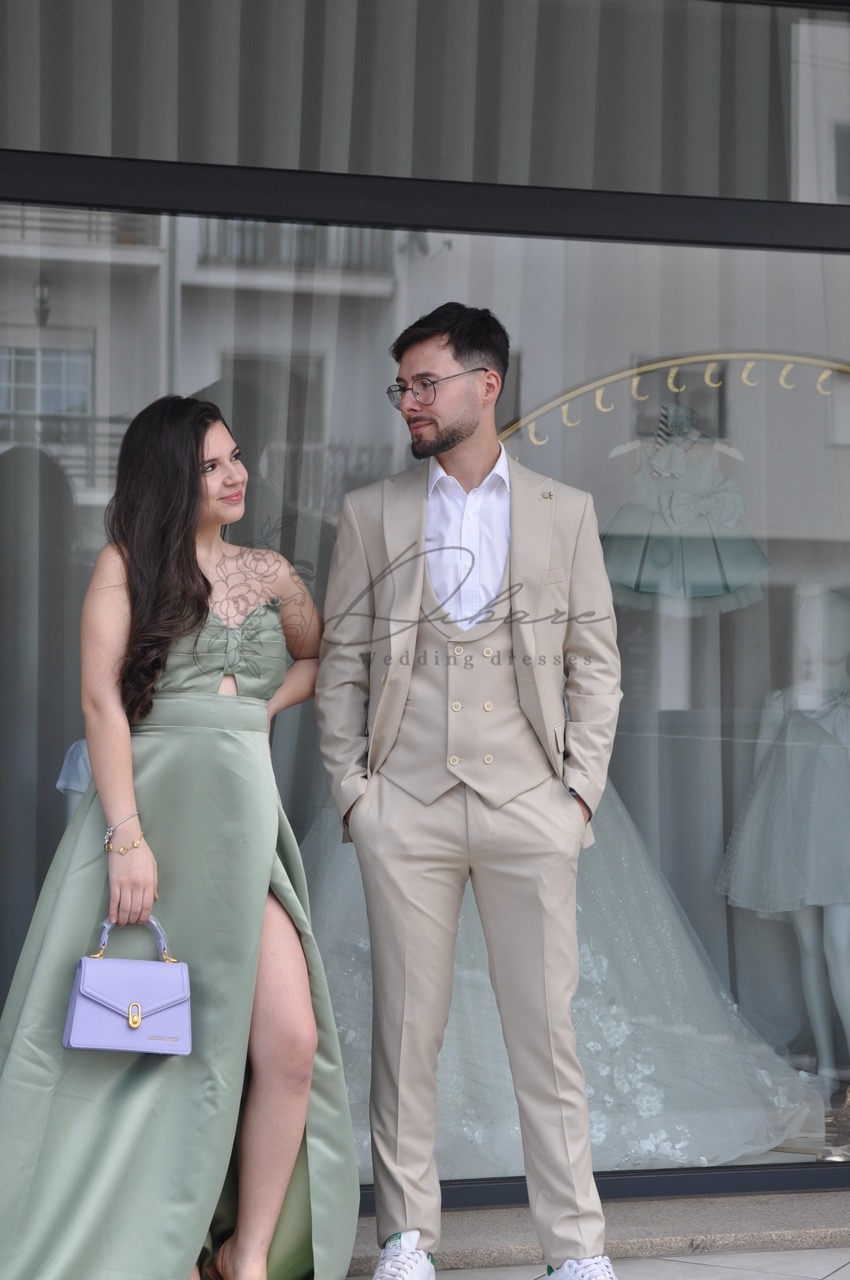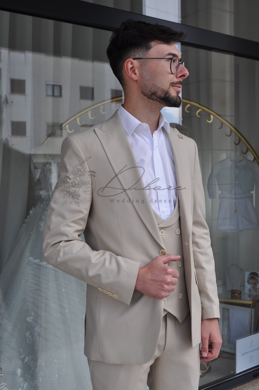 Este fato bege é a personificação do estilo sem esforço, garantindo que se destaque com elegância e conforto em qualquer celebração à luz do dia ou em climas mais quentes.