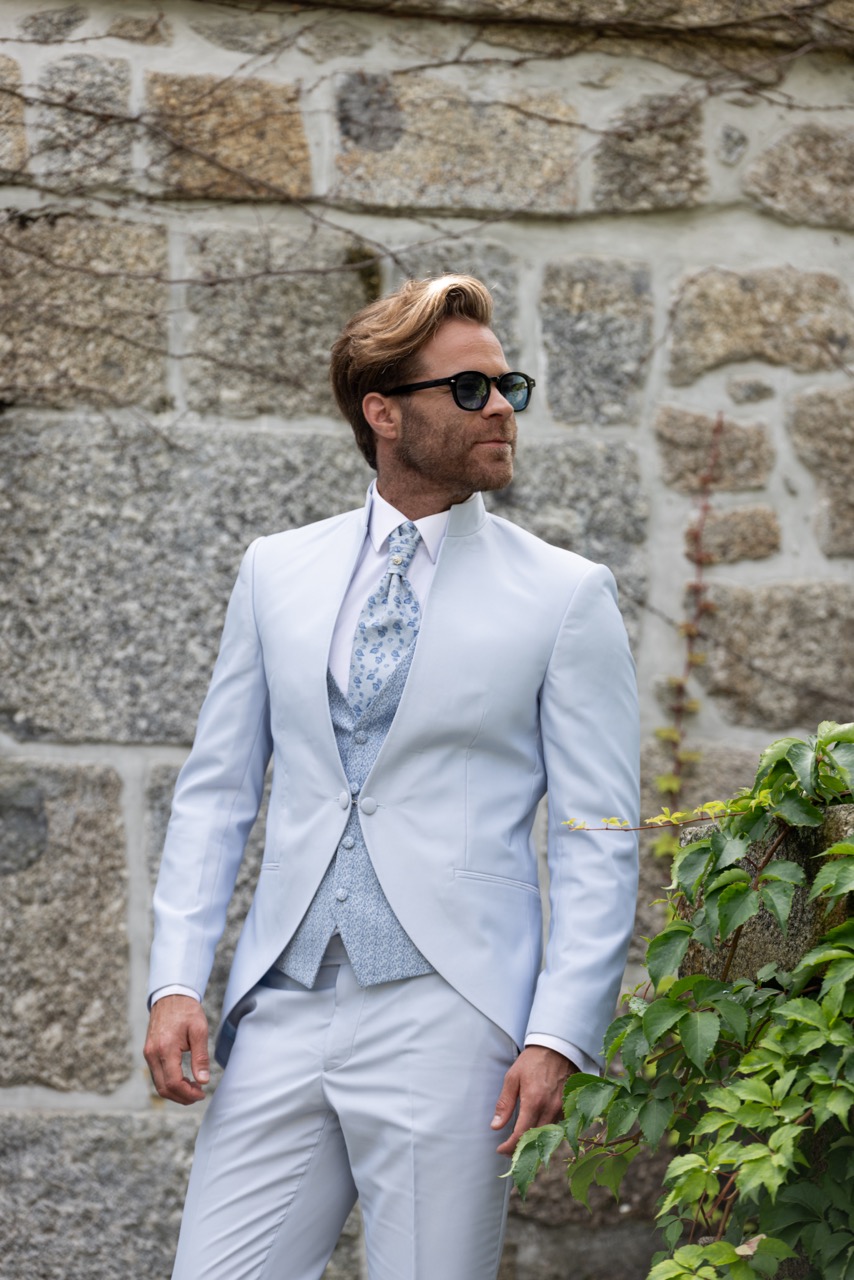 Este fato de três peças em tom bege areia é a definição de sofisticação natural, ideal para eventos diurnos, casamentos no campo ou celebrações que exigem um equilíbrio entre o clássico e o descontraído. O conjunto é composto por um casaco de corte estruturado e contemporâneo, que se ajusta perfeitamente ao corpo, e um colete coordenado num tom creme suave, que acrescenta uma camada extra de requinte e permite manter a elegância mesmo sem o casaco. As calças seguem uma linha slim, com um vinco impecável que alonga a silhueta, garantindo um visual polido de cima a baixo.