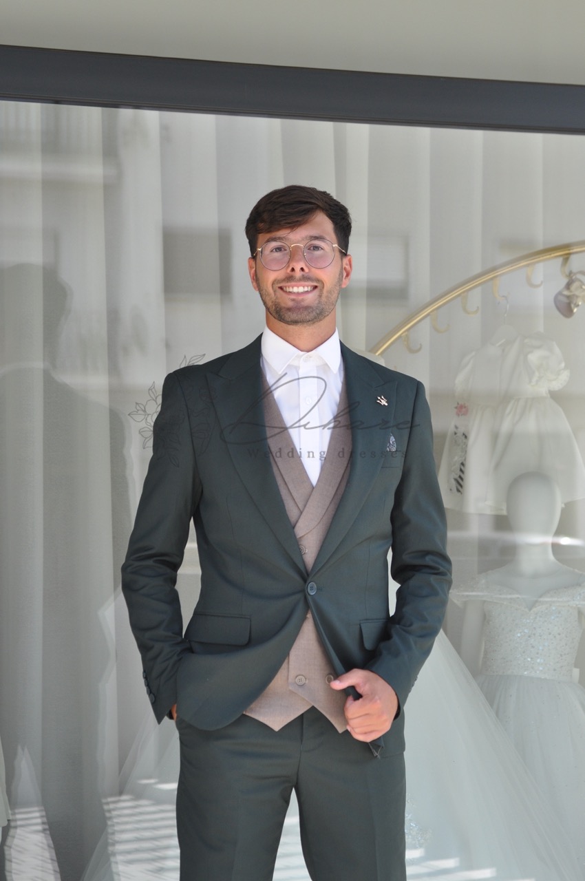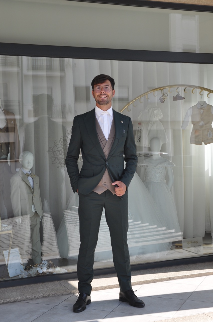 Este sofisticado fato de três peças em tom verde-garrafa escuro é a personificação da elegância contemporânea para o homem que valoriza o detalhe e o corte clássico com um toque moderno. Ideal para casamentos, galas ou eventos de prestígio, este conjunto oferece uma silhueta estruturada e distinta. O casaco, de corte slim fit, apresenta lapelas de entalhe clássicas e um fecho de botão único que acentua a postura. O grande diferencial deste conjunto é o colete contrastante num tom champanhe, que quebra a monocromia com extrema classe, permitindo um visual impecável mesmo quando o casaco é retirado. As calças seguem a linha ajustada do casaco, garantindo uma continuidade visual que alonga a figura. Combinado com uma camisa branca de gola estruturada, este fato equilibra perfeitamente a sobriedade do verde profundo com o brilho discreto do colete.