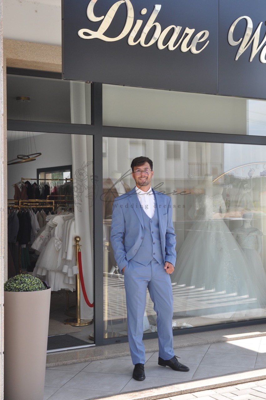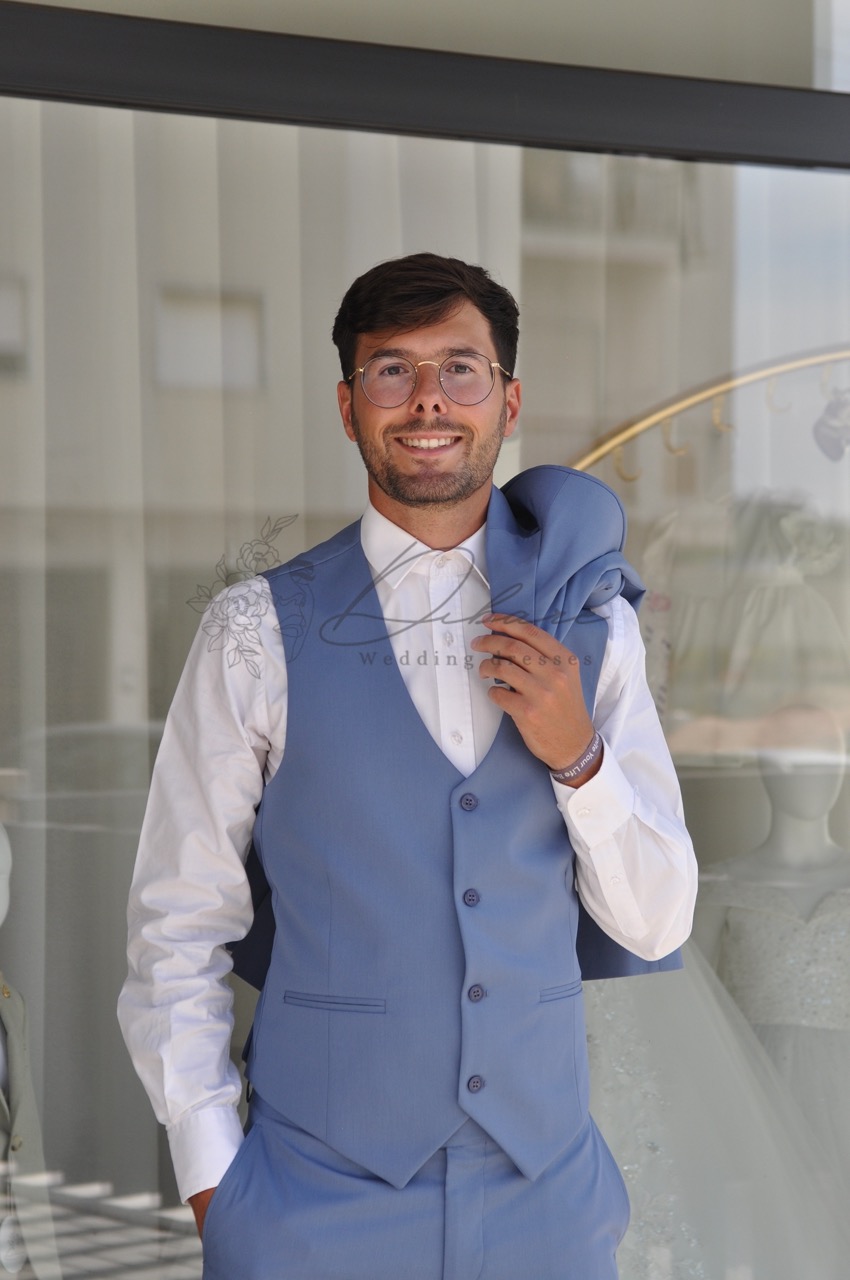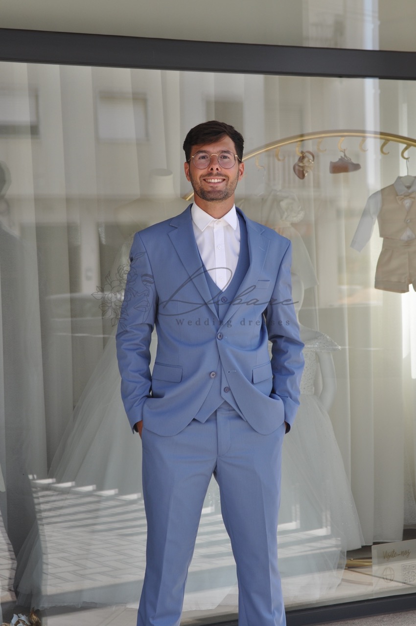 Este fato de cerimónia masculino em azul claro é a escolha audaz e vibrante para o homem que deseja destacar-se com modernidade e classe. Ideal para casamentos, eventos de gala ou celebrações especiais, este conjunto de três peças equilibra perfeitamente a tradição do corte clássico com uma cor contemporânea e cheia de personalidade. O blazer de corte slim possui lapelas de entalhe elegantes e um ajuste preciso que realça a estrutura dos ombros e a silhueta masculina. O colete coordenado e as calças de corte ajustado completam o visual, oferecendo uma estética polida e integrada. A tonalidade azul confere uma luminosidade única ao conjunto, tornando-o especialmente impactante em eventos ao ar livre ou sob luz natural. Combinado com uma camisa branca imaculada e um laço ou gravata em tons claros, este fato garante um visual memorável e extremamente sofisticado
