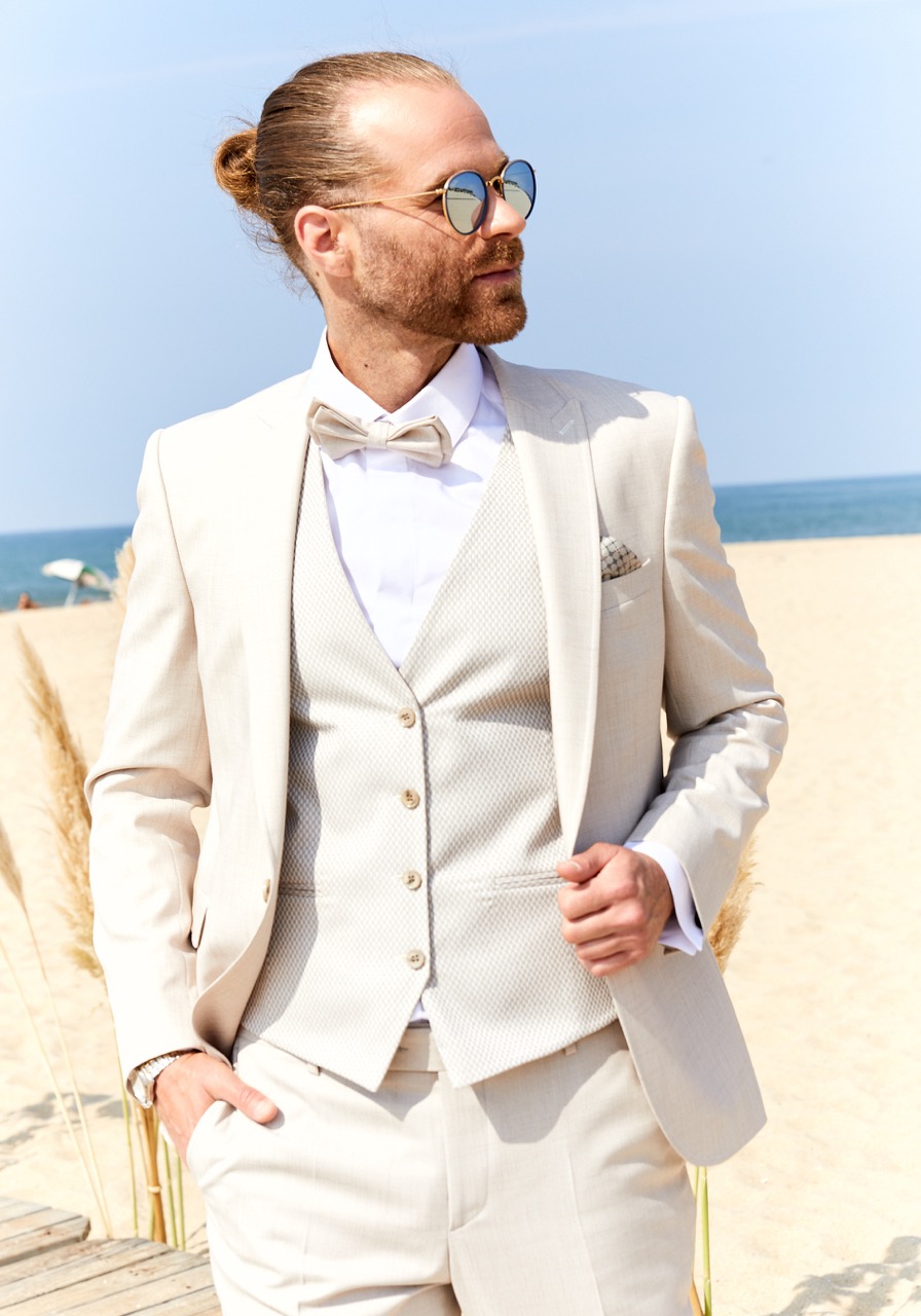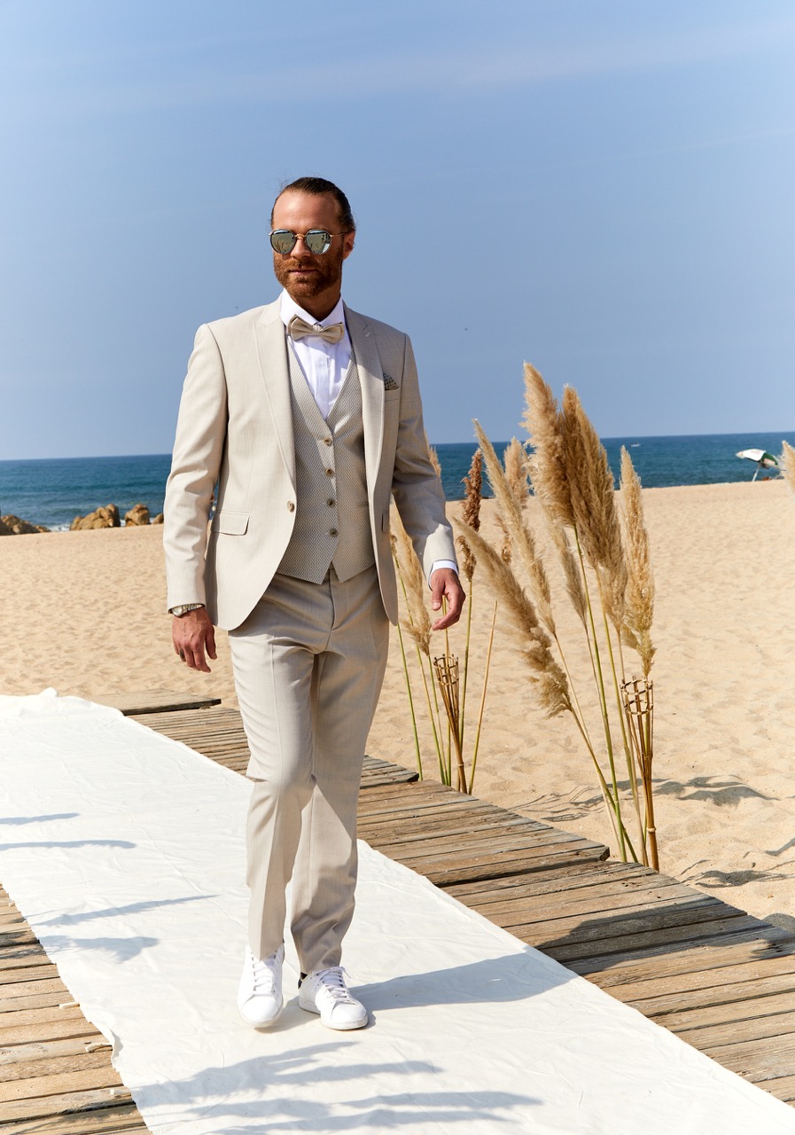 Este fato de cinco peças em tom bege areia é a personificação do estilo casual chique, ideal para casamentos na praia, cerimónias ao ar livre ou eventos estivais que pedem frescura sem abdicar do rigor. A cor clara e luminosa oferece uma estética leve e descontraída, perfeitamente integrada em cenários naturais. O conjunto apresenta um corte slim fit que desenha uma silhueta moderna e elegante. O casaco de dois botões, com lapelas clássicas de entalhe, transmite uma sofisticação intemporal, enquanto os bolsos laterais com paleta acrescentam um detalhe funcional e tradicional. O colete de cinco botões é o elemento que eleva este fato, permitindo que o utilizador mantenha uma aparência estruturada e formal mesmo que opte por retirar o casaco durante a celebração. Para completar o visual, a gravata borboleta no mesmo tom cria uma harmonia cromática perfeita, reforçando o caráter festivo do traje.