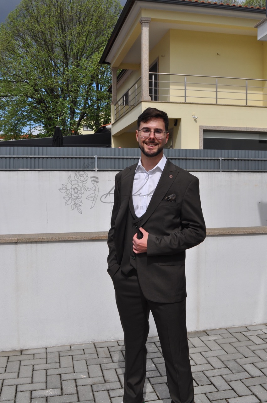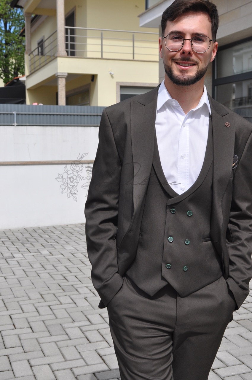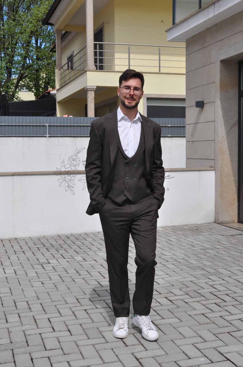 Este fato de três peças exala sofisticação contemporânea e um toque de descontração moderna. Confeccionado numa rica e versátil tonalidade que se assemelha a um verde-azeitona profundo ou castanho-terra escuro, esta peça é a escolha ideal para o homem que valoriza o estilo clássico sem sacrificar a individualidade. O conjunto inclui um casaco estruturado com lapelas clássicas, um colete ajustado que confere uma camada extra de formalidade e requinte, e umas calças de corte slim que mantêm a silhueta elegante e atual. A conjugação da camisa branca imaculada cria um contraste nítido e intemporal que realça a cor do fato. O detalhe que realmente eleva este conjunto é o seu styling inteligente: emparelhado com ténis brancos casuais, este fato transita sem esforço do formal para o casual. É perfeito para casamentos de dia, eventos empresariais modernos, ou qualquer ocasião onde se procure uma imagem polida e, ao mesmo tempo, acessível.