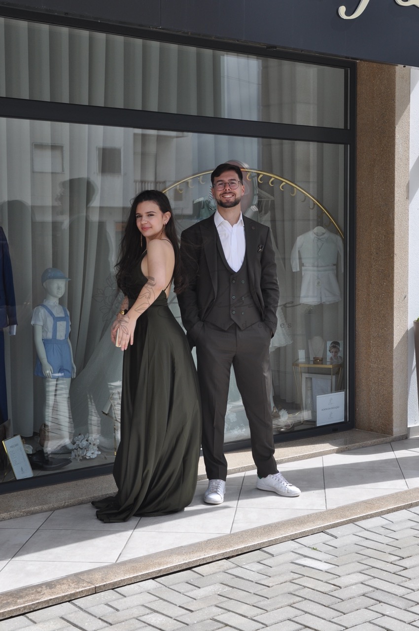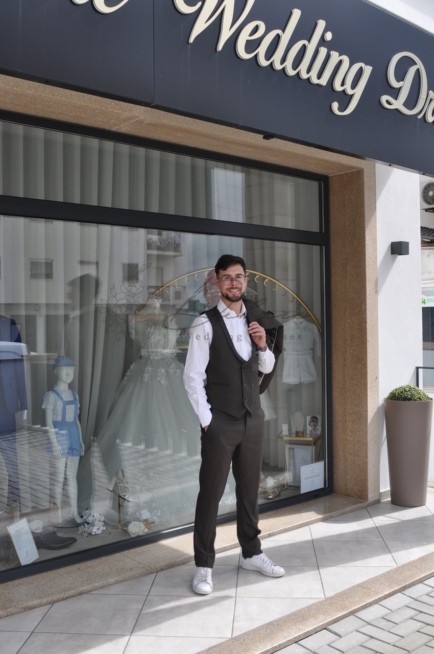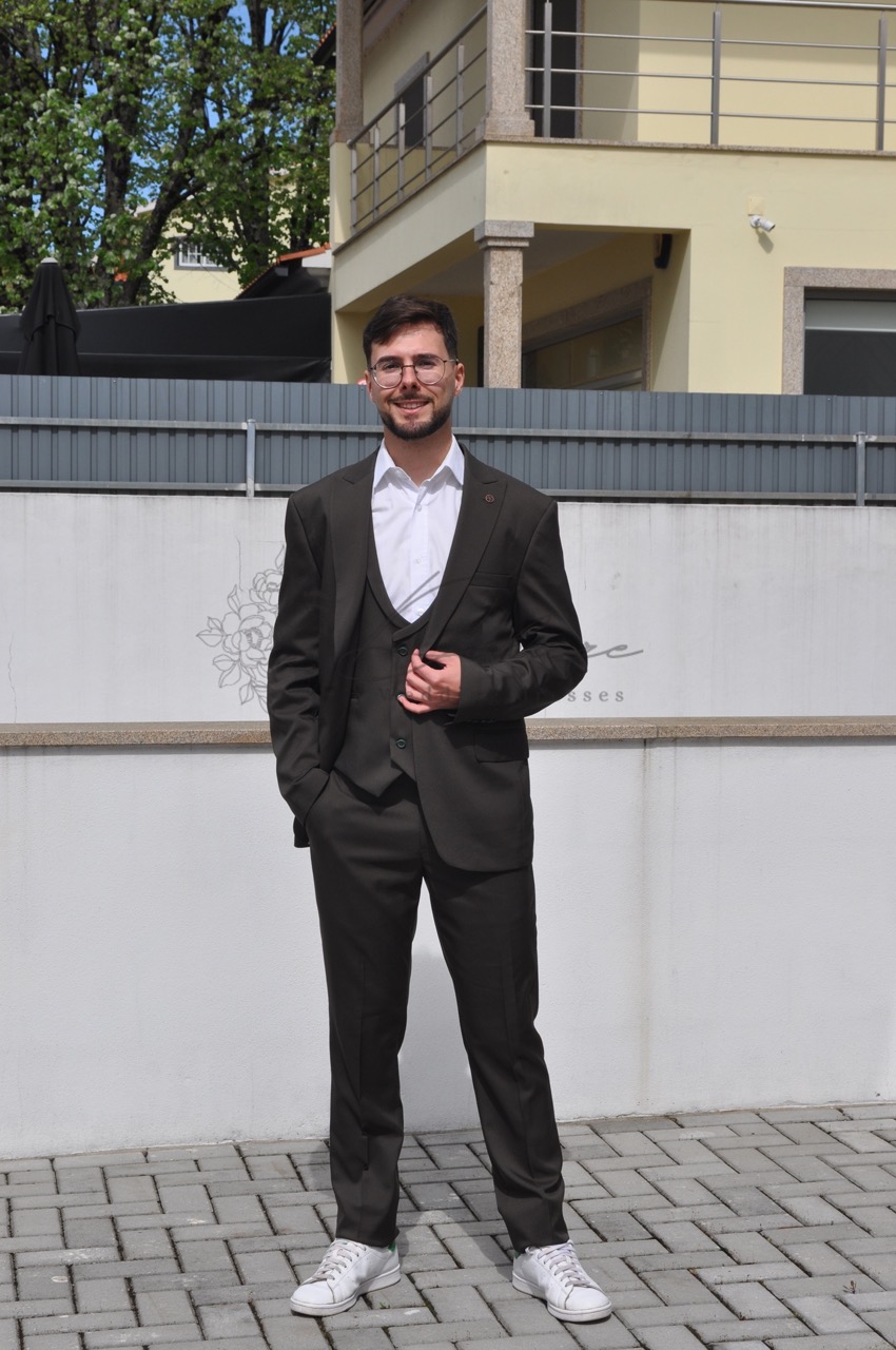 Este fato de três peças exala sofisticação contemporânea e um toque de descontração moderna. Confeccionado numa rica e versátil tonalidade que se assemelha a um verde-azeitona profundo ou castanho-terra escuro, esta peça é a escolha ideal para o homem que valoriza o estilo clássico sem sacrificar a individualidade. O conjunto inclui um casaco estruturado com lapelas clássicas, um colete ajustado que confere uma camada extra de formalidade e requinte, e umas calças de corte slim que mantêm a silhueta elegante e atual. A conjugação da camisa branca imaculada cria um contraste nítido e intemporal que realça a cor do fato. O detalhe que realmente eleva este conjunto é o seu styling inteligente: emparelhado com ténis brancos casuais, este fato transita sem esforço do formal para o casual. É perfeito para casamentos de dia, eventos empresariais modernos, ou qualquer ocasião onde se procure uma imagem polida e, ao mesmo tempo, acessível.