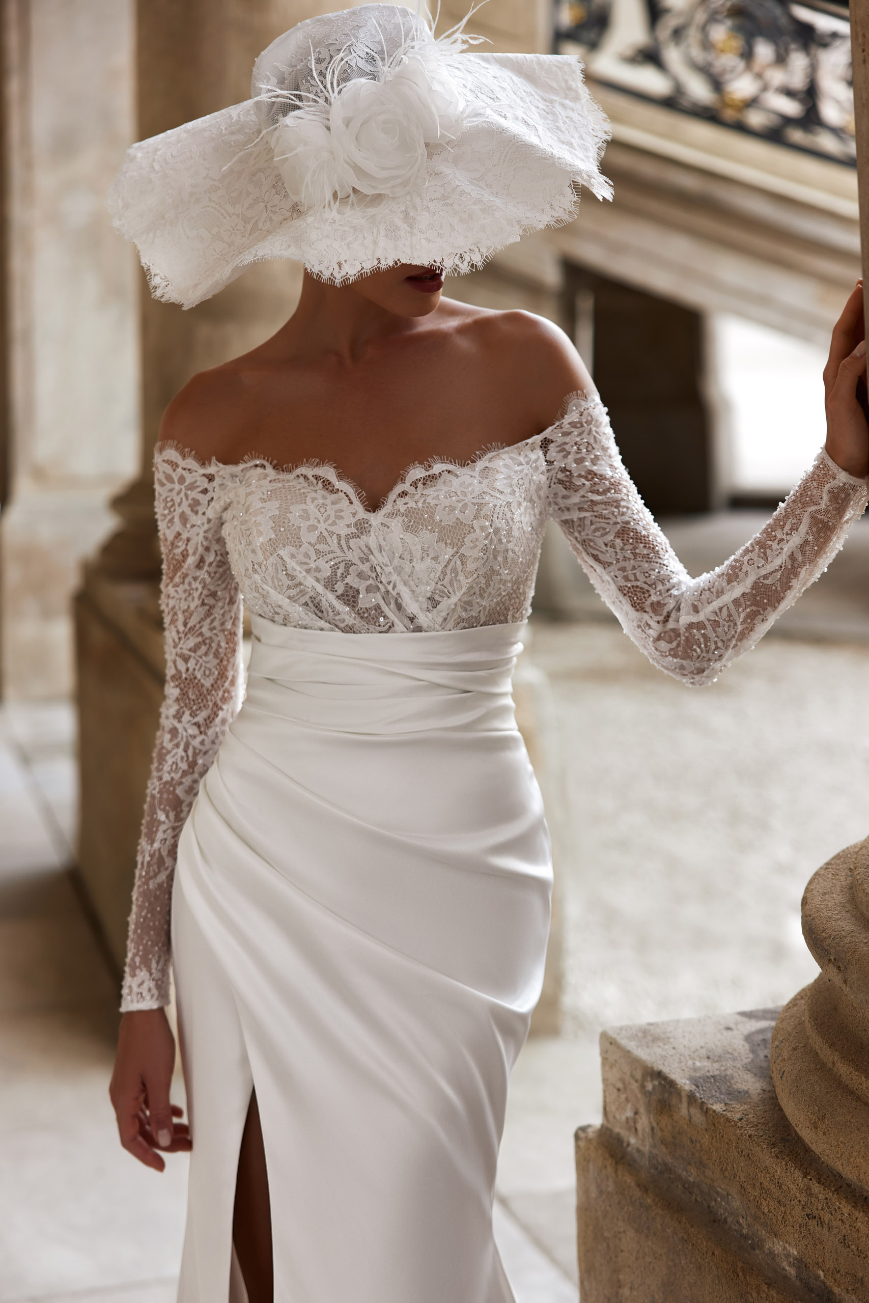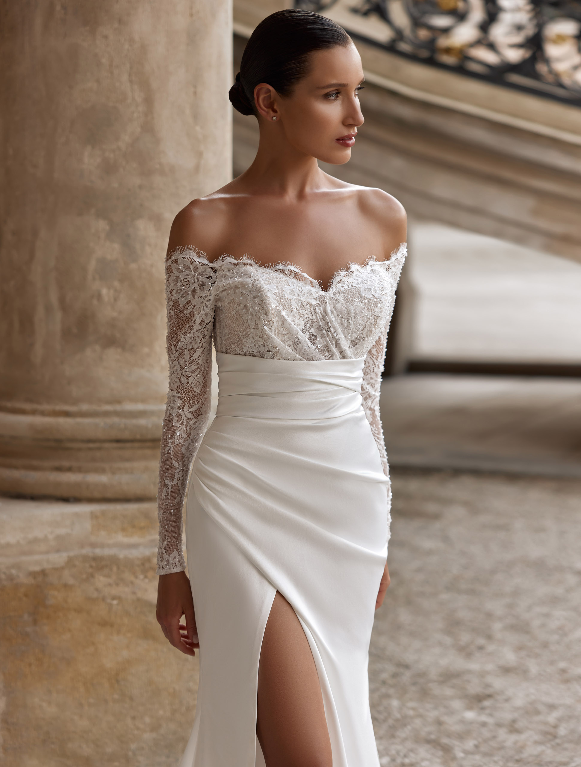 O modelo J-1135 é uma celebração da delicadeza e do romantismo. O corpete estruturado com decote coração é ricamente adornado com aplicações de renda floral em relevo, que conferem uma textura orgânica e luxuosa ao design. Estilo sereia, com racha e uma cauda de 50 cm!