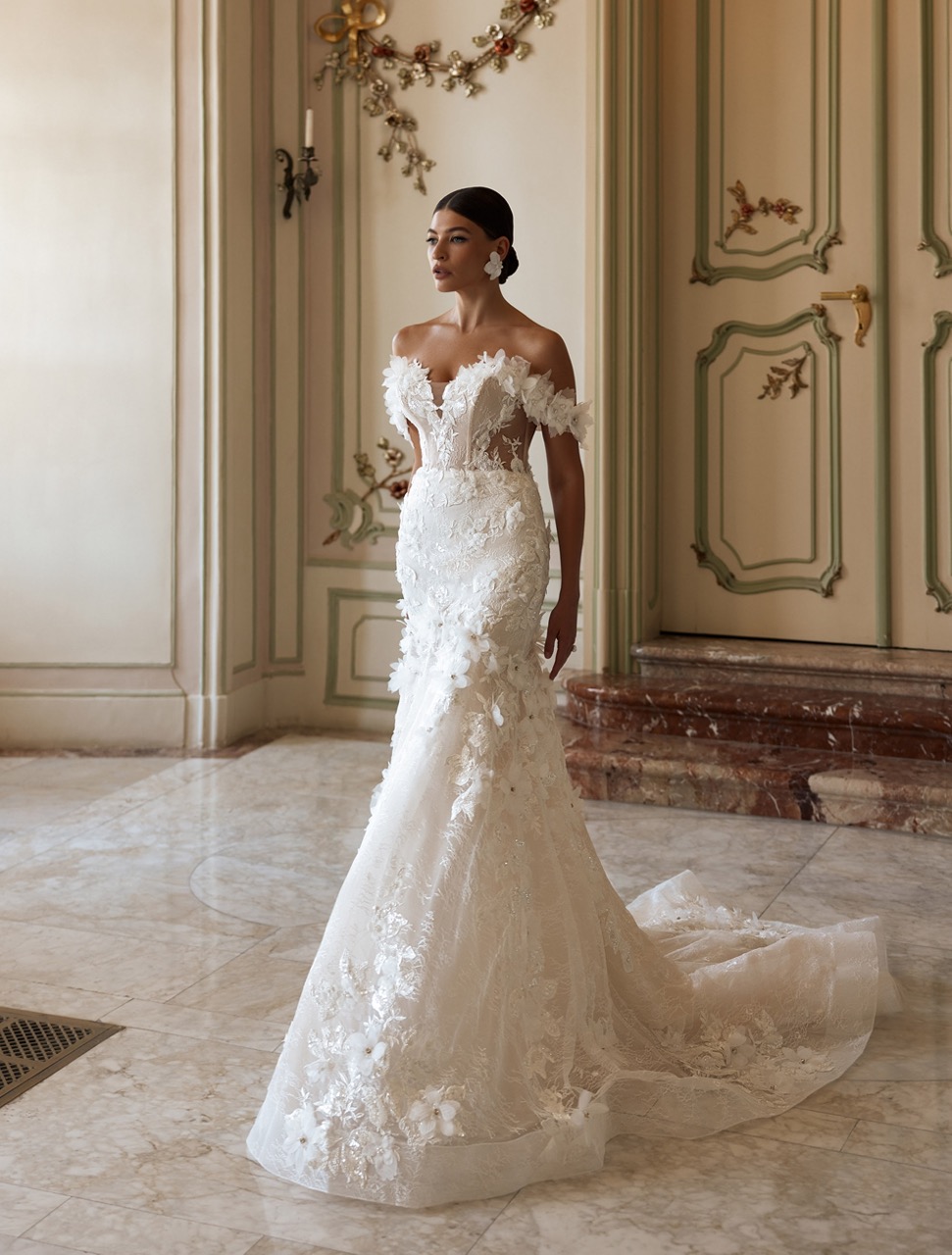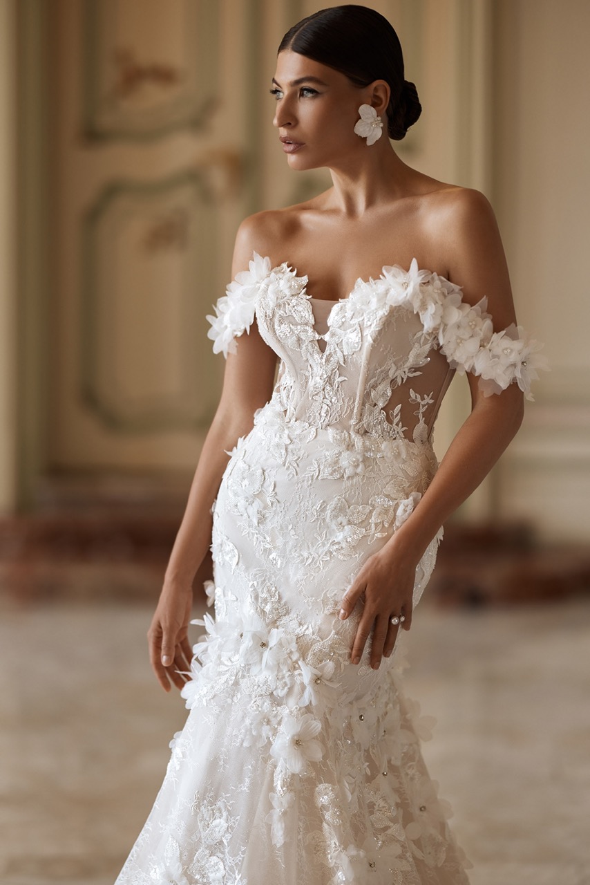 O Vestido Lily é uma peça sereia requintada que combina sofisticação com um estilo moderno. O corpete semitransparente é adornado com renda Chantilly delicada, complementada por renda 3D volumosa e bordados com pérolas e lantejoulas. A silhueta ajustada realça a figura, tornando-o a escolha perfeita para um dia inesquecível.