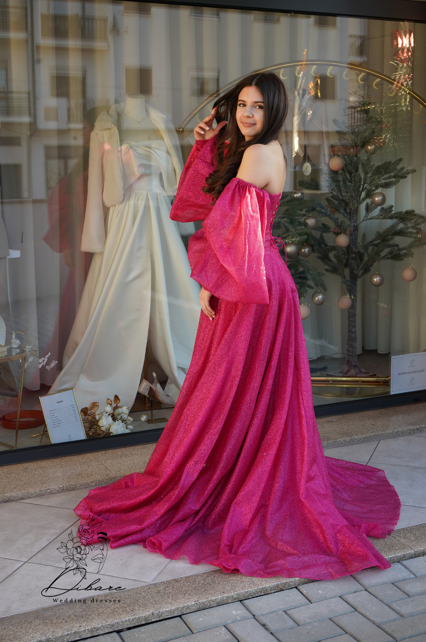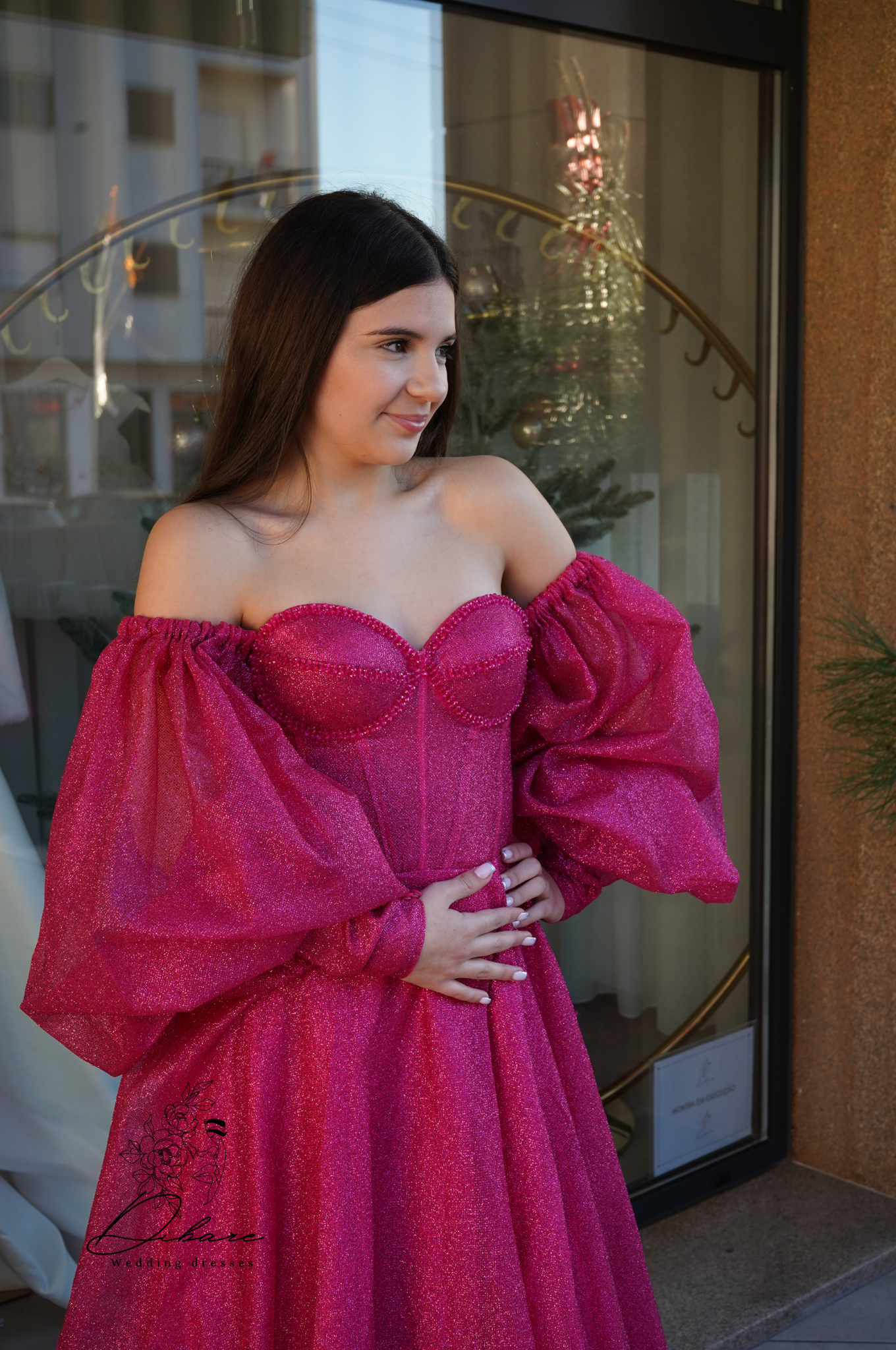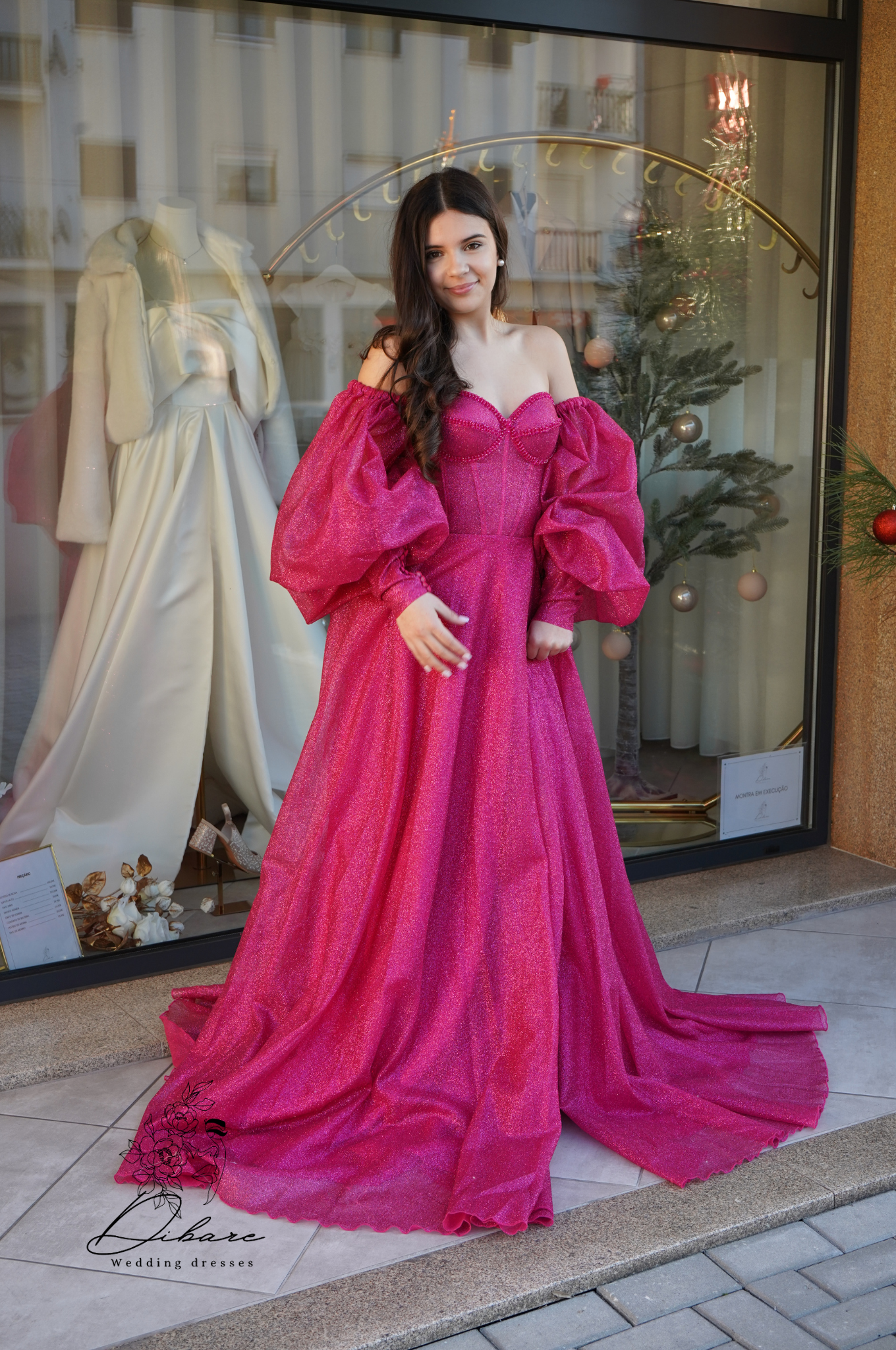 Deixe-se envolver pelo glamour com este deslumbrante vestido de noite, uma peça que combina audácia moderna com uma silhueta clássica e romântica. Confeccionado num vibrante e cativante tom de fúcsia intenso, este vestido é a escolha perfeita para quem deseja causar impacto e irradiar confiança em qualquer evento de gala, baile ou festa sofisticada. O corpete estruturado apresenta um elegante decote coração, com um corte de ombros descaídos que realça a feminilidade com subtileza. O verdadeiro destaque reside nas suas magníficas mangas bufantes com volume exagerado, conferindo um toque dramático e uma aura de conto de fadas à peça. A saia, esvoaçante e de grande amplitude, cai numa cascata de tecido leve, garantindo um movimento gracioso a cada passo. O volume e o tecido fluido da saia criam uma silhueta de princesa moderna, completando um look inesquecível e luxuoso