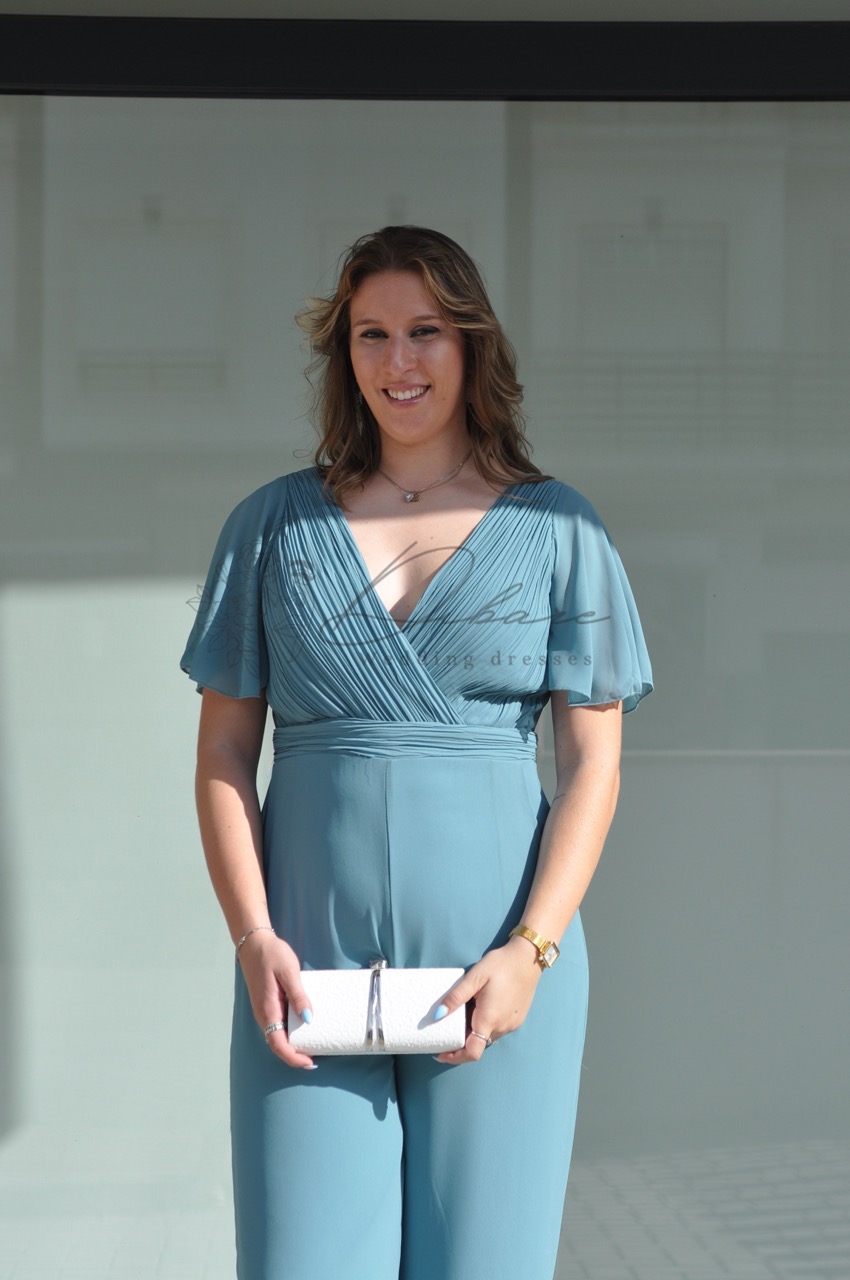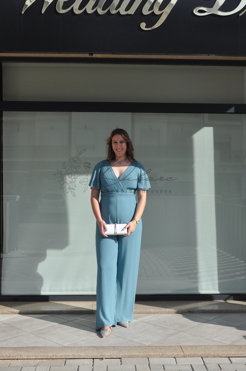 Este macacão longo é a fusão perfeita entre conforto e sofisticação, apresentando-se numa tonalidade verde água suave que transmite serenidade e requinte. Desenhado para eventos de dia ou de tarde, a peça destaca-se pelo seu decote em V transpassado, que valoriza o colo de forma elegante e feminina. As mangas fluidas em estilo sino conferem um toque de leveza e romantismo, enquanto a cintura alta e marcada define a silhueta com suavidade. As calças de corte wide leg proporcionam um movimento gracioso e alongam a figura, garantindo uma presença marcante em qualquer ocasião formal ou festiva. Confeccionado num tecido com excelente caída.