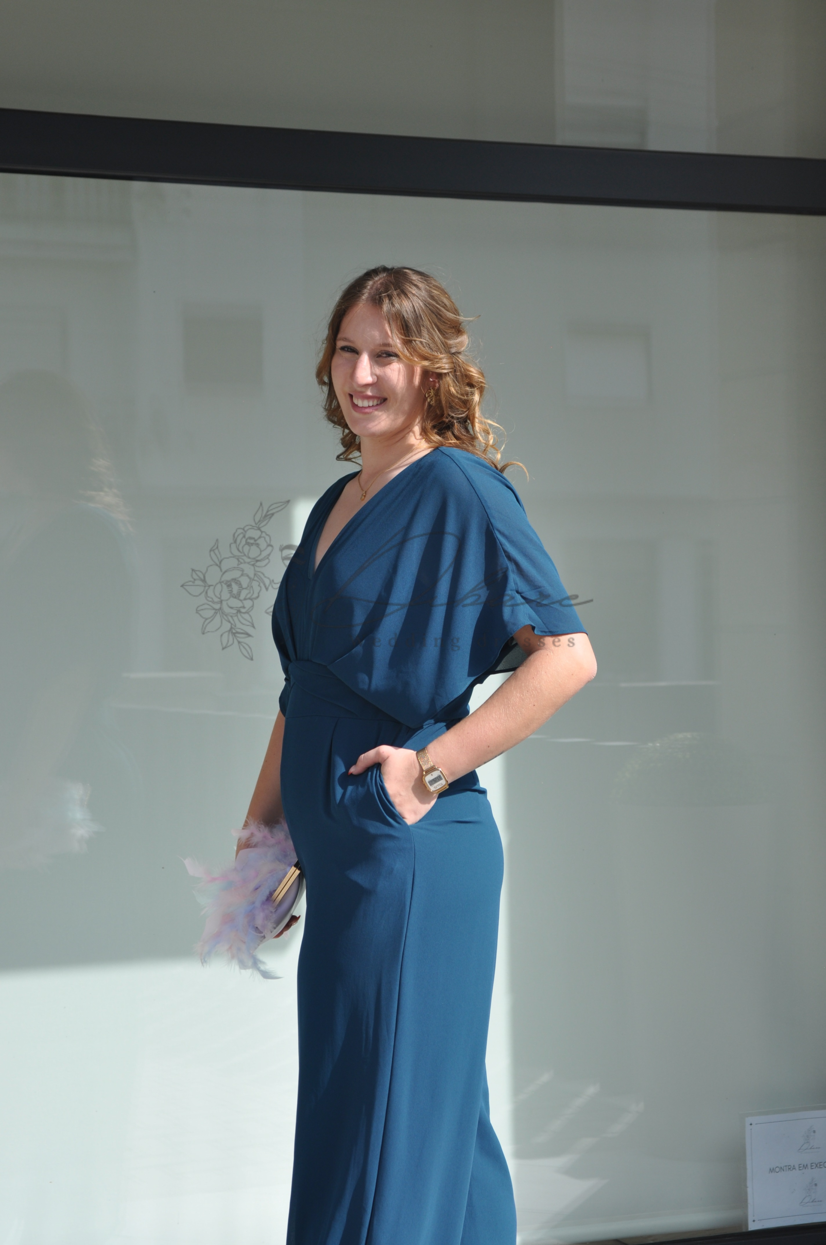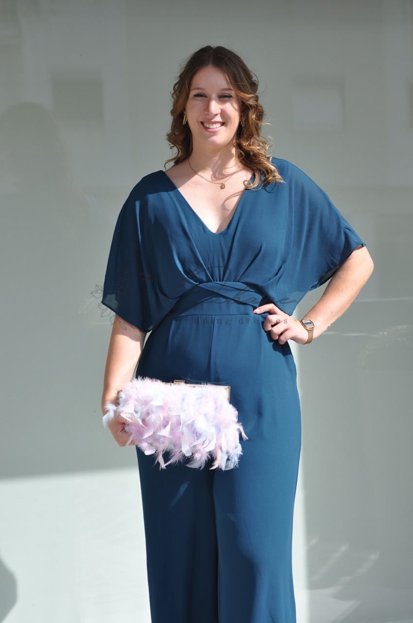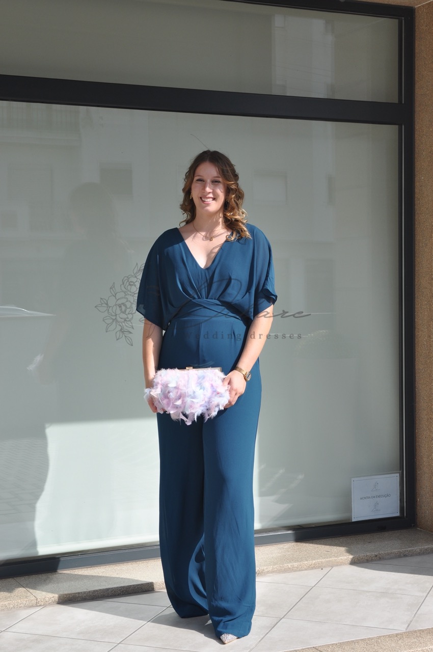 Descubra a combinação perfeita de conforto e glamour com este macacão elegante, ideal para quem procura uma alternativa sofisticada ao vestido tradicional. Apresentado numa tonalidade azul petróleo intensa e rica, este macacão é uma peça de vestuário versátil e moderna, perfeita para casamentos ou eventos formais. O design destaca-se pelo seu corpete fluido com mangas estilo morcego, que proporcionam um movimento leve e uma cobertura elegante. A cintura é marcada com um cinto largo ou faixa envolvente, realçando a silhueta de forma lisonjeira e criando uma separação harmoniosa entre o top e as calças. As calças, de corte reto e amplo, oferecem um caimento alongado e uma sensação de luxo descontraído. O decote em V confere um toque feminino e permite a adição de joalharia.