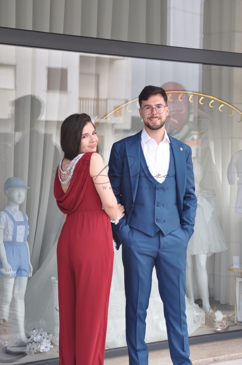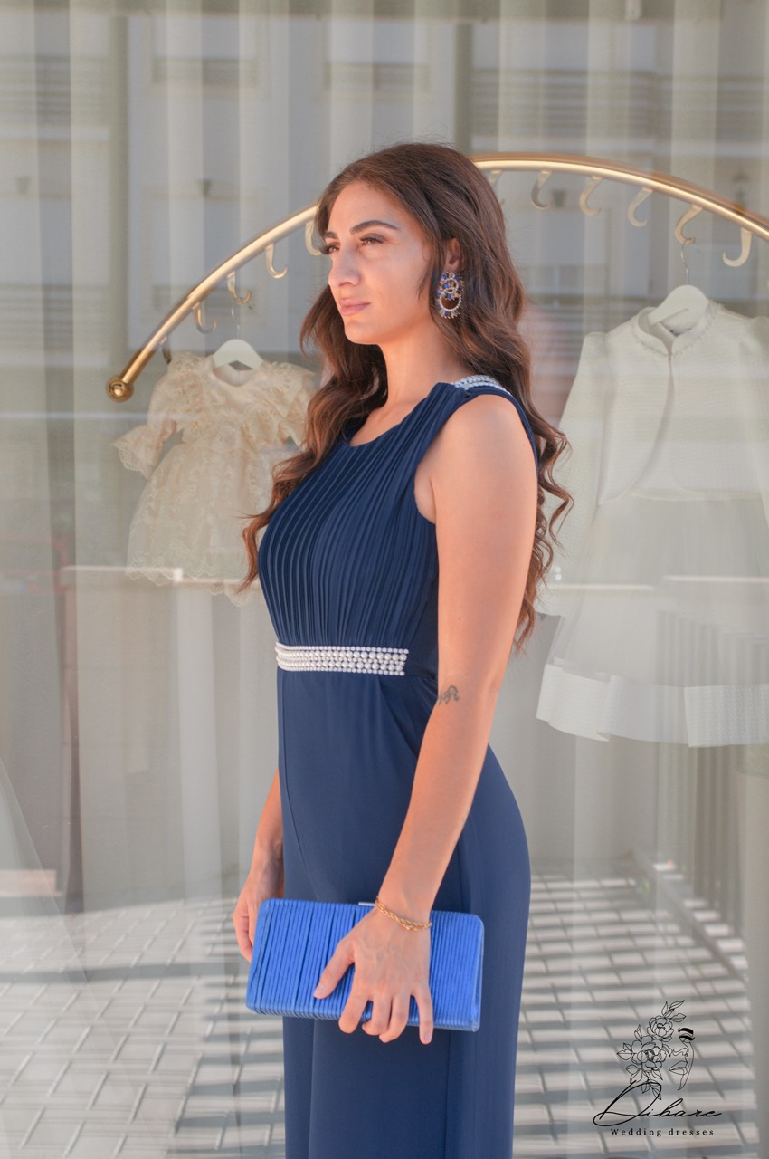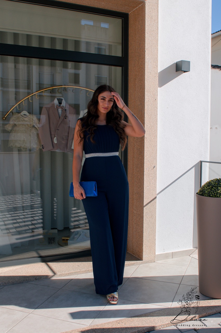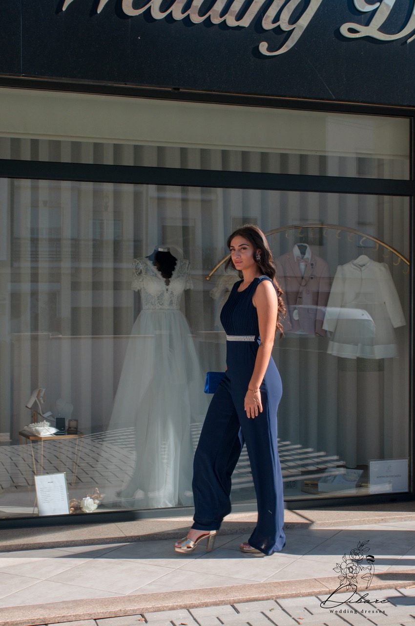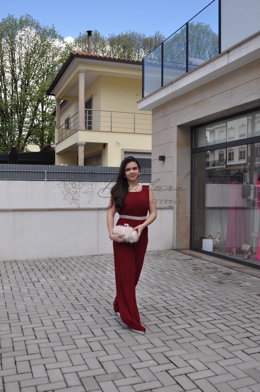 Macacão de Cerimónia com detalhes em pérolas, bolsos e costas parcialmente abertas.