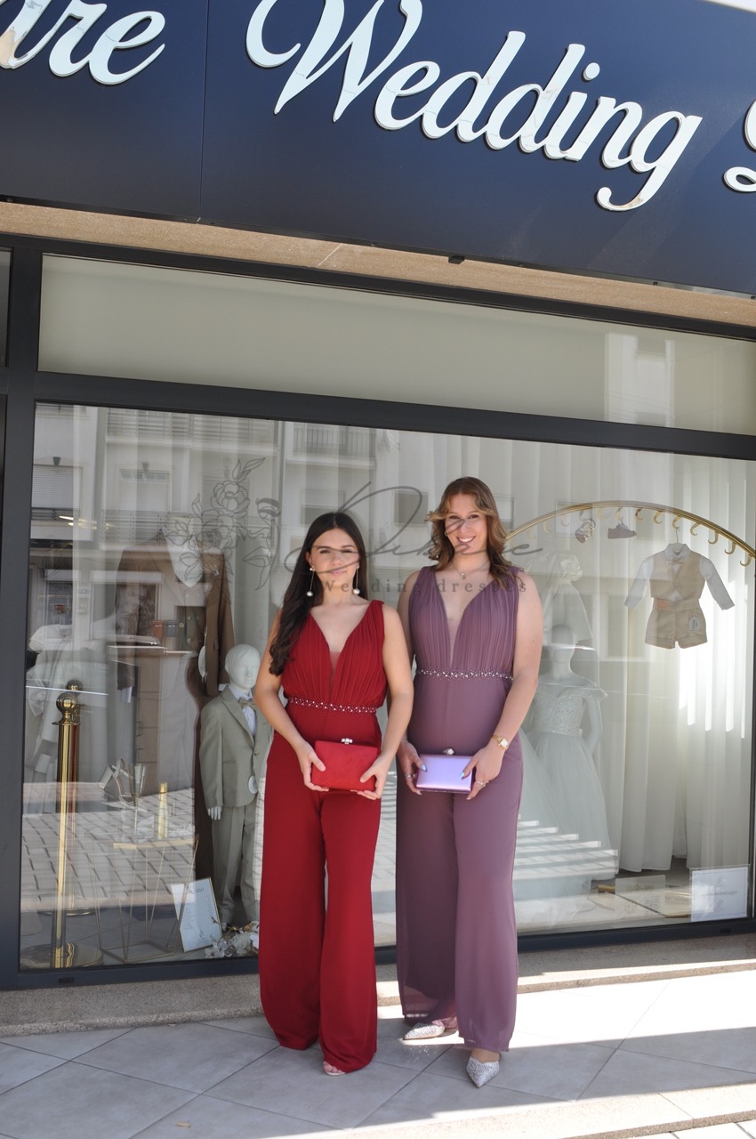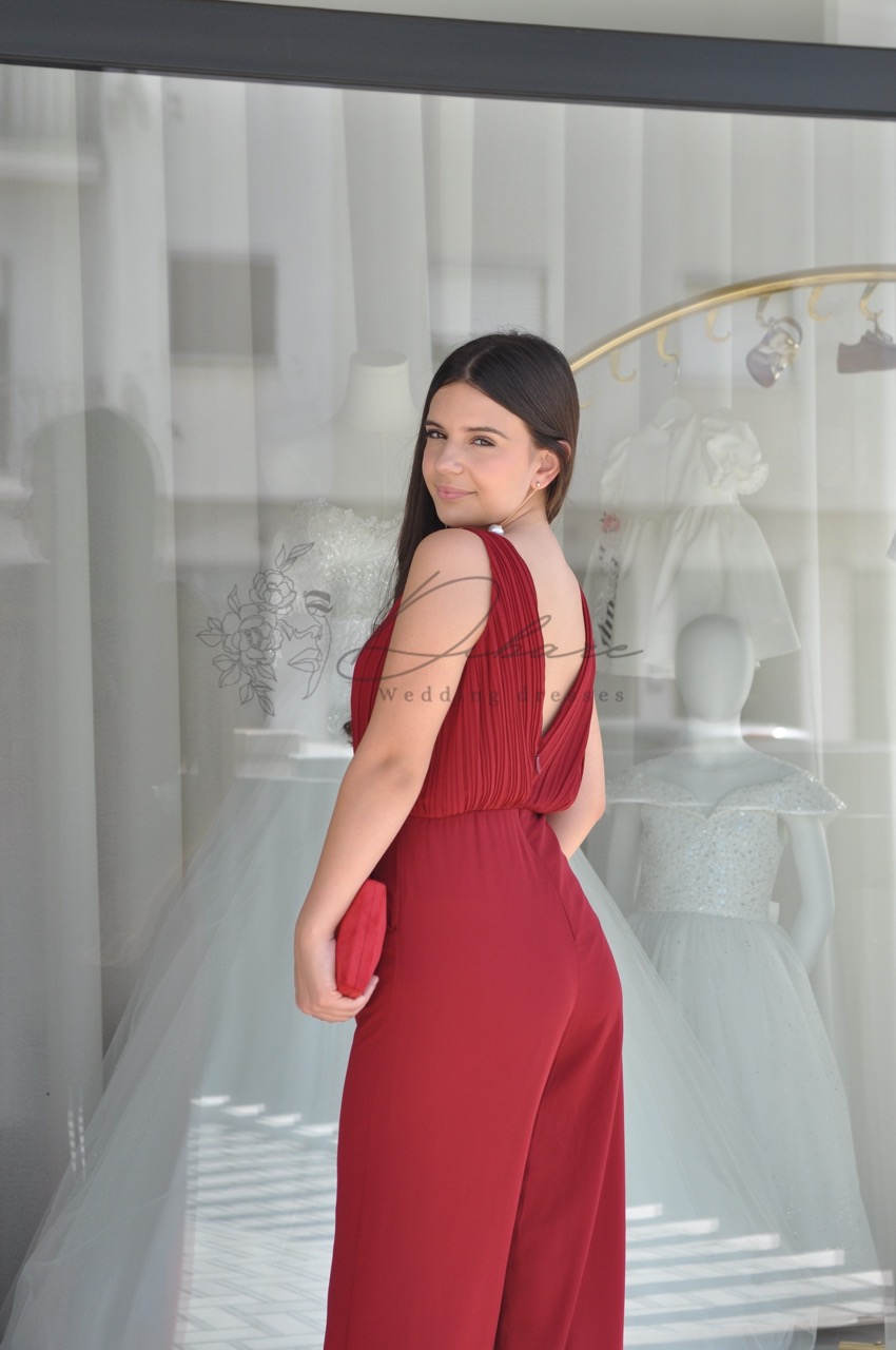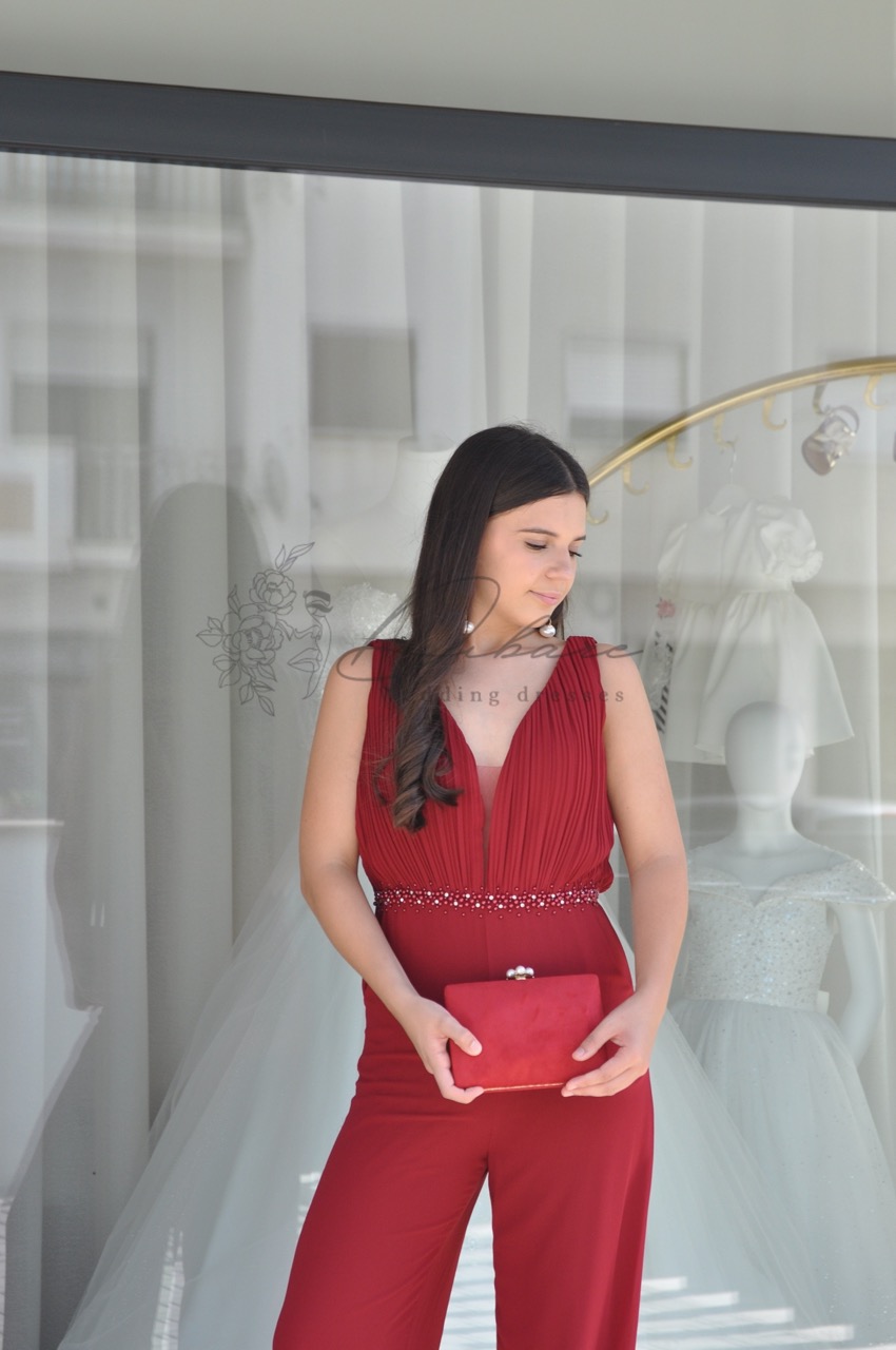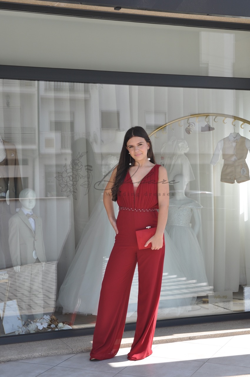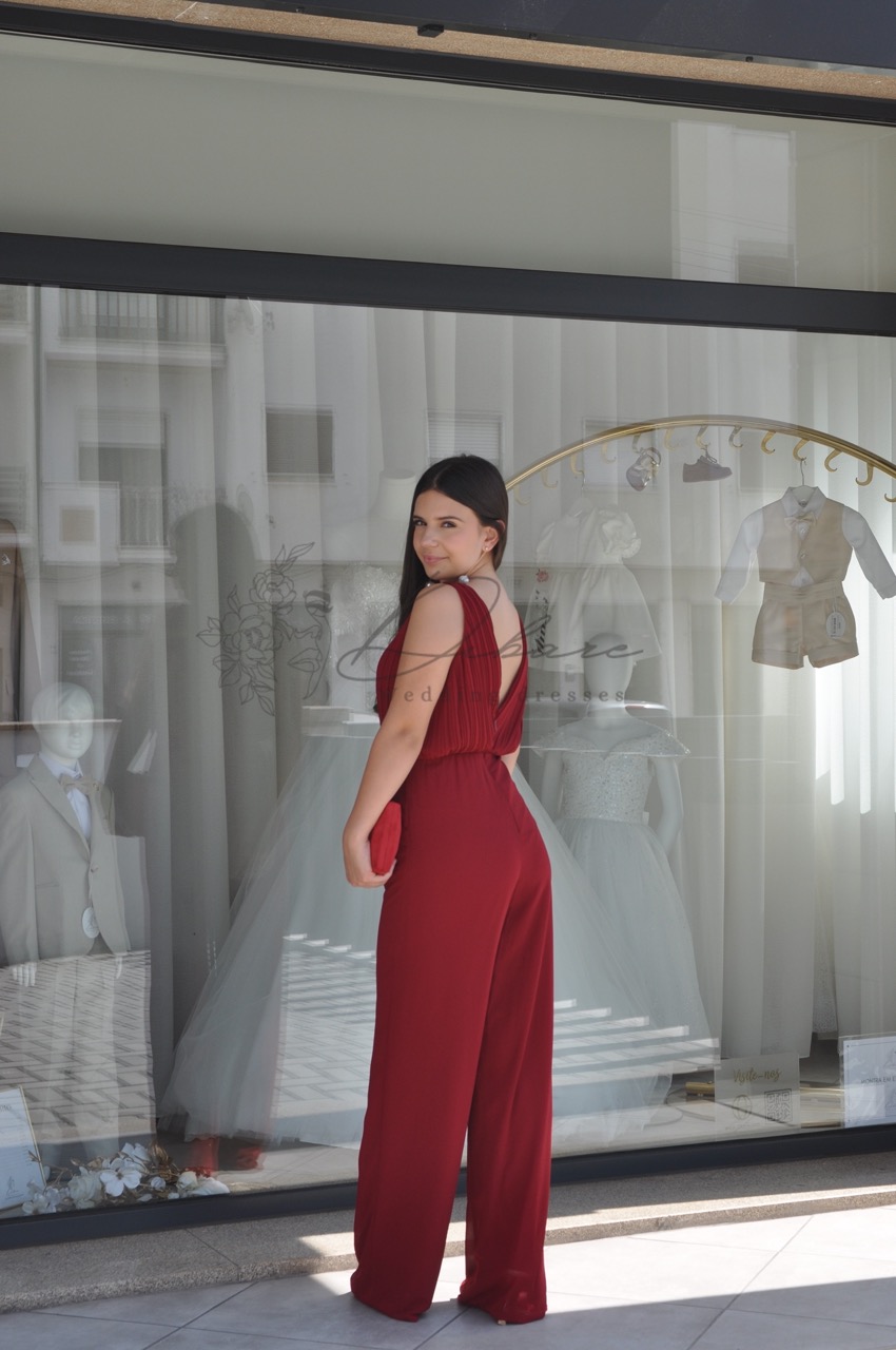 Este elegante macacão de cerimónia num tom vermelho escuro (bordeaux) vibrante é a peça definitiva para quem procura uma alternativa moderna e sofisticada aos vestidos tradicionais. Com um design que combina poder e feminilidade, esta peça destaca-se pelo seu corte impecável e pela fluidez dos materiais. O modelo apresenta um decote em V profundo e estruturado, acompanhado por um corpo drapeado que realça o busto de forma delicada. A cintura é elegantemente definida por um detalhe cintilante, criando uma transição perfeita para as calças de corte largo. Este design de perna ampla não só alonga a silhueta, como também garante um movimento gracioso e máximo conforto durante todo o evento.