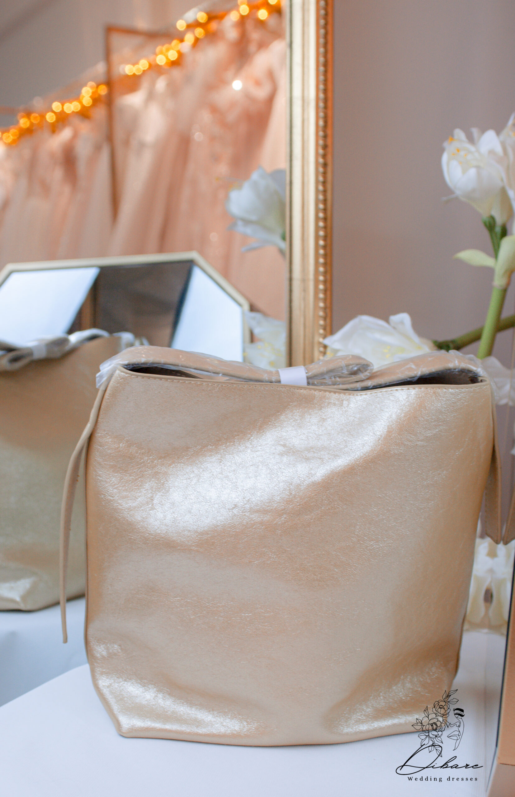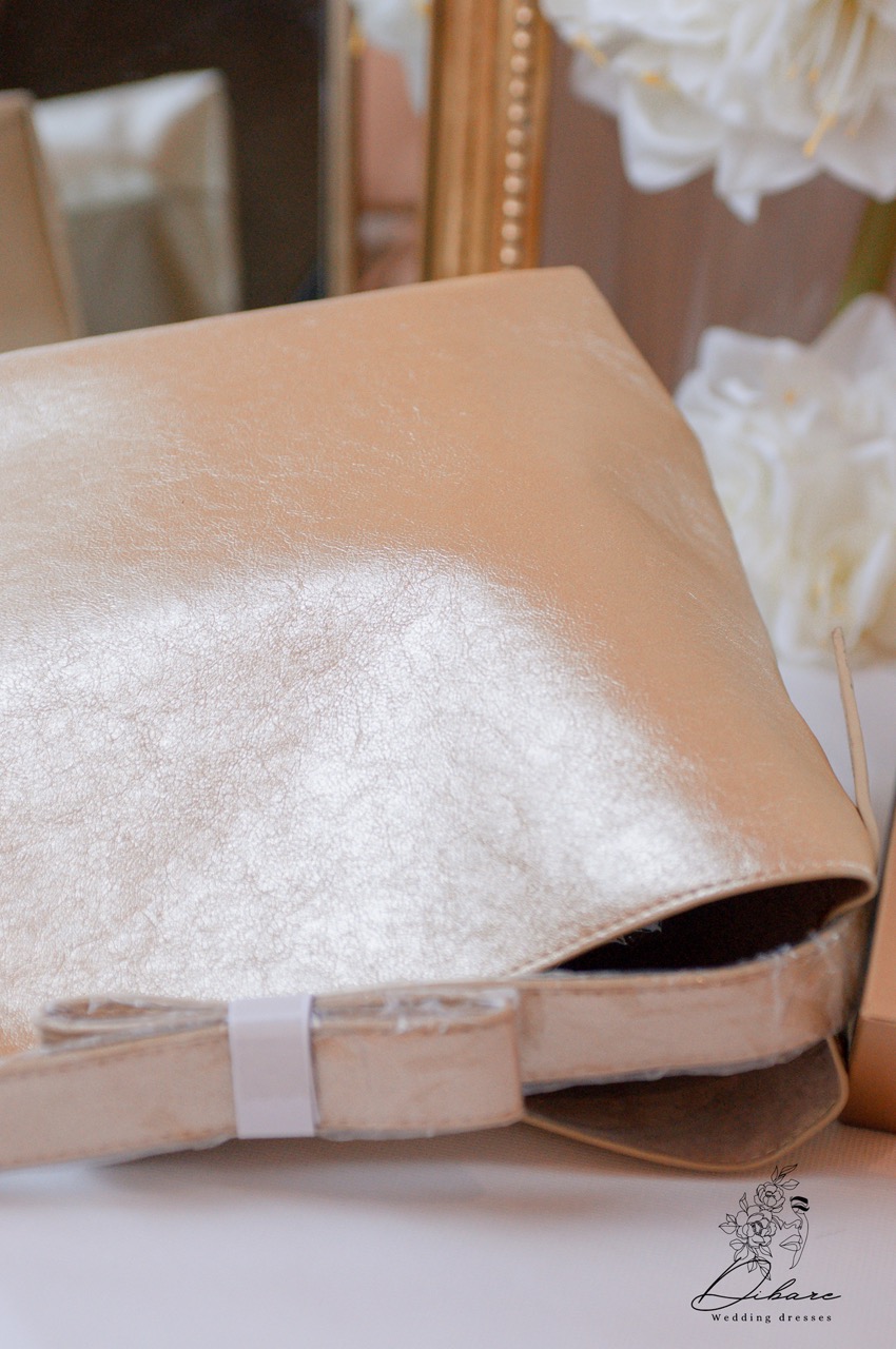 Descubra a elegância minimalista com esta mala estilo, perfeita para adicionar um brilho subtil e sofisticado ao seu look de festa. Confeccionada num tecido de cetim ou seda com um acabamento suavemente brilhante, a mala apresenta um tom dourado pálido ou champanhe, versátil o suficiente para complementar uma vasta gama de cores e vestuário de cerimónia. O seu design simples e estruturado contrasta com a fluidez do material, oferecendo um visual moderno e intemporal. O formato proporciona um espaço interior surpreendente, enquanto o fecho superior com um laço fino em tecido (possivelmente branco ou do mesmo tom) adiciona um toque final delicado e feminino.