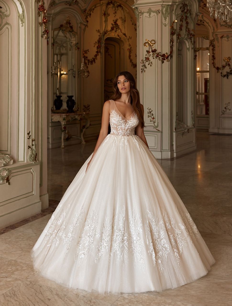 O Vestido Paula é um vestido de estilo clássico com saia rodada que combina o brilho e um design incrível. Destaca-se o corpete levemente translúcido decorado com aplicações de renda e brilho, e o elegante decote em V. Um look de noiva clássico e luxuoso.
