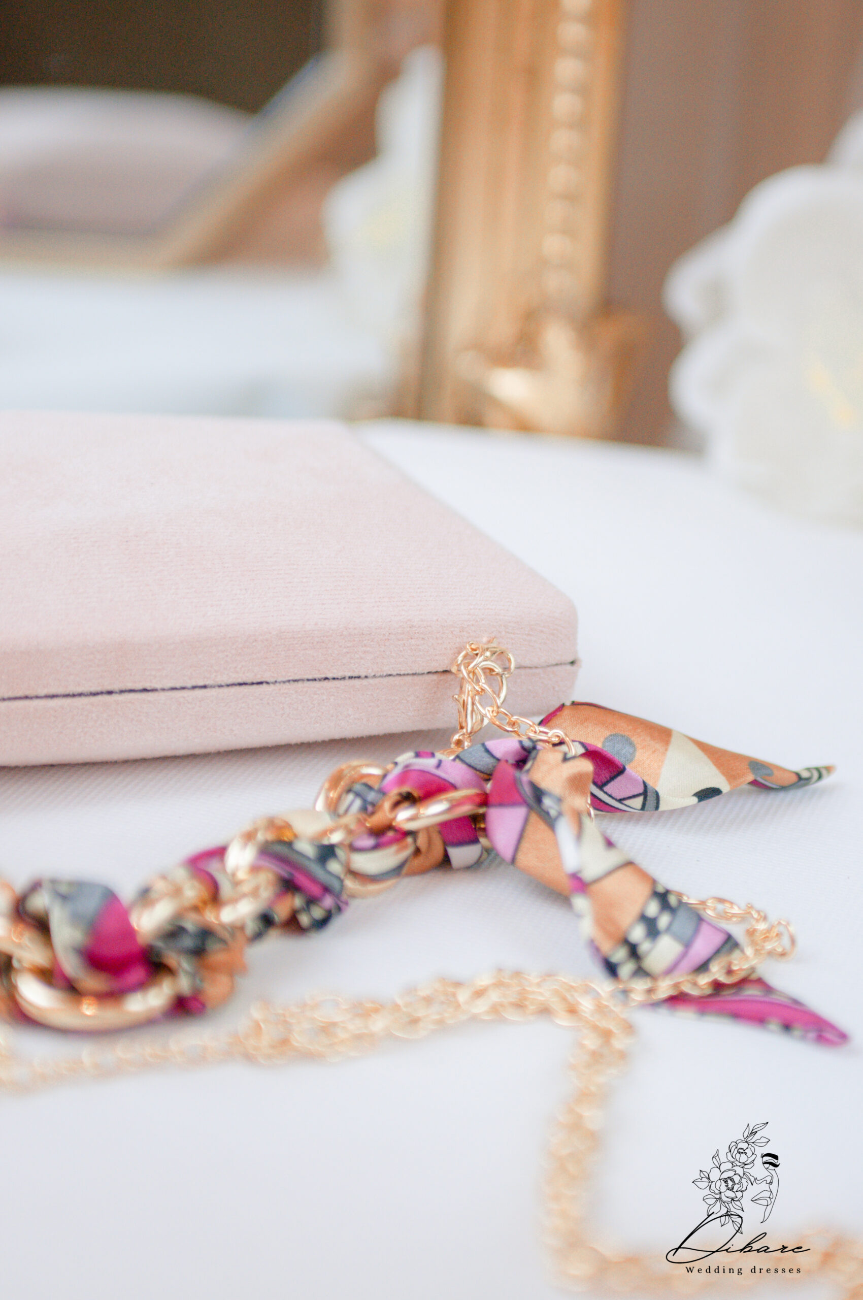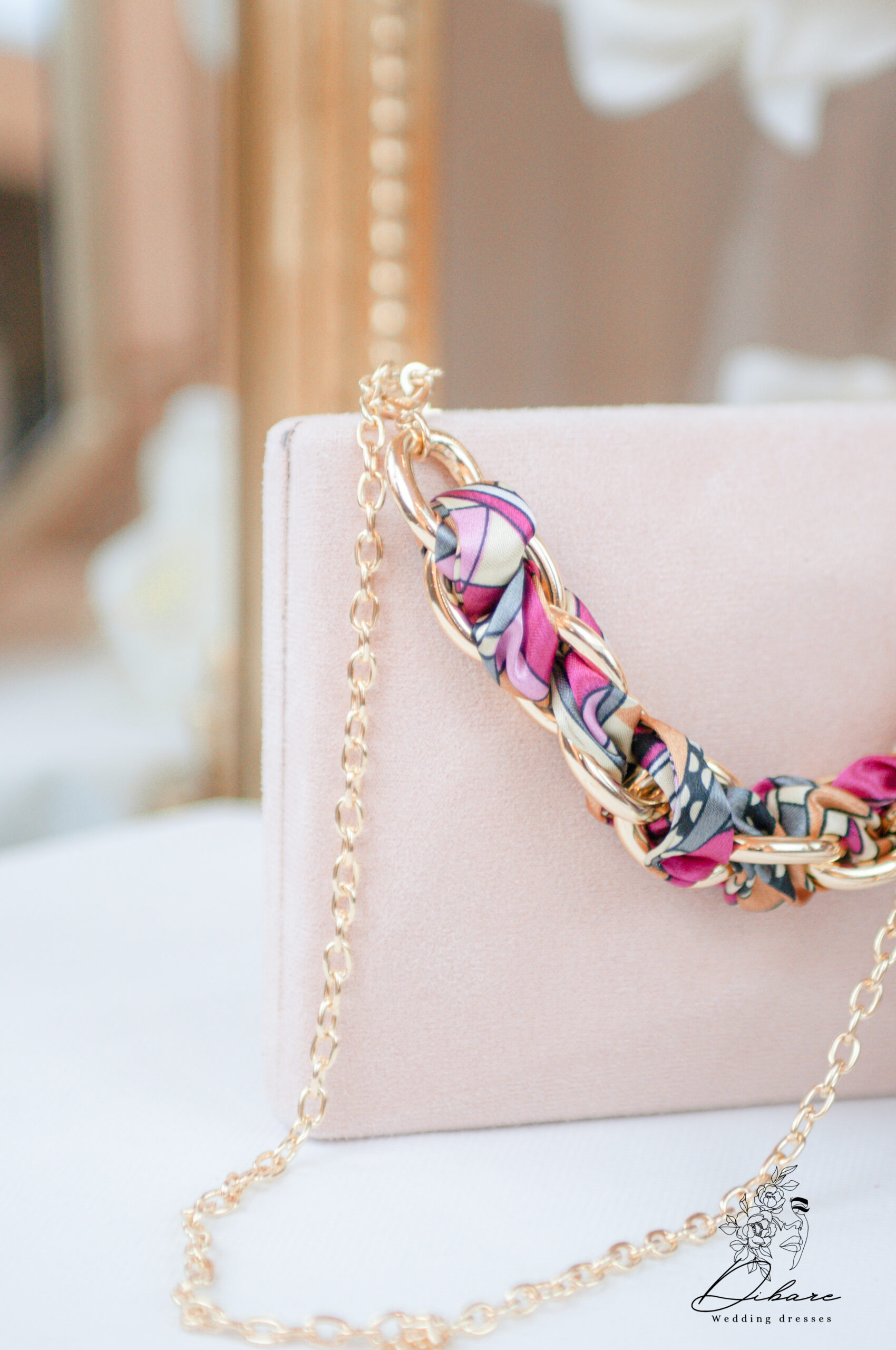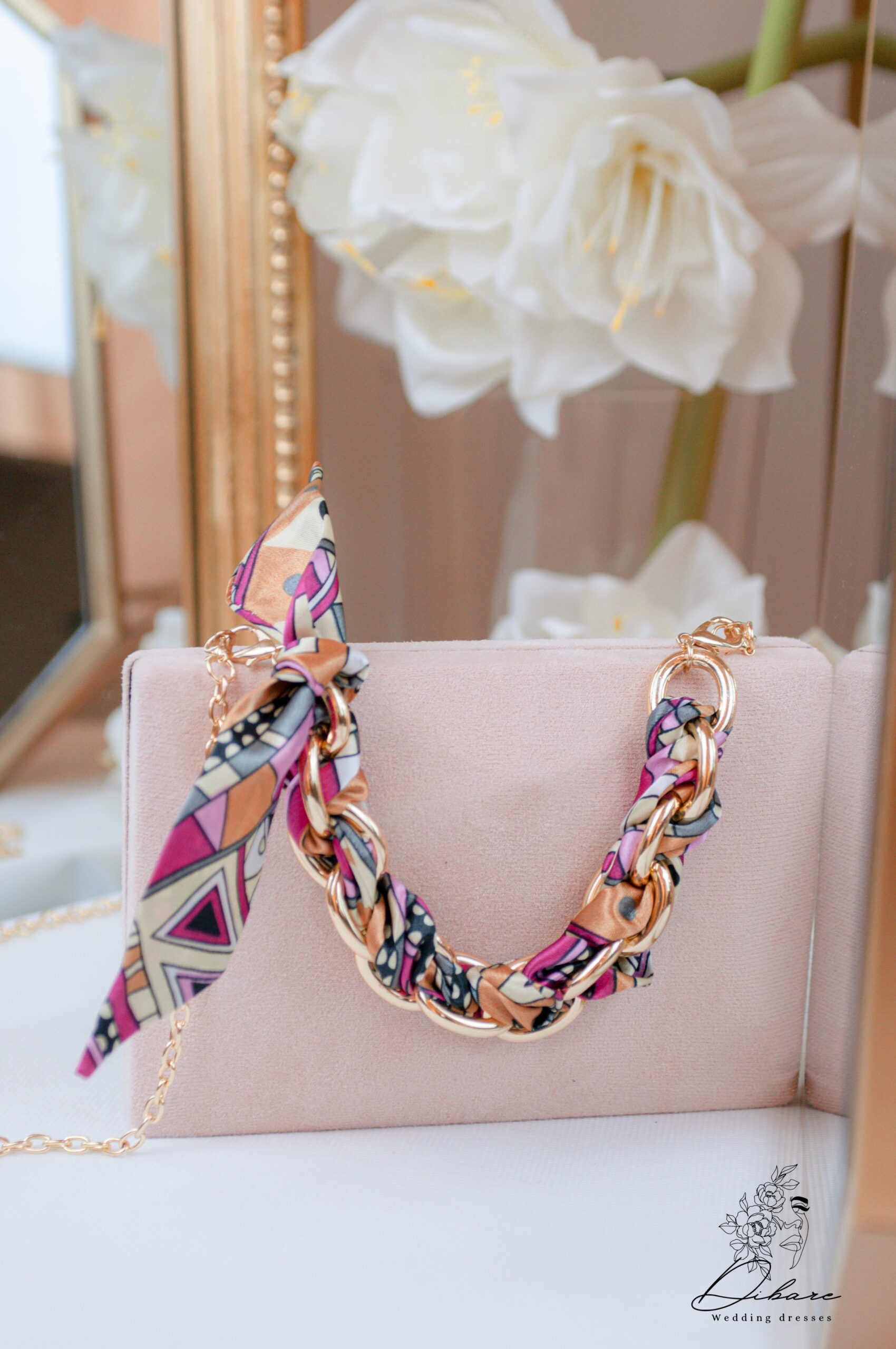 Apresentamos uma mala de mão sofisticada e de toque aveludado, a peça ideal para complementar qualquer look com elegância e um toque de cor vibrante. Esta carteira de mão apresenta uma silhueta clássica e retangular, revestida num delicado tecido tipo camurça na cor rosa pálido . O seu design é elevado por detalhes luxuosos: Alça de Corrente Chunky: Uma alça de ombro curta e decorativa é composta por uma corrente dourada de elos grossos e contemporâneos. Detalhe em Lenço Estampada: A corrente é habilmente entrelaçada com uma fita de tecido com um padrão geométrico e arrojado, onde se destacam os tons de fúcsia, laranja torrado e preto. Esta fita também está artisticamente atada num dos cantos da mala, adicionando movimento e um foco de cor. Alça Longa: Inclui uma fina corrente dourada para usar a mala a tiracolo , oferecendo versatilidade e conforto.