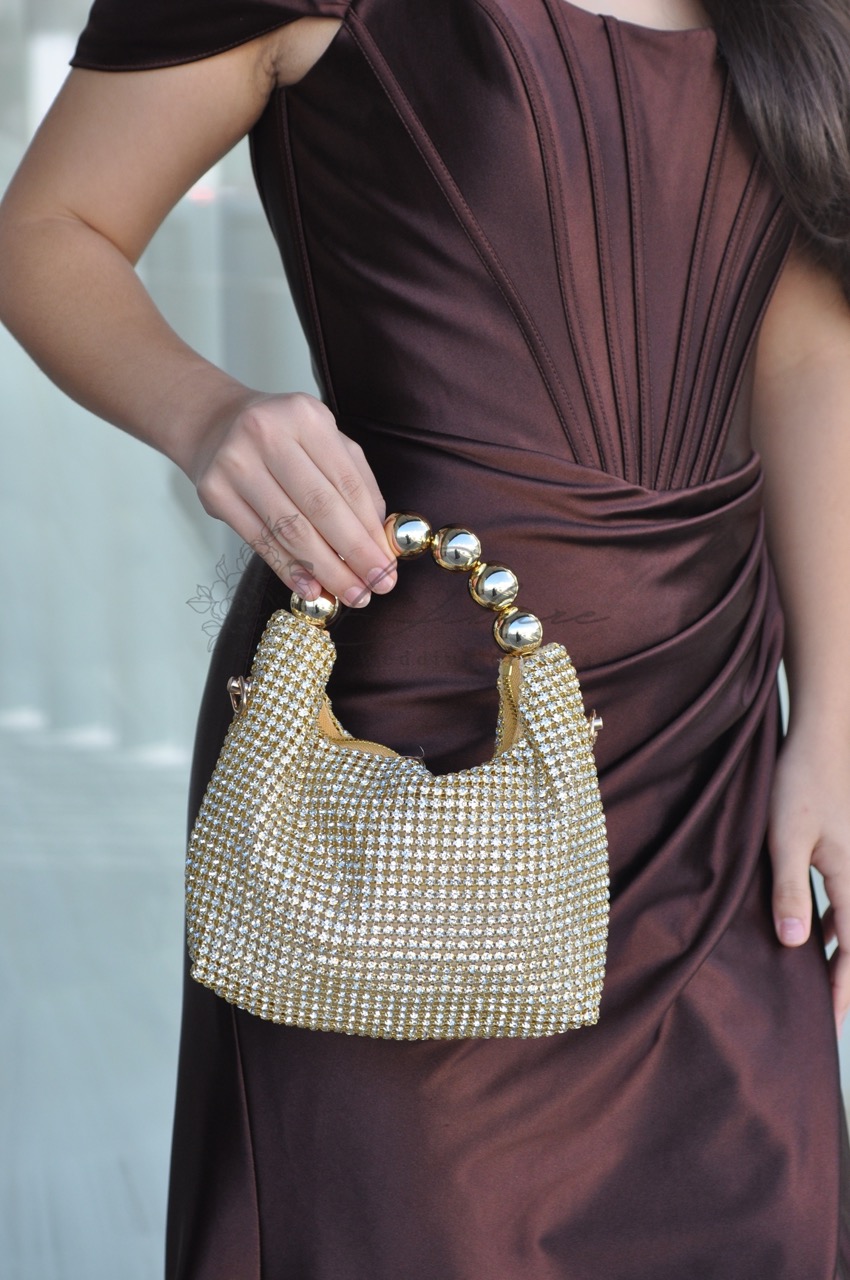 Esta mala é a escolha ideal para acompanhar o vestido castanho chocolate da coleção, criando um contraste rico e harmonioso. O tom dourado dos cristais realça a profundidade do cetim, resultando num visual coordenado e puramente luxuoso.