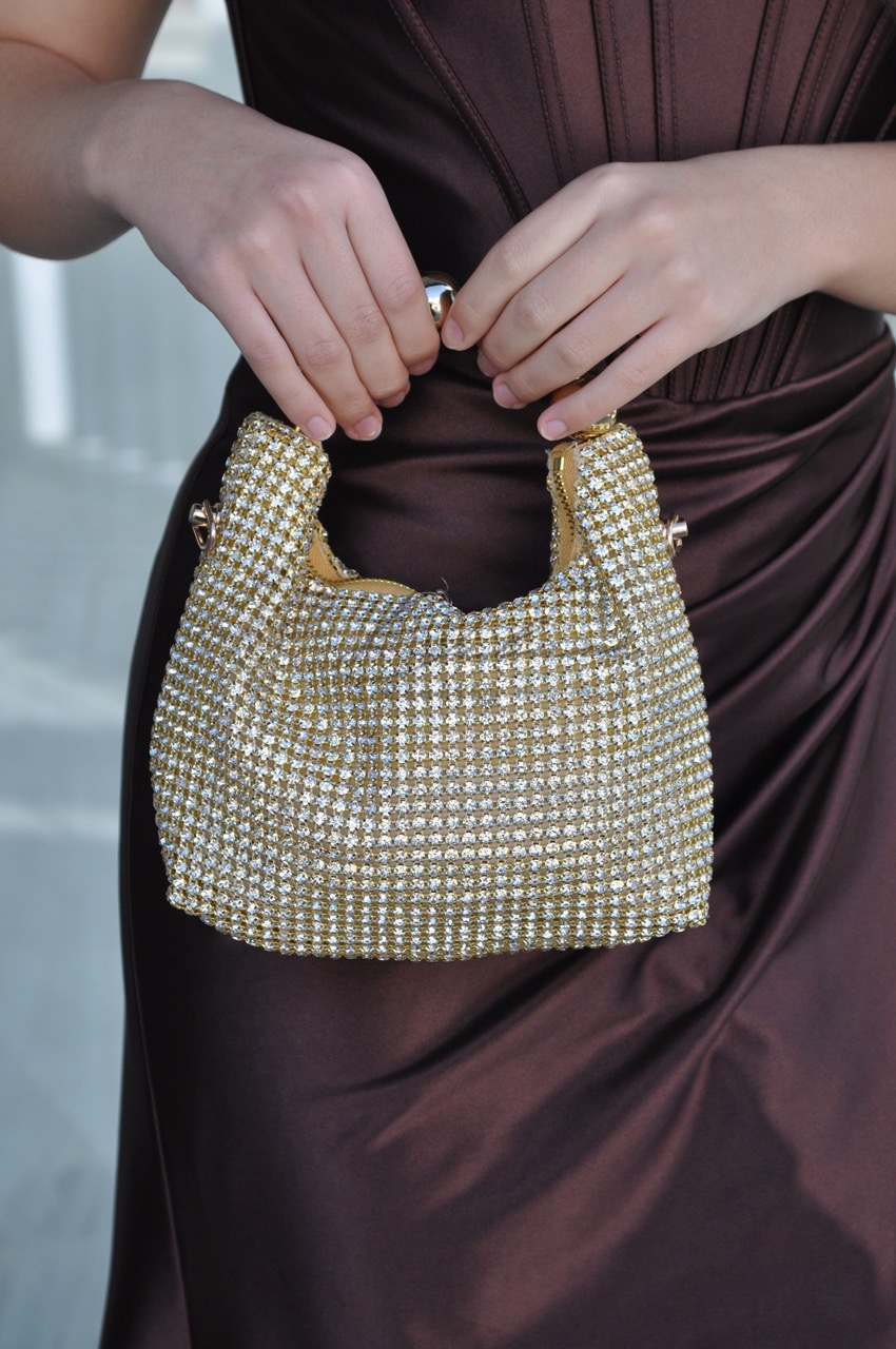 Esta deslumbrante mala de mão é a peça de afirmação perfeita para quem procura brilho e distinção num evento especial. Combinando uma estética vintage com acabamentos de luxo, esta mala estilo “hobo” em miniatura é totalmente revestida por uma malha de cristais dourados, que captam e refletem a luz de todos os ângulos. O corpo da mala apresenta um trabalho minucioso de cravação, criando uma superfície cintilante e maleável que exala glamour e sofisticação. O grande diferencial deste modelo é a sua pega estruturada, composta por esferas metálicas douradas de alto brilho, que conferem um toque moderno e arquitetural ao design.