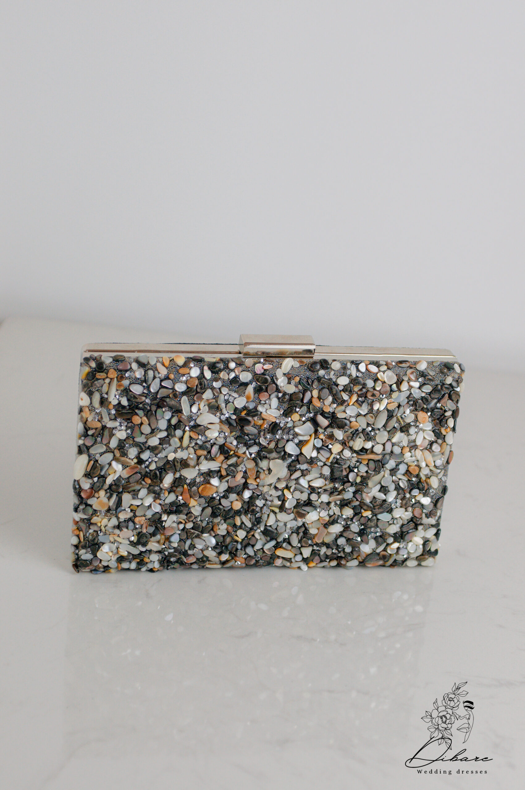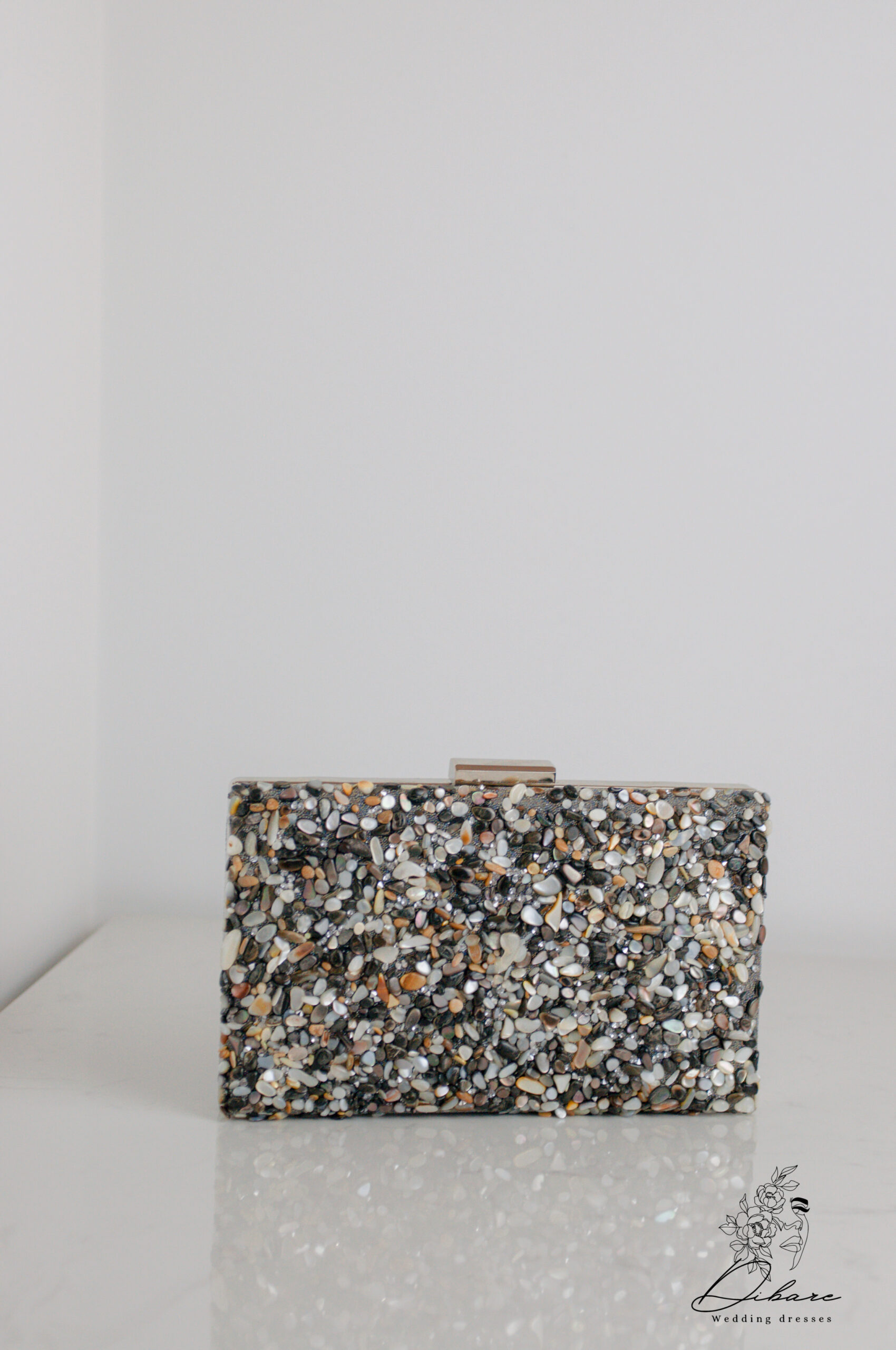 Apresentamos esta pochete de formato box e estrutura rígida, um acessório arrojado e moderno, perfeito para adicionar um toque de brilho e textura a qualquer look noturno ou de festa. O seu design retangular e compacto é coberto por uma aplicação que cria um efeito visual de mosaico ou confetti. Esta textura é composta por múltiplos fragmentos cintilantes, com predominância de tons de cinza, preto e prateado, pontuados por delicados toques de laranja ou dourado velho. A combinação destes elementos confere-lhe um aspeto tridimensional e glamouroso. O acabamento com resina ou acrílico confere-lhe um brilho subtil e garante a durabilidade da peça. O fecho, discreto e central, apresenta um tom prateado ou metálico, mantendo o foco na textura exuberante da pochete.