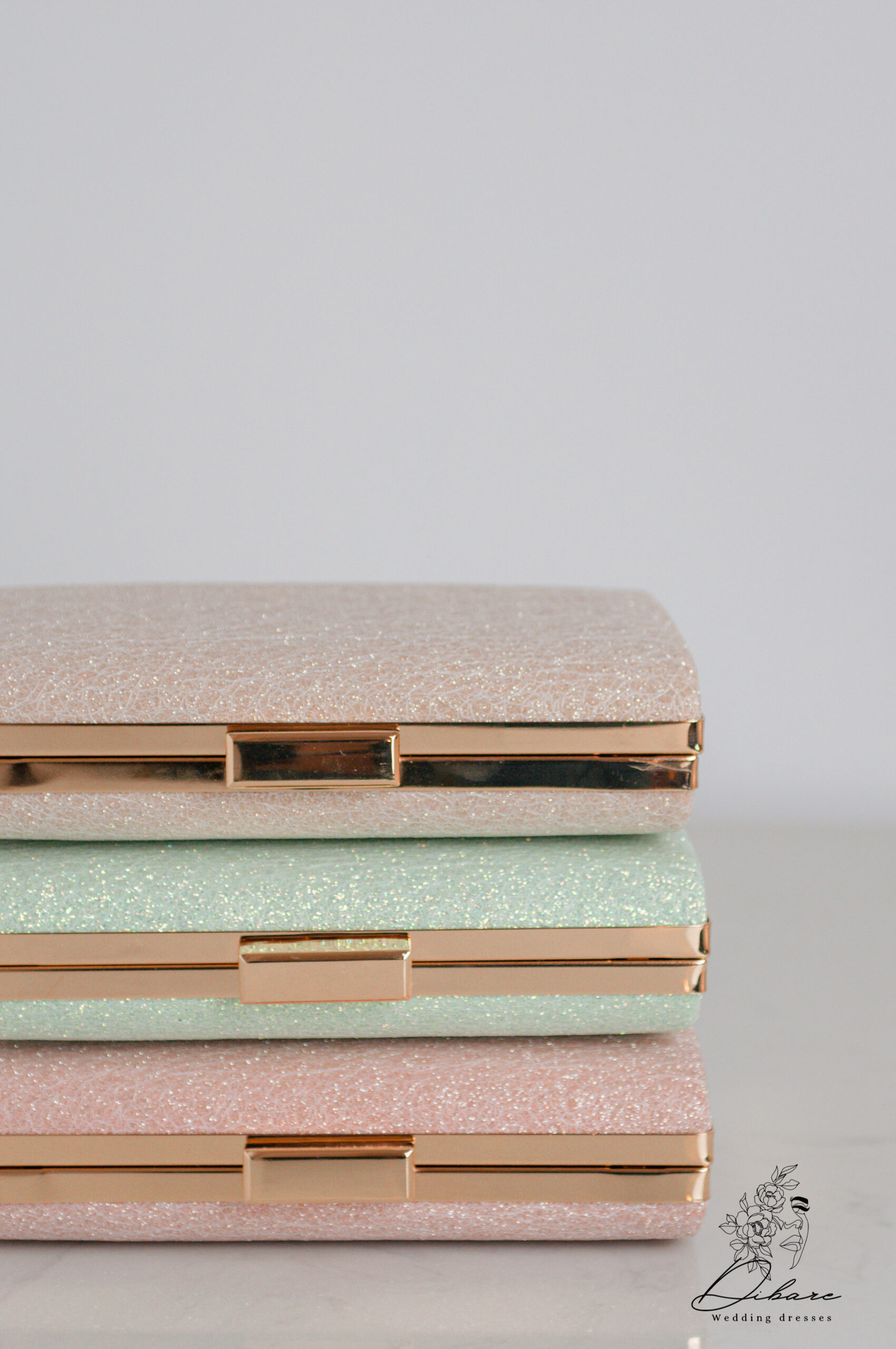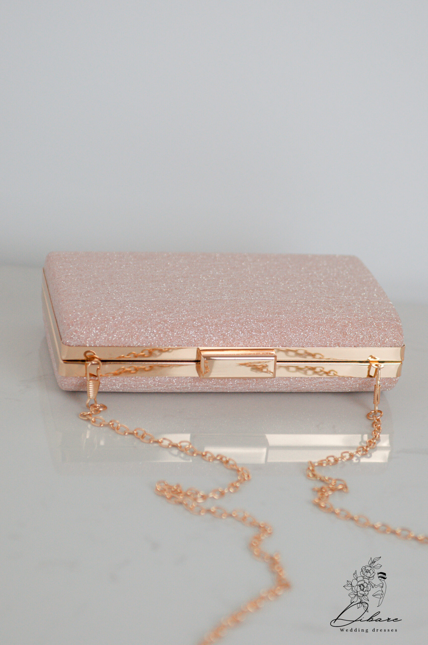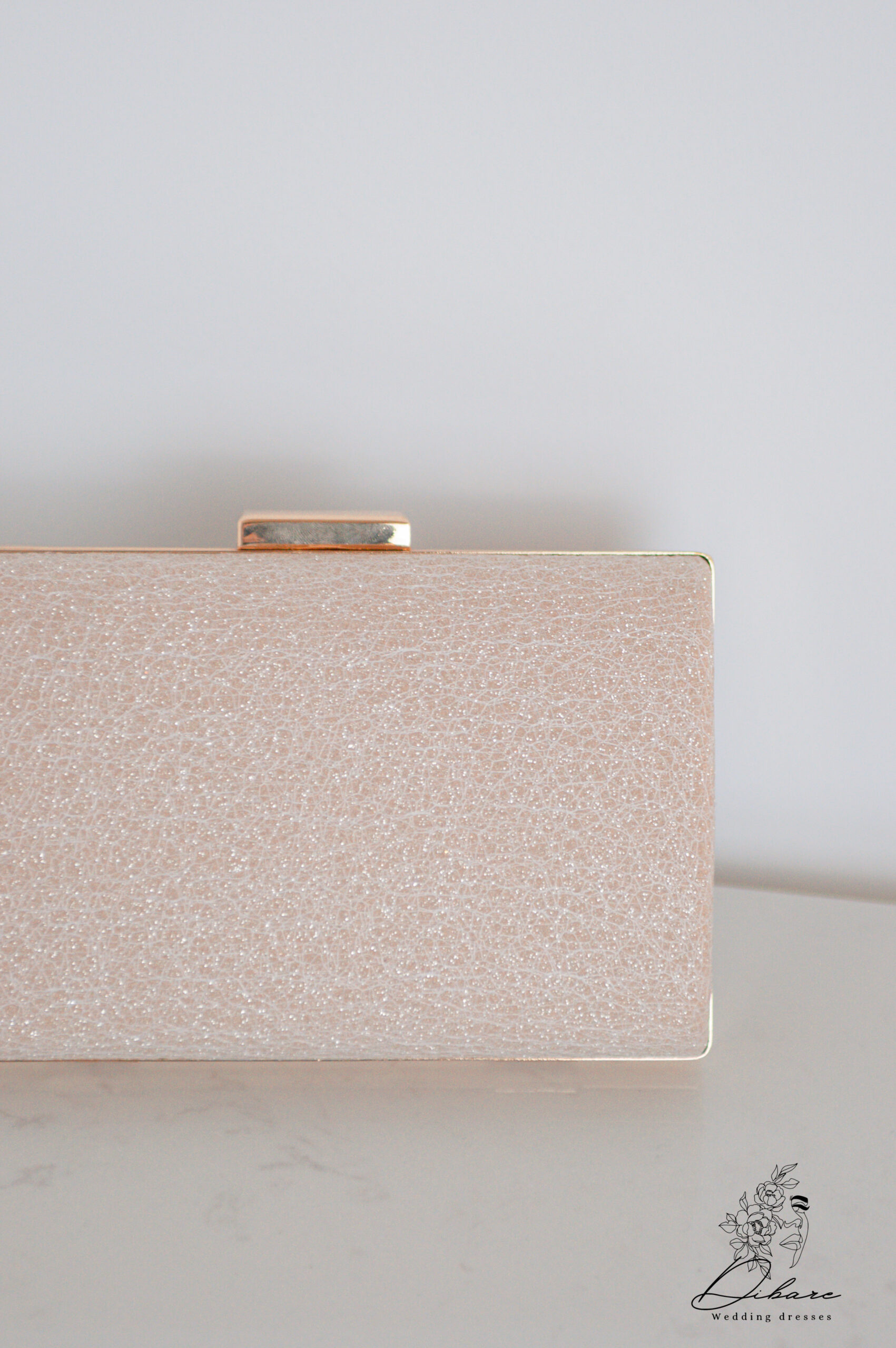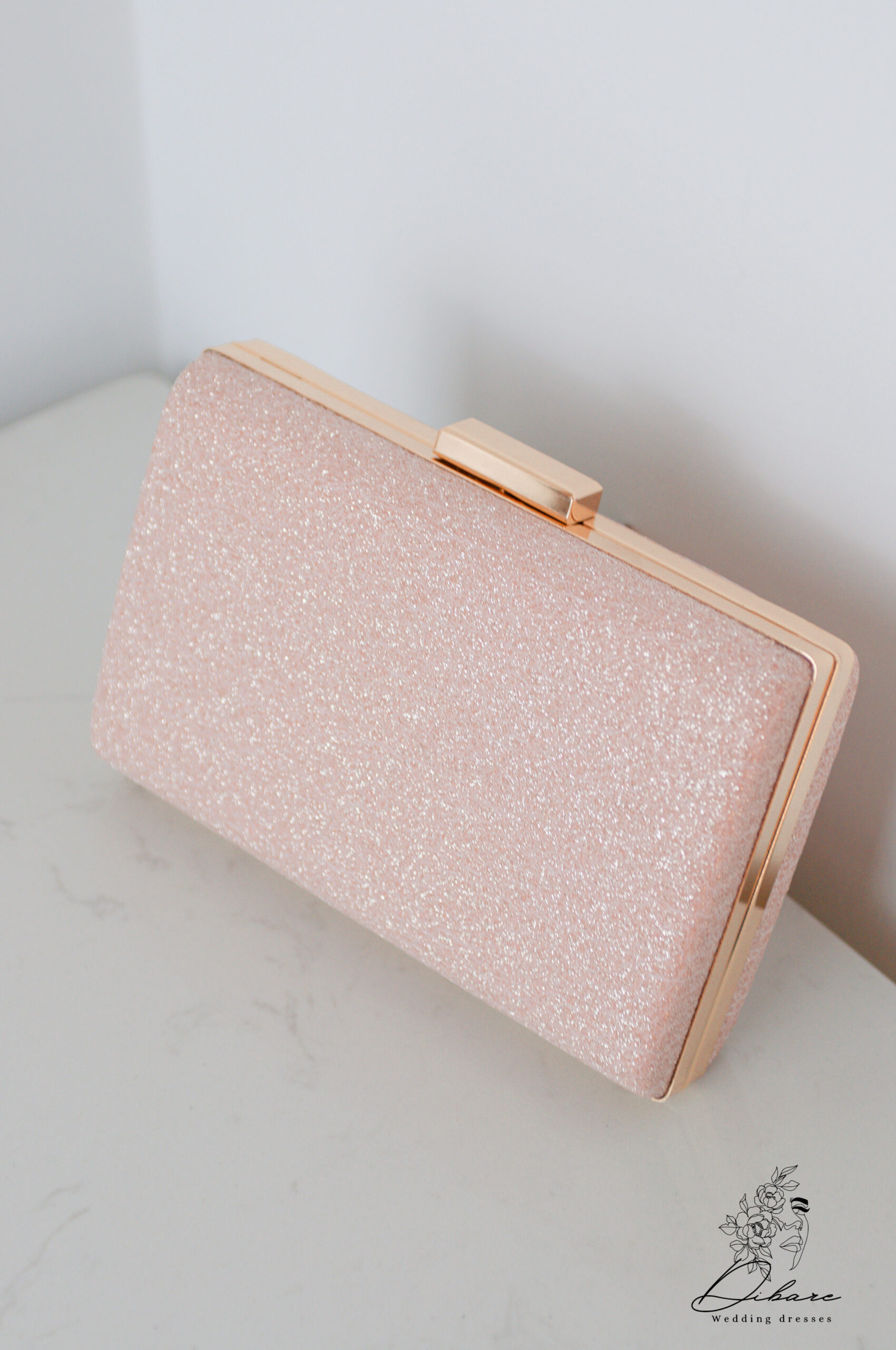 Esta pochete é a definição de sofisticação moderna e o acessório essencial para complementar o seu visual em casamentos, batizados ou qualquer evento formal. O design é marcado por uma elegante forma retangular rígida, que garante que os seus pertences se mantenham seguros e protegidos. O exterior é revestido num material com acabamento brilhante e texturizado parecido a glitter fino, conferindo um toque de luxo e festa que não é excessivo, mas que capta a luz de forma requintada. O detalhe central é o seu fecho tipo aba metálica em tom ouro rosa ou dourado claro, que não só garante a segurança, mas serve também como um elemento de design polido e contemporâneo. É a escolha perfeita para a mulher que procura um acessório que seja ao mesmo tempo delicado, moderno e glamouroso.