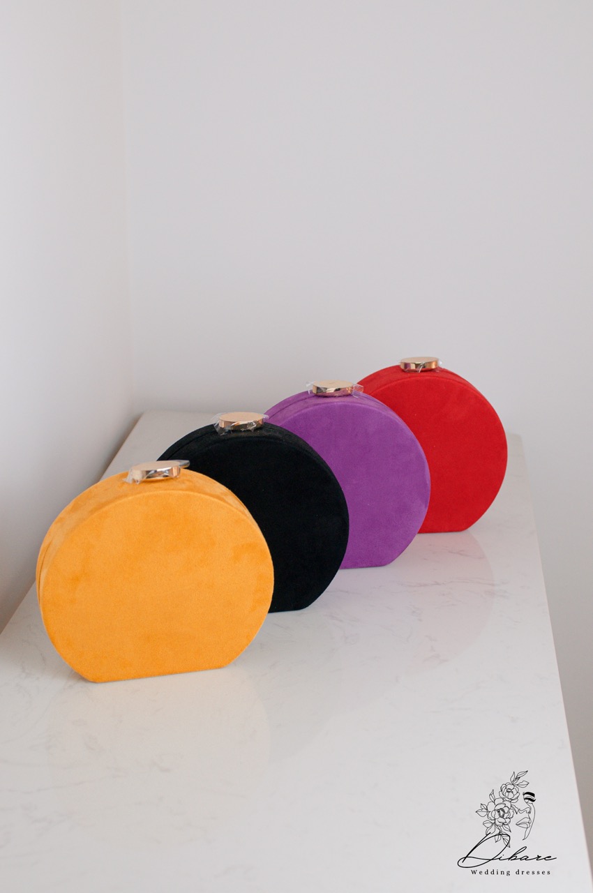 Estas malas rígidas de festa destacam-se pelo seu design elegante, simples e extremamente versátil. Disponíveis em várias cores vibrantes — vermelho, roxo, preto e amarelo — permitem adaptar o acessório ao estilo e à ocasião, seja um evento formal ou uma celebração mais descontraída. Cada mala apresenta uma superfície em acabamento aveludado que transmite sofisticação, complementada por um fecho metálico oval em dourado, protegido por película na imagem. Compactas, modernas e cheias de personalidade, são ideais para transportar apenas o essencial com estilo, tornando-se o apontamento perfeito para elevar qualquer look festivo.