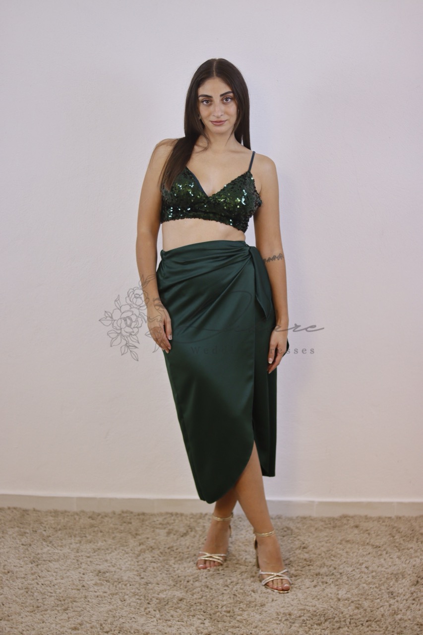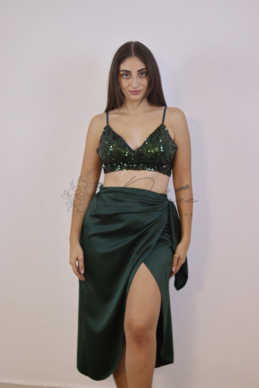 Esta saia midi transpassada é uma peça sofisticada e extremamente versátil, ideal para quem procura um look elegante e com movimento. Confeccionada em um luxuoso cetim na cor verde e na cor rosa a saia possui um brilho suave que adiciona um toque de glamour a qualquer ocasião. O design transpassado permite um ajuste perfeito ao corpo e cria uma abertura frontal sutil na barra, revelando as pernas de forma elegante enquanto se move. O tecido é fluído e macio, com um caimento impecável que valoriza a silhueta. O fecho é dado por um laço ou nó lateral, característico do modelo wrap, que adiciona um detalhe charmoso e ajustável na cintura. Como sugerido na imagem, esta saia combina perfeitamente com tops festivos, como um crop top de lantejoulas, mas também pode ser facilmente combinada com blusas de seda ou malhas finas para um look mais casual chique.