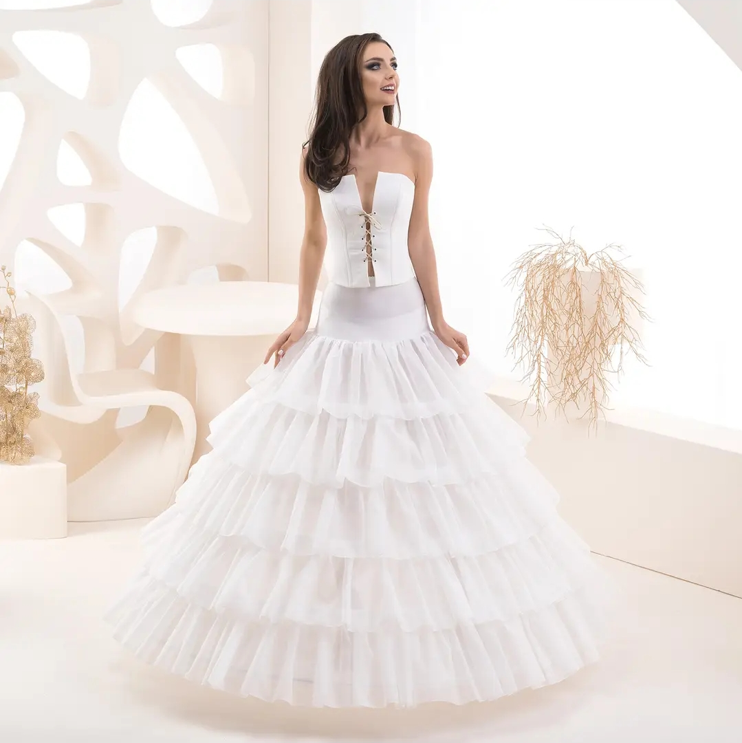 Desenvolvido para criar a silhueta “princesa” perfeita, este saiote destaca-se pelas suas múltiplas camadas de folhos em tule rígido, que conferem uma amplitude generosa e uniforme desde a anca até à bainha. A sua construção em camadas sobrepostas garante que o vestido mantenha a forma ideal, sem quebras, oferecendo um suporte robusto mesmo para tecidos mais pesados como o cetim. A pensar no conforto absoluto durante todo o dia, a peça conta com uma cinta elástica de ajuste suave na zona abdominal. Este design permite que o saiote se molde ao corpo sem criar volumes indesejados sob o corpete, garantindo uma transição fluida e elegante.