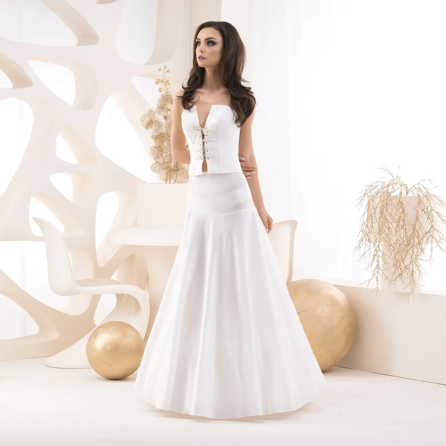 Este saiote de noiva é a peça essencial para quem deseja conferir volume e estrutura a um vestido de corte-A ou trombeta, garantindo um visual de passarela com todo o conforto. O seu design inteligente foca a armação na zona inferior, permitindo que a cauda do vestido se abra de forma majestosa e mantenha a sua forma durante todo o evento. A parte superior é fabricada num tecido elástico e suave que abraça as ancas sem adicionar volume, assegurando uma transição invisível sob o tecido do vestido de noiva. Com um folho generoso em tule na base, este saiote cria a amplitude necessária para destacar o corte do vestido, facilitando também o caminhar ao afastar o tecido dos pés.