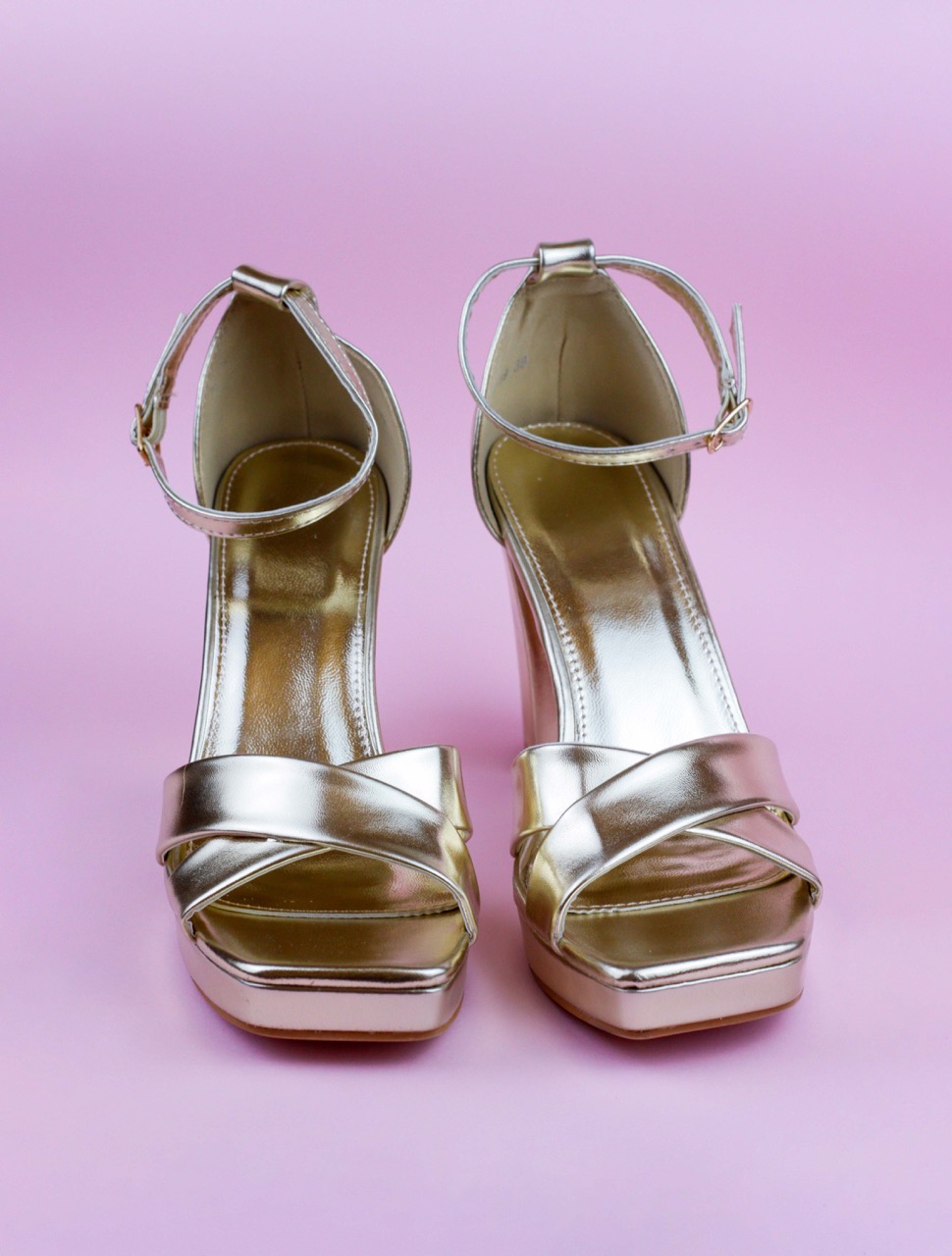 Afirme a sua presença em qualquer evento com esta sandália de plataforma de impacto, desenhada para quem procura elevar o estilo com o máximo de sofisticação. Com um acabamento deslumbrante em tom dourado metalizado, esta peça reflete a luz de forma quente e luxuosa, sendo o complemento ideal para ocasiões festivas noturnas. O design é definido pela sua plataforma frontal robusta, que compensa a altura do salto e proporciona um caminhar mais estável e confortável. As tiras largas cruzadas no peito do pé não só conferem uma estrutura moderna e arquitetônica, como também garantem uma fixação segura. O calcanhar totalmente fechado e a pulseira de tornozelo com fivela ajustável completam este modelo, oferecendo suporte máximo.
