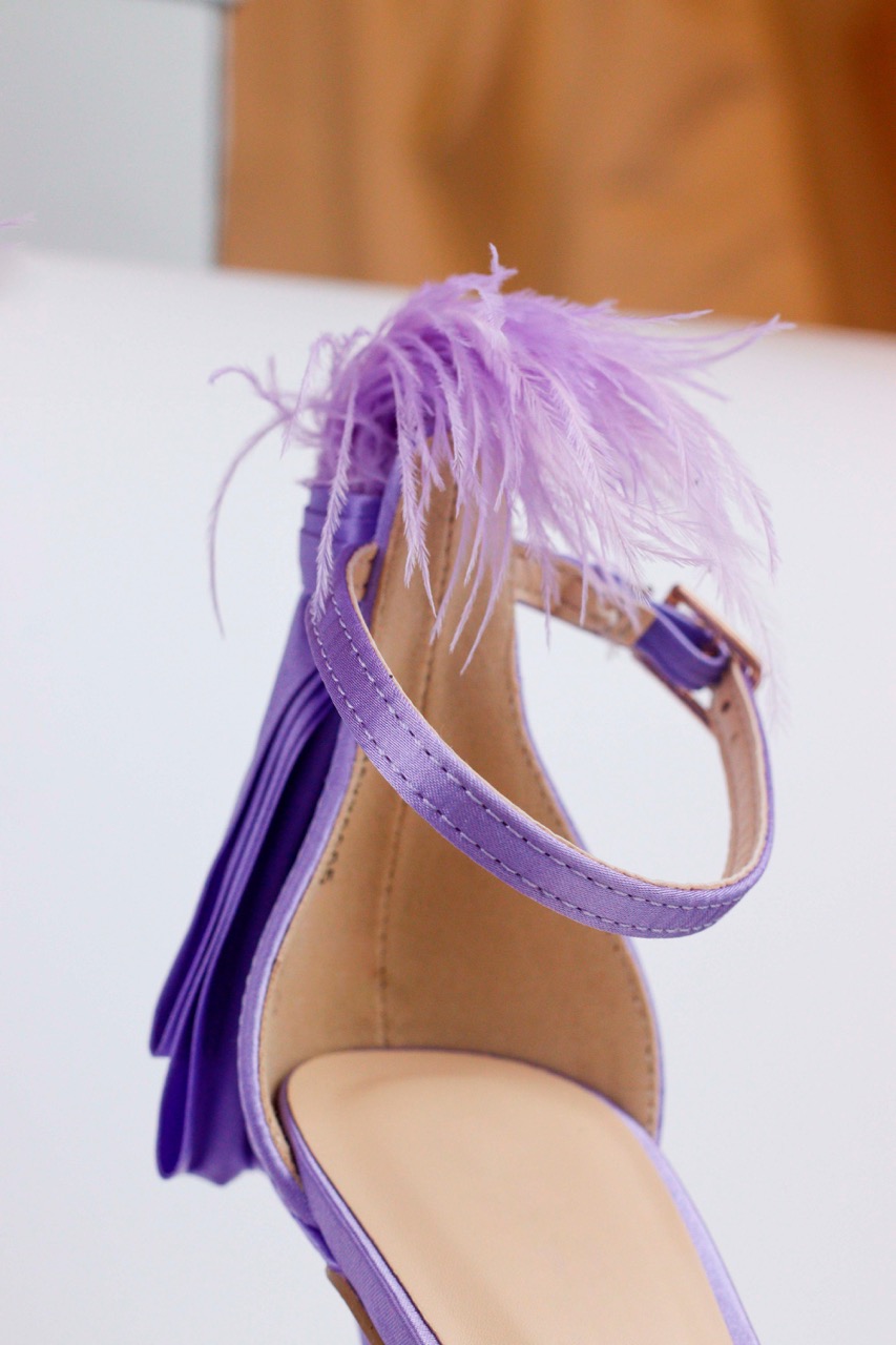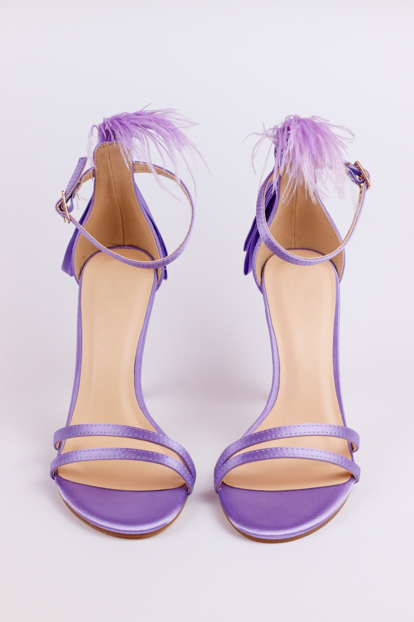 Eleve o seu visual de festa com esta sandália deslumbrante que combina a sofisticação do design clássico com um toque contemporâneo e audaz. Confecionada num cetim vibrante em tom lavanda, esta peça destaca-se pelo seu acabamento acetinado que reflete a luz de forma suave, conferindo um brilho luxuoso a cada passo. O design apresenta tiras frontais duplas e finas, que proporcionam uma estética minimalista e delicada, enquanto o calcanhar fechado oferece suporte adicional. O grande protagonista deste modelo é o adorno de penas suaves na parte posterior, que acrescenta movimento, textura e um ar de exclusividade ao conjunto.