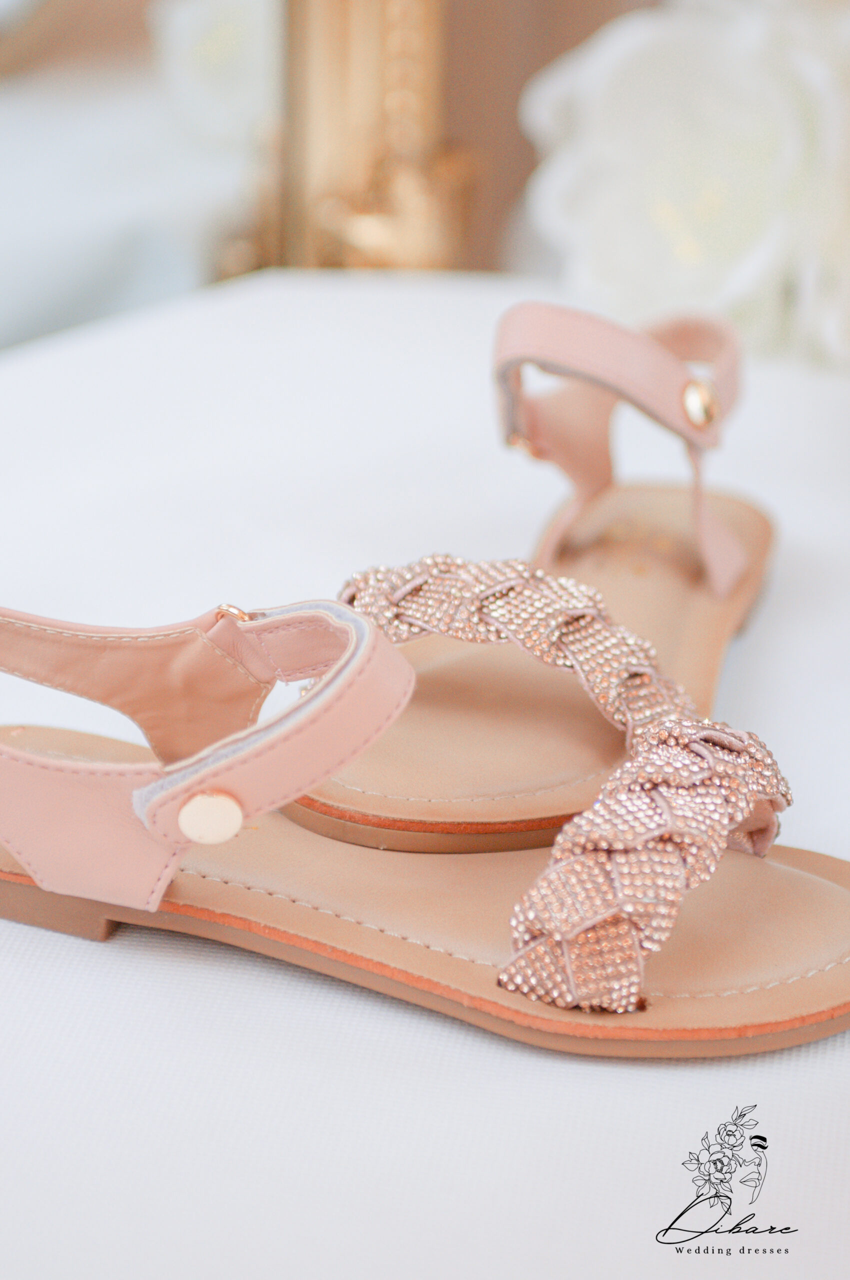 Esta sandália de cerimónia para criança é a escolha perfeita para momentos de celebração sob o sol, aliando a frescura de um calçado aberto a um brilho verdadeiramente luxuoso. Em tons de rosa pastel, este modelo destaca-se pela sua tira frontal elaborada em trança de cristais, que reflete a luz de forma deslumbrante a cada movimento, transformando qualquer conjunto num visual digno de uma pequena princesa. O design foi pensado para oferecer o máximo conforto e segurança. Possui uma tira de ajuste no tornozelo com um botão metálico dourado, garantindo que a sandália se mantenha firme no pé enquanto a criança brinca ou caminha. A sola rasa e flexível, em tom natural, proporciona uma base estável e leve, ideal para eventos de longa duração como casamentos, batizados ou festas de verão.