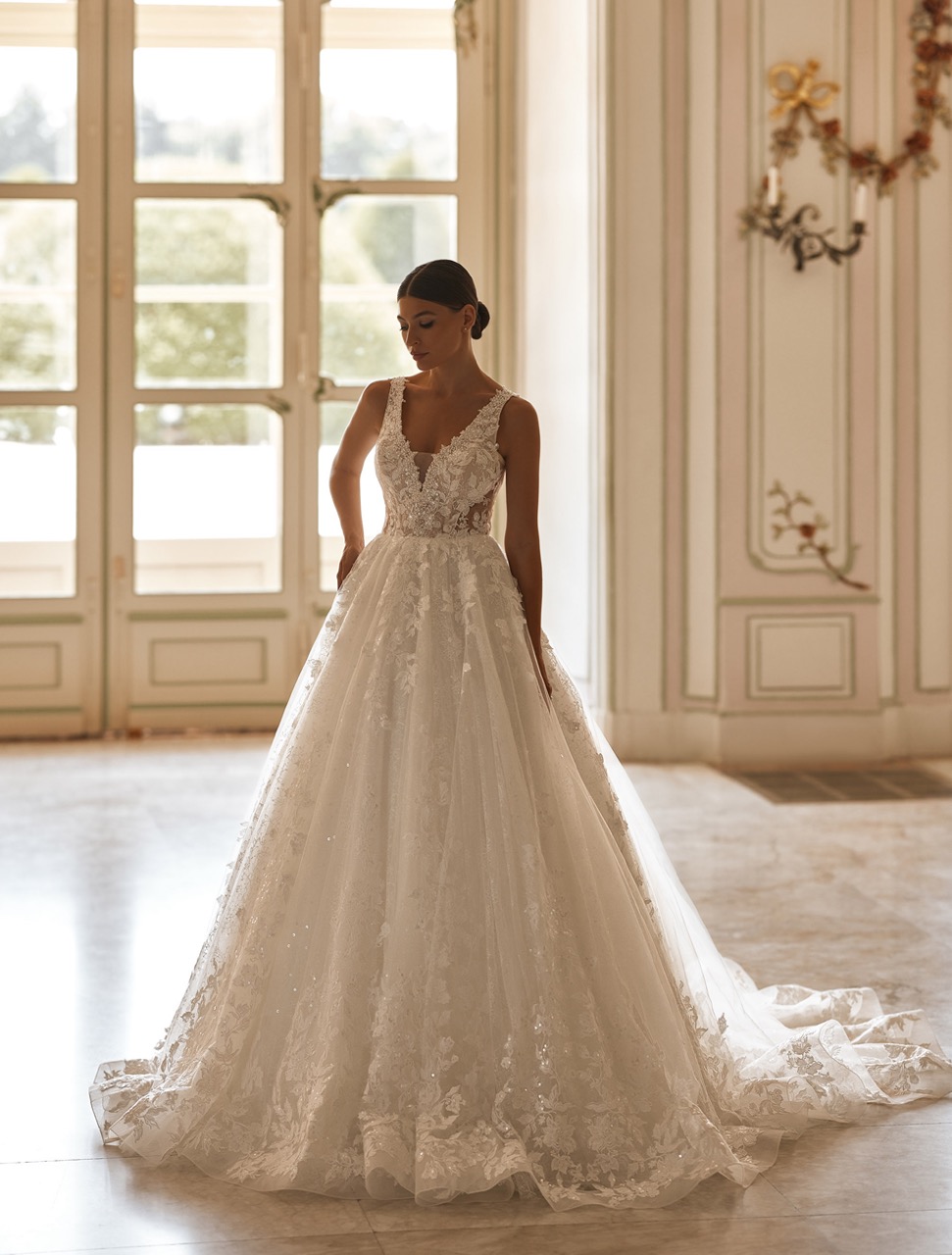 O Vestido Susan é um vestido clássico A-Line que combina leveza com uma silhueta brilhante. É ricamente decorado com renda magnífica, bordada com missangas, lantejoulas e pequenas pérolas. Apresenta uma deslumbrante inserção nude, adicionando um toque de elegância e chic sofisticado. A sua versatilidade de tamanhos, torna-o ideal para todas as noivas.