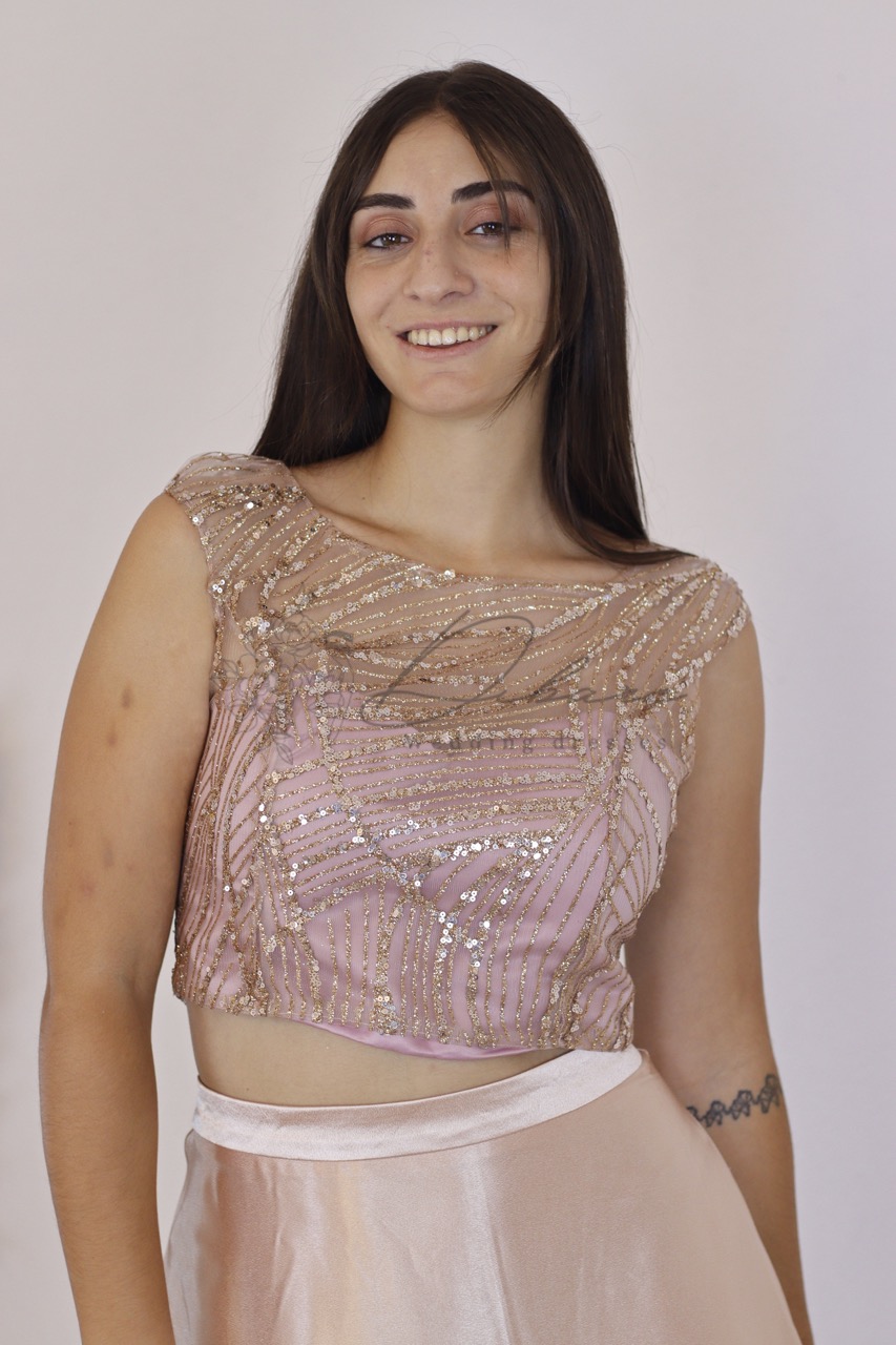 Este top cropped de luxo é a escolha perfeita para quem deseja brilhar em ocasiões especiais, aliando modernidade e elegância clássica. A peça destaca-se pelo seu trabalho minucioso de bordados e lantejoulas, que criam padrões lineares e orgânicos sobre uma base de tule delicado, proporcionando um brilho sofisticado a cada movimento. Com um tom rosa suave e sub tons dourados, o design apresenta um decote à barco (estilo canoa) que valoriza a linha do pescoço e dos ombros de forma discreta e elegante. A estrutura semitransparente na zona superior funde-se suavemente com o corpo, enquanto o restante forro garante conforto e segurança. O corte curto torna-o o par ideal para saias ou calças de cinta subida, criando uma silhueta alongada e contemporânea.