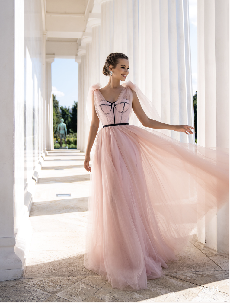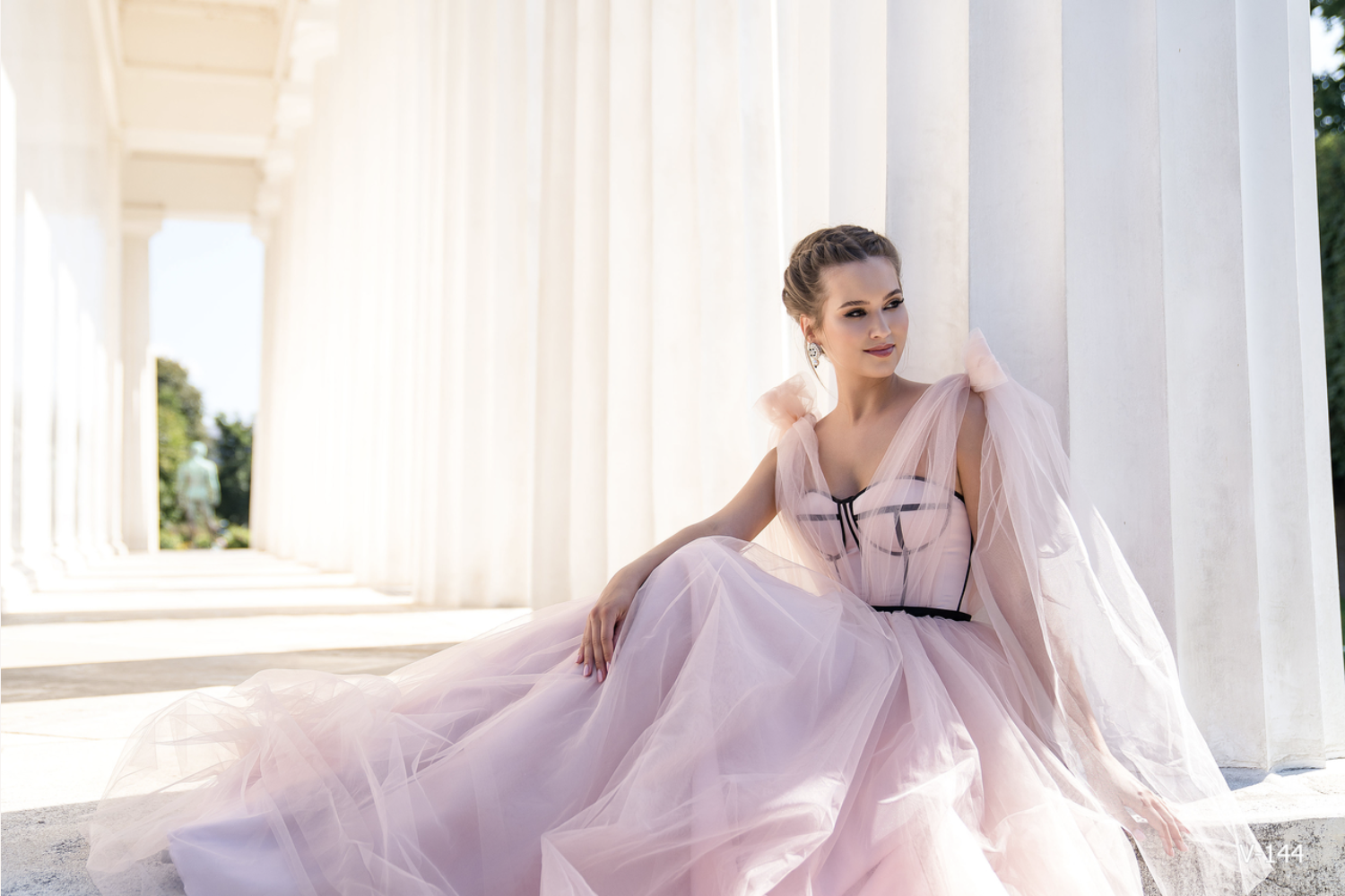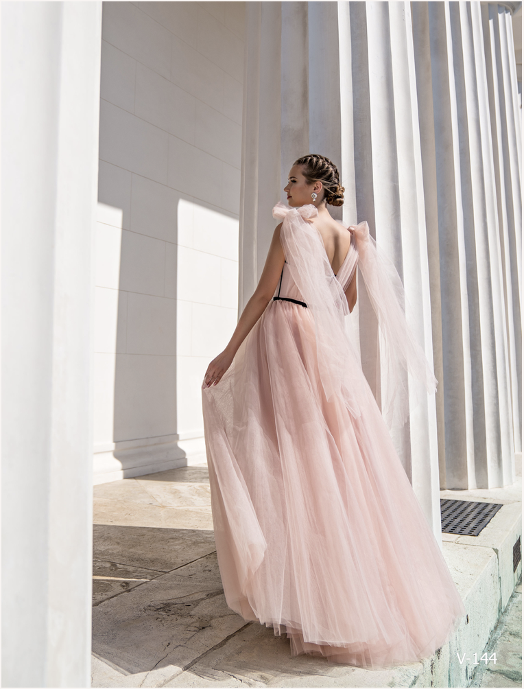 O modelo V144 é uma peça artística que combina a suavidade do tule rosa com a modernidade de linhas gráficas. O corpete estruturado, estilo corset, é realçado por contornos pretos que definem as copas e a cintura, conferindo um ar vanguardista ao design. As alças largas em tule, que se atam em laços suaves sobre os ombros, adicionam uma aura de “fada” e movimento. A saia ampla e leve flui com uma transparência delicada, tornando este vestido a escolha ideal para quem procura um visual romântico, mas com uma personalidade forte e distinta.