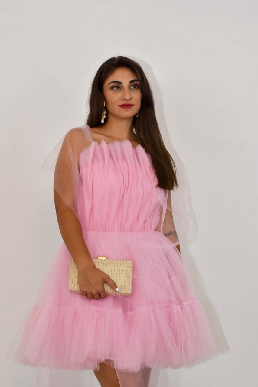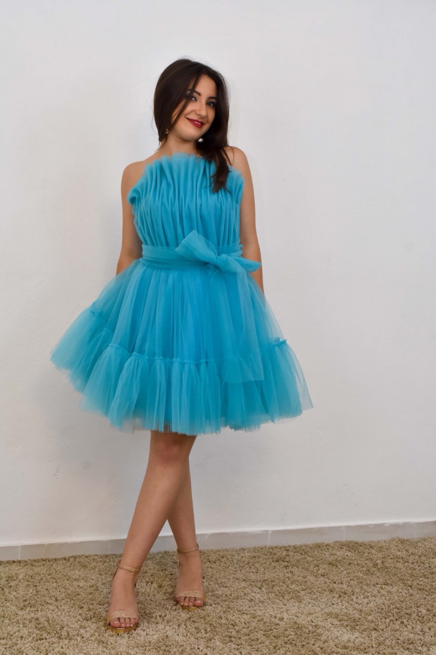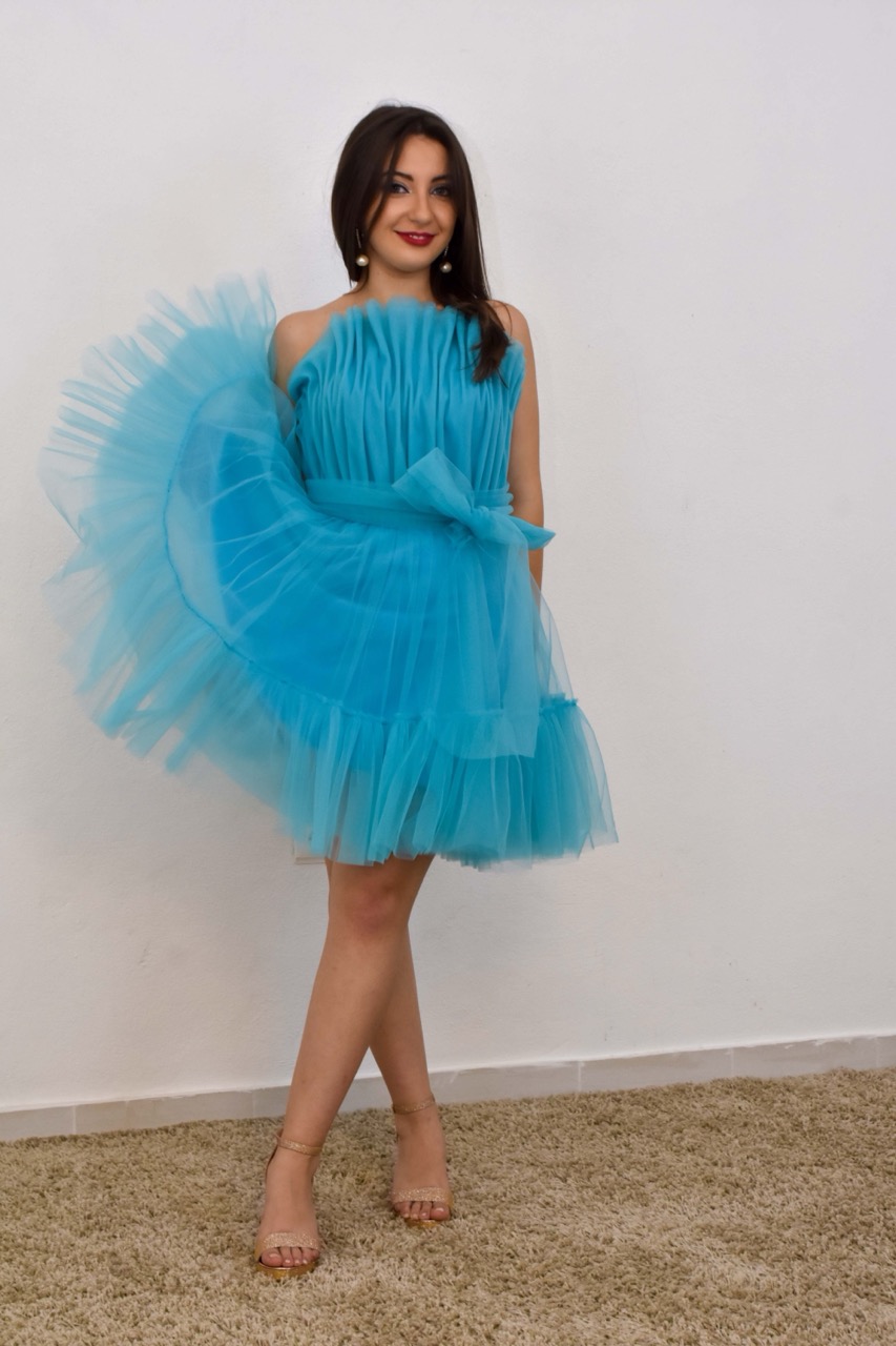 Este vibrante vestido curto em azul turquesa é a peça perfeita para quem procura um visual irreverente, moderno e cheio de personalidade. Confeccionado inteiramente em tule premium, o design destaca-se pela sua textura plissada e volumosa, que confere uma aura lúdica e sofisticada a qualquer celebração. O modelo apresenta um elegante decote cai-cai (tomara que caia) com folhos verticais que adicionam estrutura ao busto. A cintura é acentuada por uma faixa delicada que culmina num laço lateral, equilibrando a silhueta antes de abrir para uma saia em camadas repletas de movimento.