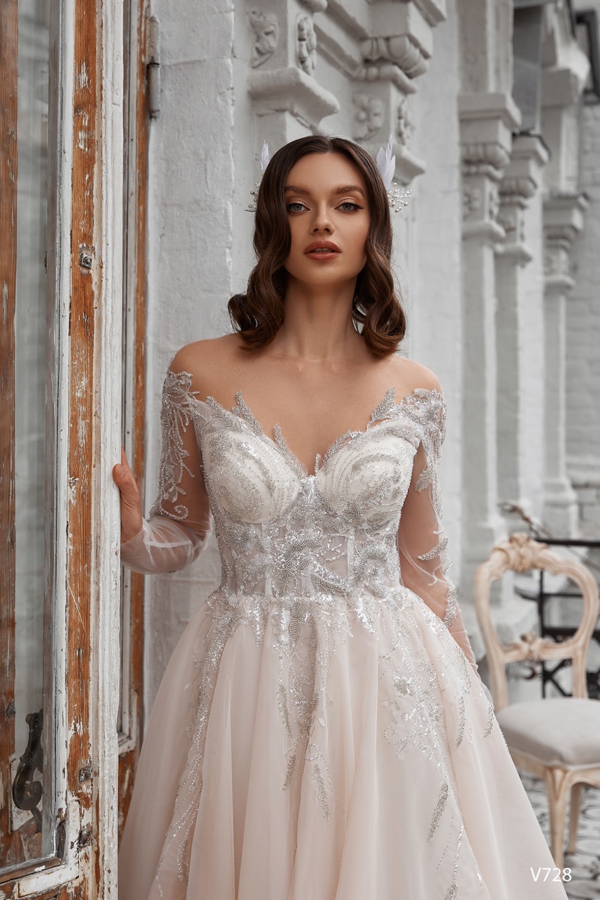 O vestido V728 é romântico e moderno, combinando uma silhueta clássica de A-line com detalhes de glamour boémio. A sua saia ampla e fluida, em tule suave numa tonalidade blush ou nude, confere um toque de cor sofisticado e um movimento leve e etéreo. O corpete é a peça central deste modelo, apresentando um elegante decote ombro a ombro que se estende para mangas compridas em tule transparente, ricamente adornadas com aplicações de renda e bordados cintilantes que caem em cascata sobre o tecido. Estes detalhes em renda e brilho estendem-se de forma subtil pela cintura e pela saia, alongando a silhueta. As costas são igualmente deslumbrantes, com um elegante decote em V que revela a pele na medida certa, mantendo o foco nos intrincados detalhes de renda nas mangas e no corpete. O V728 é perfeito para a noiva que procura um visual delicado, romântico e com um toque de brilho sutil. Disponível para prova no nosso atelier na Sertã.