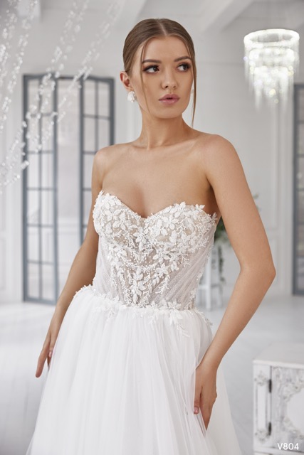 O Modelo V804 é um vestido que celebra o romantismo estruturado e a tendência das mangas volumosas, ideal para a noiva que procura um visual dramático, mas etéreo. A peça estabelece uma Silhueta de Linha A (A-Line) ou Princesa suave, com uma saia ampla e fluida, construída em tule leve que cai com graciosidade. A saia é clean, permitindo que o foco permaneça no corpete e nas mangas. O corpete é o centro da estrutura e do glamour, apresentando um elegante decote , com um corpete cai-caique segue a tendência do Espartilho Visível (com barbatanas verticais). O corpete é feito em tule ilusão e é adornado com renda e beading, criando um efeito de opulência e transparência. Um casaco com mangas são o elemento mais distintivo do design: são Mangas Compridas Estilo Balão ou Bufantes, feitas em tule leve e transparente. Começam nos ombros de forma volumosa e apertam no pulso com um punho limpo, conferindo um look de princesa moderna. O V804 é a escolha perfeita para a noiva que valoriza a tendência do corpete estruturado e o volume romântico do casaco mangas de tule.