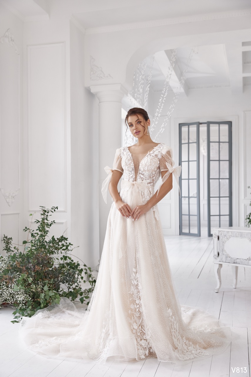 O Modelo V813 é um vestido que celebra o romantismo etéreo, com um toque de cor nude ou champanhe no forro, e o charme das mangas borboleta, ideal para a noiva que procura um visual leve, fluido e ricamente adornado. A peça estabelece uma Silhueta de Linha A (A-Line) suave, com uma saia ampla e fluida, construída em múltiplas camadas de tule leve, sobreposta a um forro mais escuro. A saia é delicadamente adornada com aplicações de renda floral que caem em cascata pela parte da frente e cauda, conferindo uma riqueza textural e um toque boho-chic. O corpete é o foco da leveza e do detalhe, apresentando um Decote em V profundo na frente, coberto por tule ilusão. O design possui mangas curtas de tule, em formato de asas ou borboleta, presas por laços nos ombros, que conferem um toque lúdico e muito romântico. O corpete ajustado é ricamente adornado com aplicações de renda floral e beading, que se espalham de forma orgânica e se concentram para realçar a cintura. O V813 é a escolha perfeita para a noiva que valoriza a elegância do nude ou champanhe, a delicadeza da renda e a leveza das mangas originais e femininas.