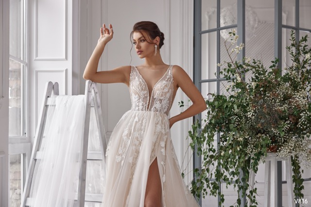 O Modelo V816 é um vestido que celebra o romantismo etéreo do tule, com um toque de cor nude no forro e a sensualidade do slit, ideal para a noiva que procura um visual leve, fluido e ricamente adornado. A peça estabelece uma Silhueta de Linha A (A-Line) suave, com uma saia ampla e fluida, construída em múltiplas camadas de tule leve, sobreposta a um forro em tom nude. A saia apresenta uma rachada lateral (slit) alta, que confere um movimento dramático e revela a perna ao caminhar. O corpete é o foco da leveza e do detalhe, apresentando um Decote em V profundo na frente, coberto por tule ilusão. O corpete ajustado, de alças largas, é ricamente adornado com aplicações de renda floral em 3D. Esta renda tridimensional confere textura e profundidade, concentrando-se no corpete e dispersando-se sutilmente pela saia, especialmente ao longo da borda do slit, o que emoldura a abertura e adiciona um glamour visual. O V816 é a escolha perfeita para a noiva que valoriza a elegância do contraste de cores entre o branco da renda e o nude do forro, a delicadeza das aplicações 3D e a atitude moderna do slit.