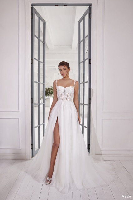 O Modelo V826 é um vestido que celebra a estrutura moderna do corpete estilo espartilho combinada com a leveza etérea do tule e a sensualidade do slit, ideal para a noiva que procura um visual fashion, romântico e ousado. A peça estabelece uma Silhueta de Linha A (A-Line) suave, com uma saia ampla e fluida, construída em múltiplas camadas de tule leve e branco. A saia é moderna e ousada, apresentando uma rachada lateral (slit) alta, que permite grande movimento e revela a perna ao caminhar. O V826 é a escolha perfeita para a noiva que valoriza a leveza do tule, o design estruturado e transparente do espartilho e a atitude sensual do slit.