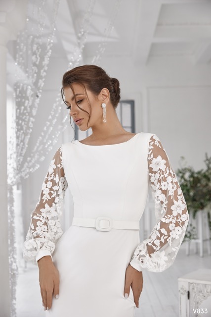 O Modelo V833 é um vestido que celebra a sofisticação do tecido liso e estruturado combinada com a tendência volumosa da manga comprida de renda, ideal para a noiva que procura um visual clássico com um toque moderno e fashion. A peça estabelece uma Silhueta de Linha Coluna ou Sheath (reta), que se ajusta de forma limpa e elegante ao corpo, terminando numa cauda fluida. O vestido é feito em crepe ou cetim liso e opaco, conferindo uma sofisticação inigualável e um caimento escultural.
