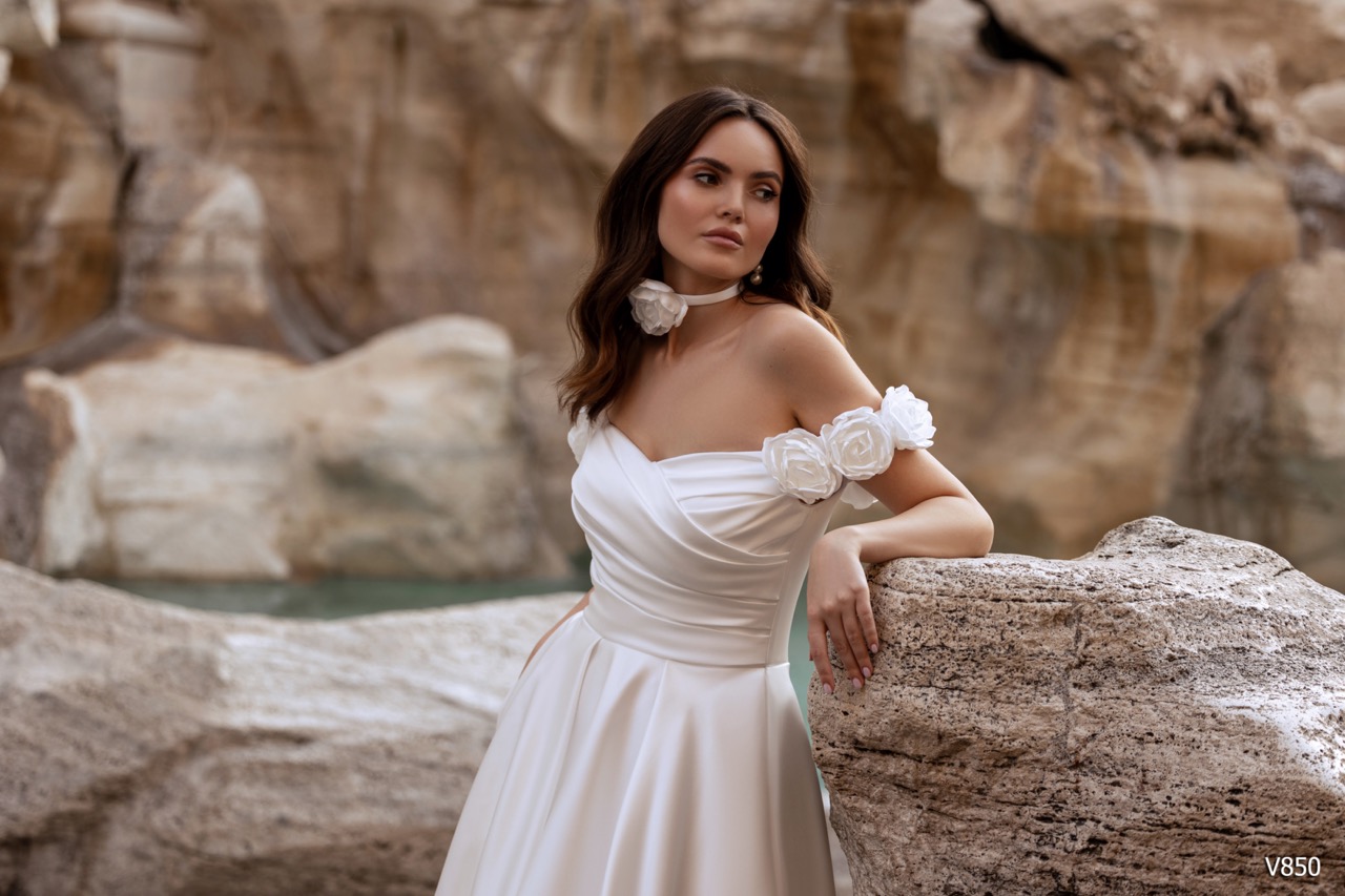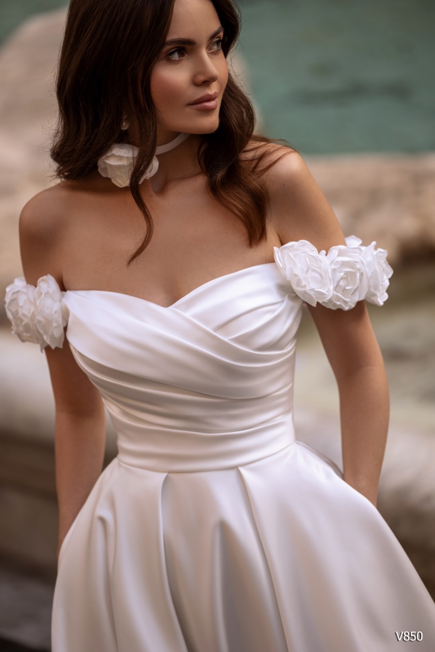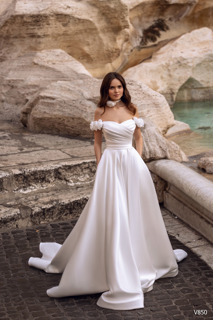 O Modelo V850 é uma verdadeira celebração da alta-costura intemporal e do glamour minimalista, evocando a sofisticação das divas de Hollywood. Projetado para a noiva que exige um impacto visual dramático através da elegância clean, o V850 impõe-se pela sua silhueta majestosa de Corte Princesa (Ballgown). Confeccionado em Cetim ou Mikado de alta qualidade, a saia apresenta um volume imponente e uma estrutura impecável, onde o tecido liso capta a luz, revelando um brilho acetinado e um caimento luxuoso. No corpete, a sofisticação reside no seu Decote Ombro Caído (Off-Shoulder), elegantemente drapeado na horizontal para enquadrar o busto de forma lisonjeira. Este design clean no topo contrasta perfeitamente com a opulência da saia. Para a noiva moderna, o vestido surpreende com um toque funcional: a inclusão de bolsos laterais discretos, que injetam um elemento de atitude e descontração na peça clássica.