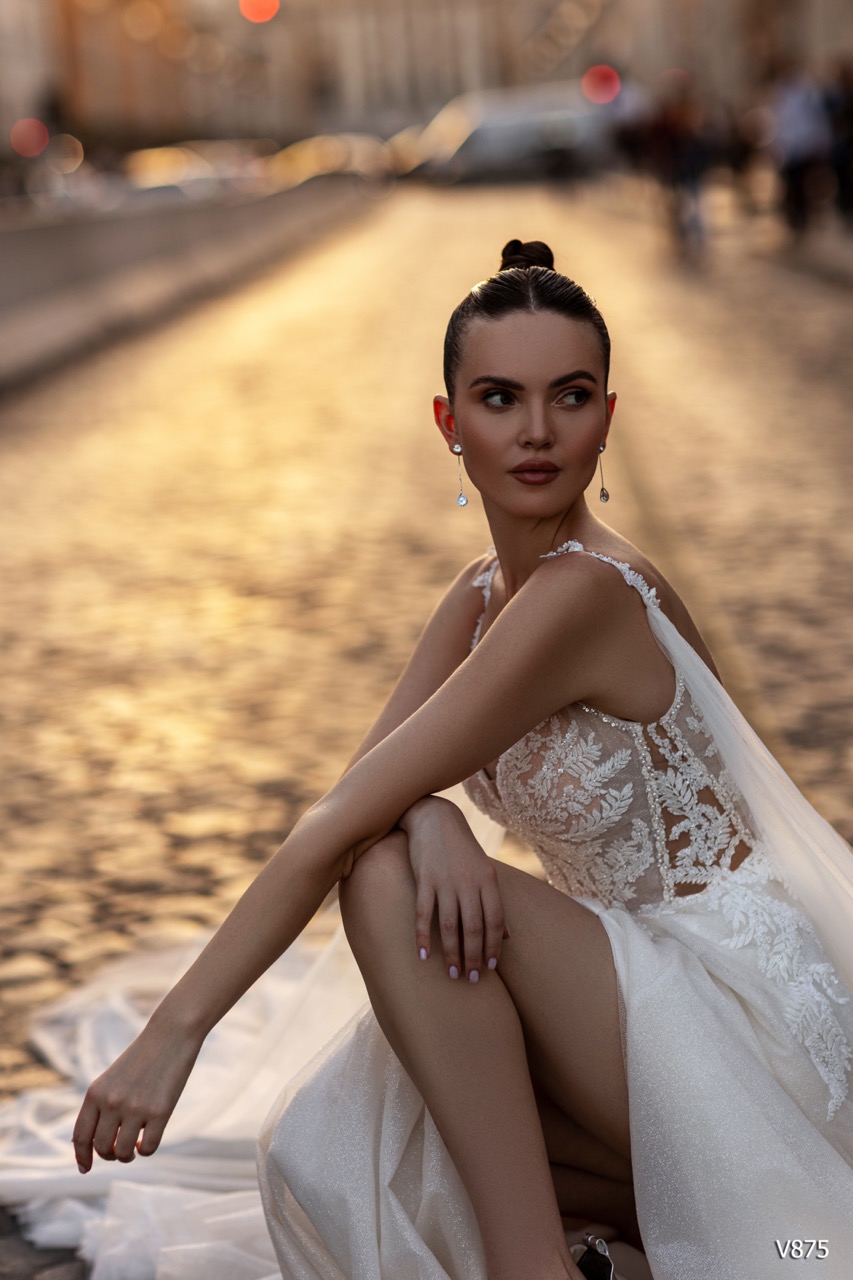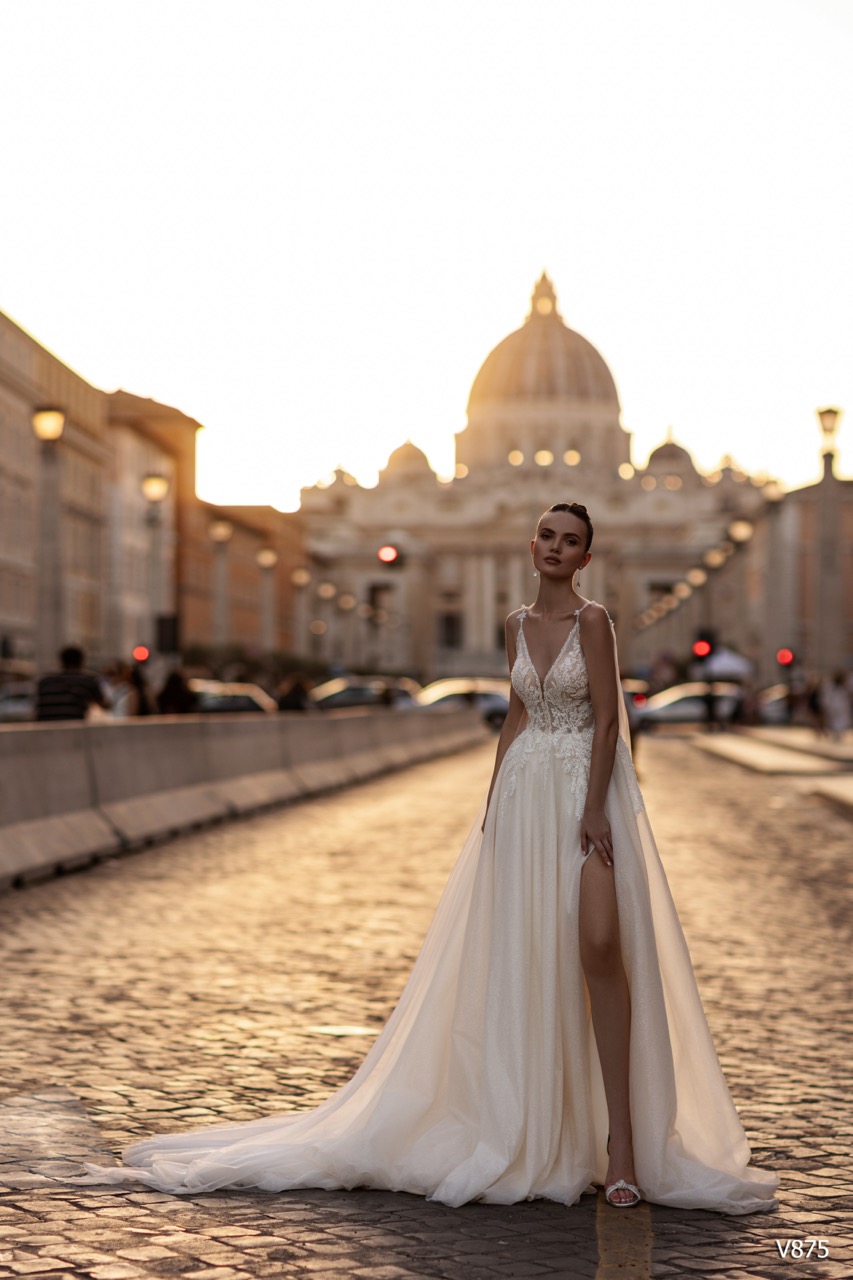 O Modelo V875 é um vestido que celebra a leveza, o romance etéreo e a sensualidade contemporânea, sendo ideal para a noiva que procura um visual dramático, mas fluido. A peça estabelece uma Silhueta de Linha A (A-Line) ampla, com uma saia perfeitamente fluida e majestosa, feita de um tecido leve, como tule ou chiffon, que se estende numa cauda longa e esvoaçante. Esta leveza confere ao vestido um movimento elegante e etéreo ao caminhar. O corpete é o foco da delicadeza e da ousadia: apresenta um Decote em V Profundo (Plunge V), com tule ilusão para suporte, realçando a figura. O corpete é adornado com aplicações subtis de renda e beading que sobem pelas alças finas e se dispersam de forma orgânica pela cintura. O toque mais ousado e definidor deste modelo é a rachada lateral (slit) alta na saia, que confere movimento dramático e revela a perna, injetando uma sensualidade inesperada no design romântico. O V875 é a escolha perfeita para a noiva que deseja a imponência de um vestido de princesa com a fluidez de um visual de destino e o toque moderno do slit lateral.
