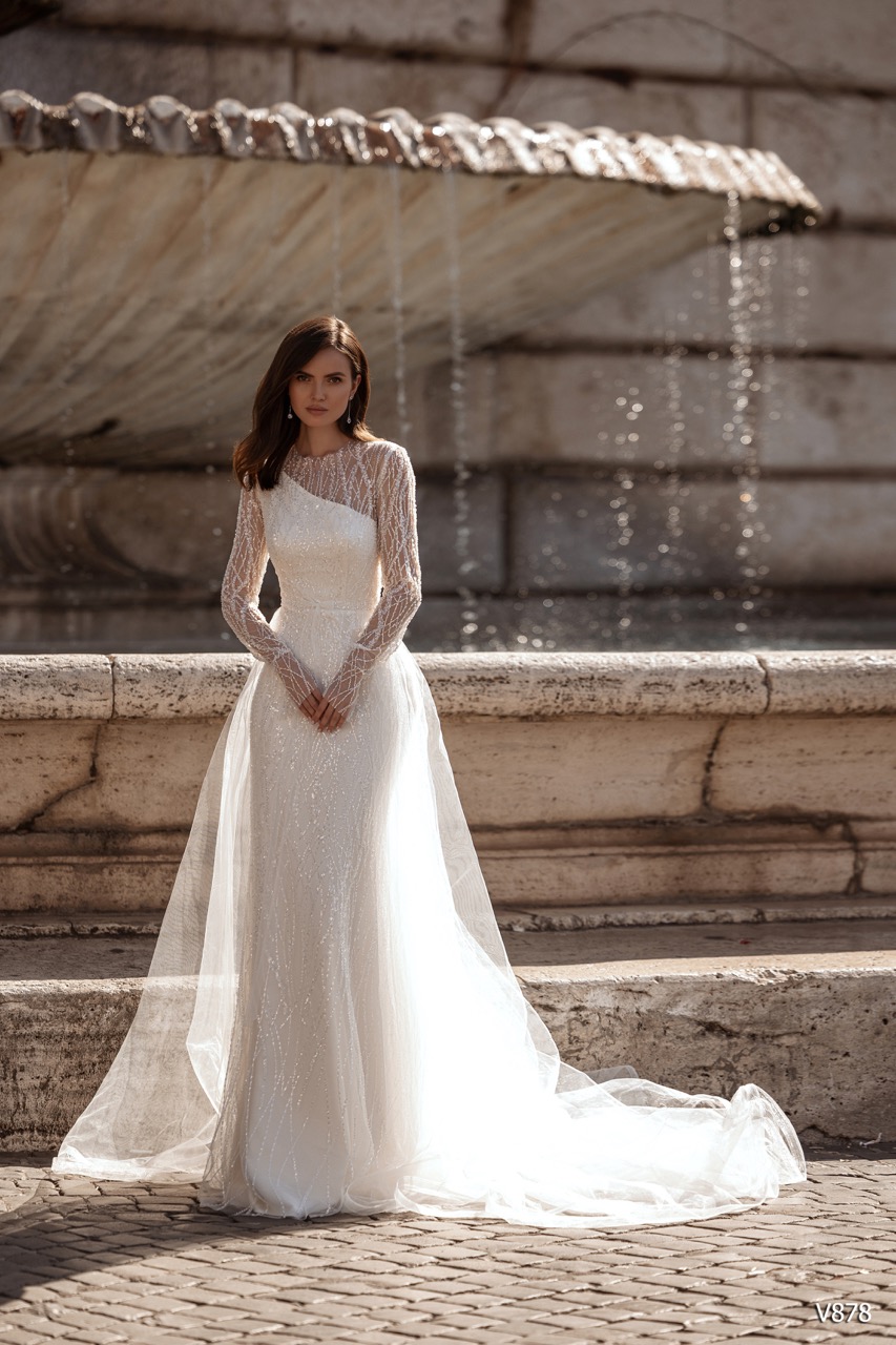 O Modelo V878 é um vestido que celebra a sensualidade do brilho ajustado combinada com o glamour dramático de uma cauda amovível, sendo ideal para a noiva que procura um visual sofisticado e com a funcionalidade de um design transformável. A base é um Vestido Principal de Silhueta Sereia (Mermaid) ou Coluna, que se ajusta de forma lisonjeira ao corpo. Este vestido é feito de um tecido inteiramente coberto por brilho — micro-lantejoulas ou beading — que confere uma luminosidade intensa e cintilante em toda a peça. O corpete é o foco da sensualidade, apresentando um Decote em Coração (sweetheart) pronunciado, suportado por alças finas. O corpete ajustado, adornado com o mesmo beading vertical, acentua a forma. O elemento de transformação é a Saia Amovível Sobreposta (ou sobressaia) de tule liso e fluído, que é fixada na cintura. Esta cauda efémera adiciona um volume dramático e uma cauda real para a cerimónia, sendo removível para revelar o vestido justo e cintilante por baixo, perfeito para a festa e dança. O V878 é a escolha perfeita para a noiva que deseja combinar brilho, sensualidade ajustada e a imponência de um look real na cerimónia.