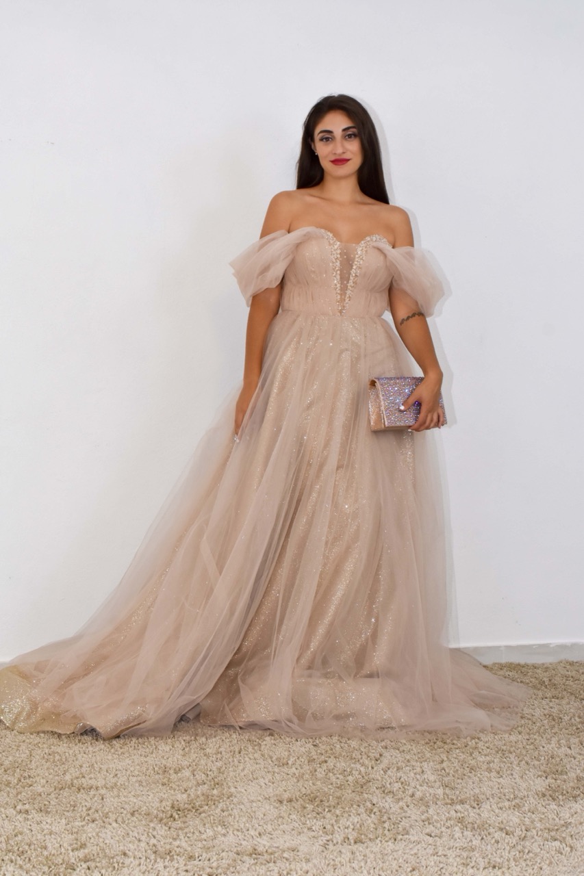 Este deslumbrante vestido de gala em tom nude/champanhe é a personificação do romantismo e da elegância etérea. O design destaca-se pelo seu delicado decote ombro a ombro com mangas bufantes em tule, que emolduram o colo de forma suave e feminina. O corpete estruturado apresenta detalhes minuciosos e uma transparência subtil no centro, garantindo um ajuste perfeito que realça a silhueta com sofisticação. A saia volumosa e fluida, composta por múltiplas camadas de tule de alta qualidade, cria um movimento gracioso e digno de um conto de fadas, culminando numa cauda discreta que acrescenta um toque de drama clássico.
