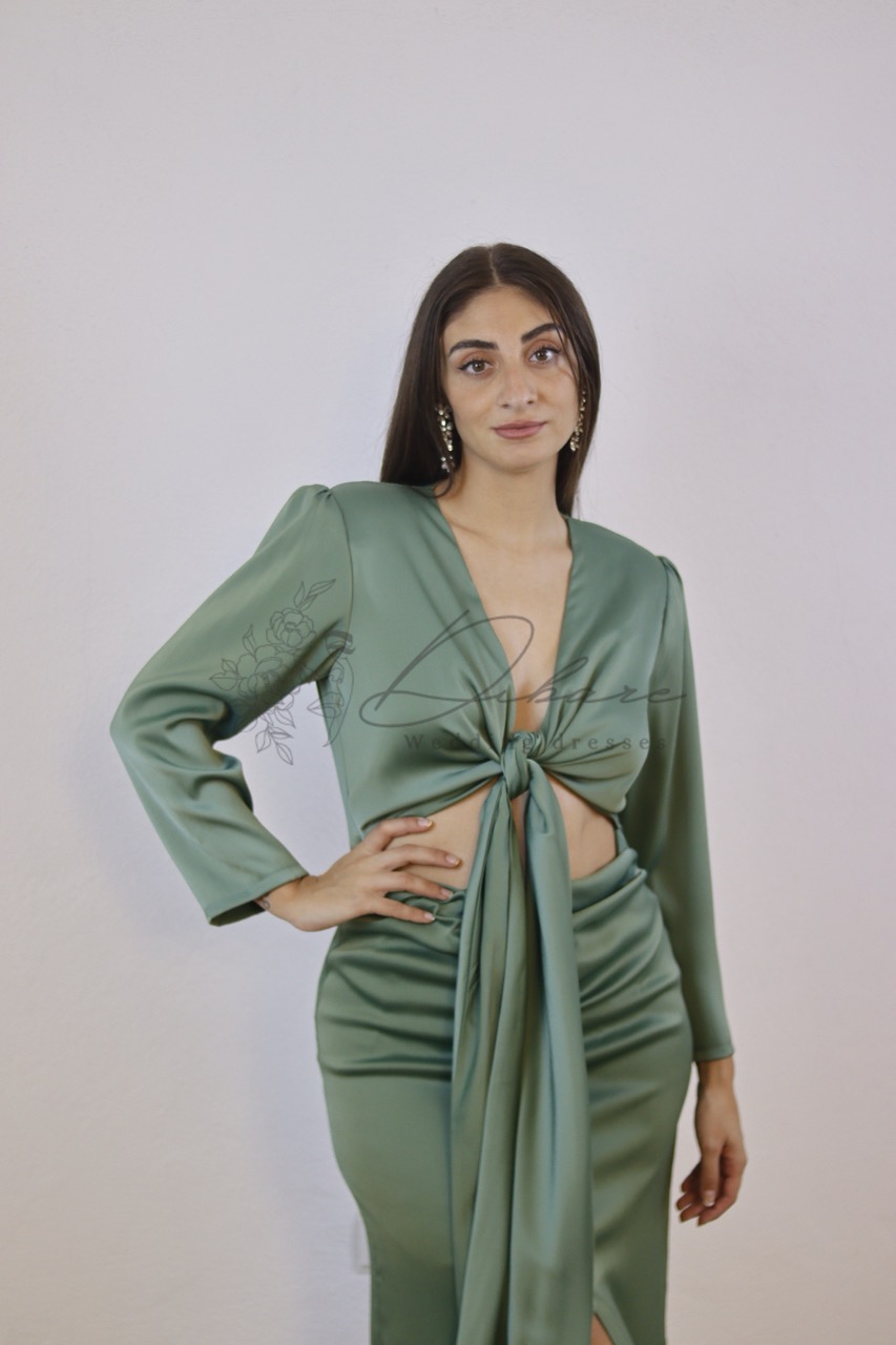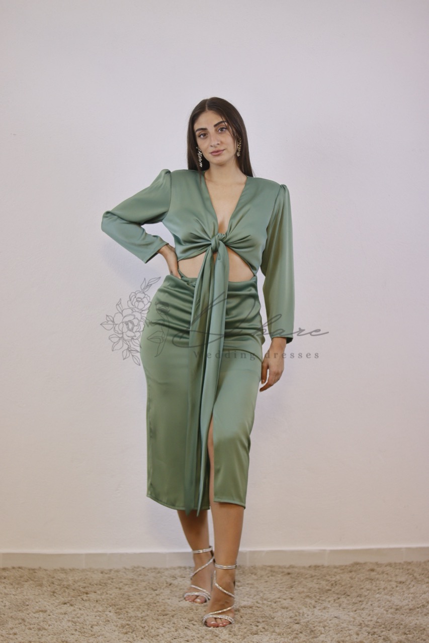 Este vestido elegante é a definição de sofisticação moderna. Confeccionado em um luxuoso cetim com um tom verde suave e cintilante, ele oferece um caimento impecável que valoriza a silhueta. A parte superior, com mangas compridas e um decote em V profundo, destaca-se pelo seu ousado nó frontal ajustável, que não só cria um ponto focal atraente, mas também permite um ajuste personalizado. A saia midi coordenada apresenta um sutil efeito drapeado nas laterais, adicionando textura e dimensão, e possui uma racha frontal elegante que confere movimento e um toque sensual ao caminhar.