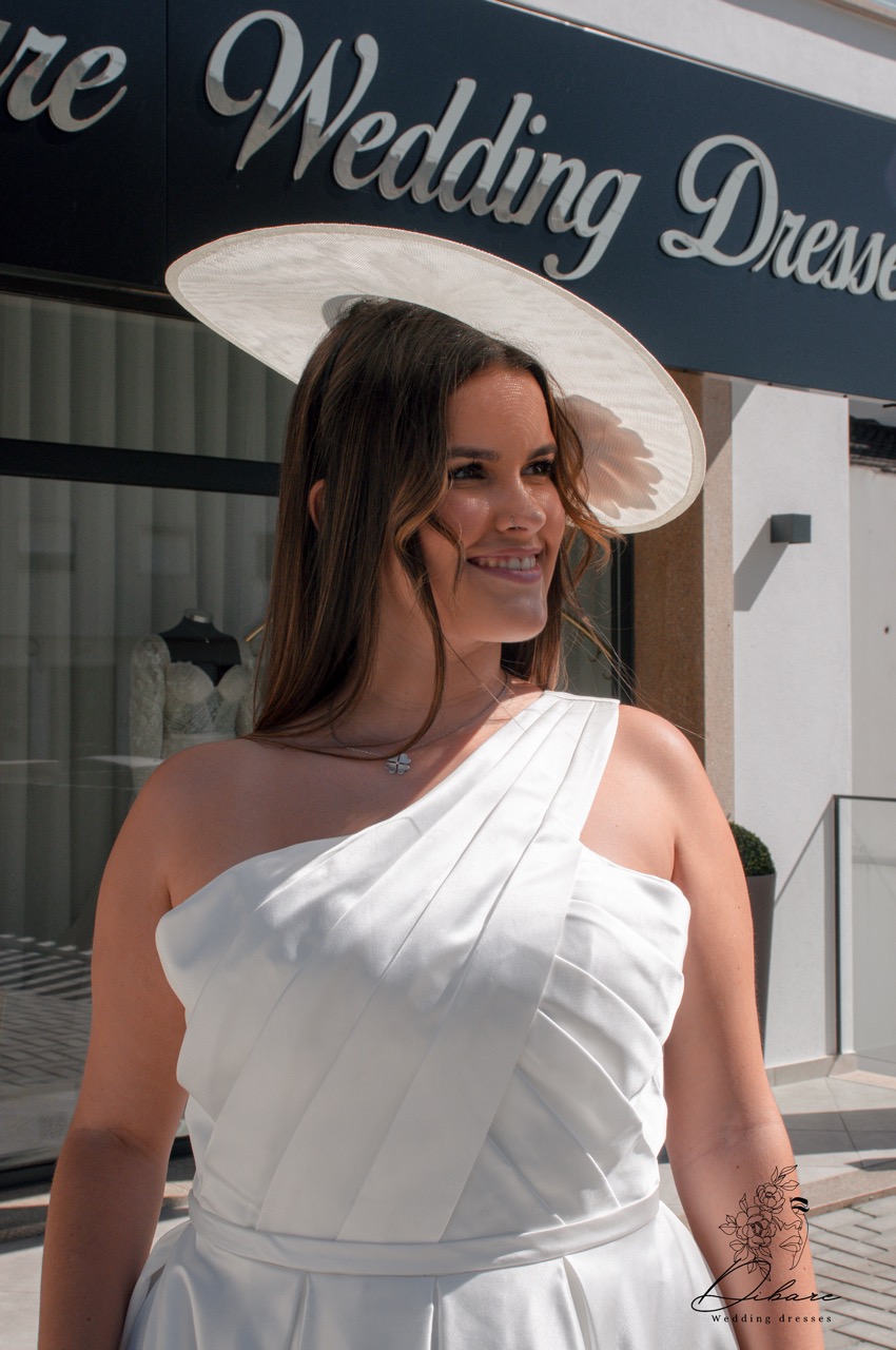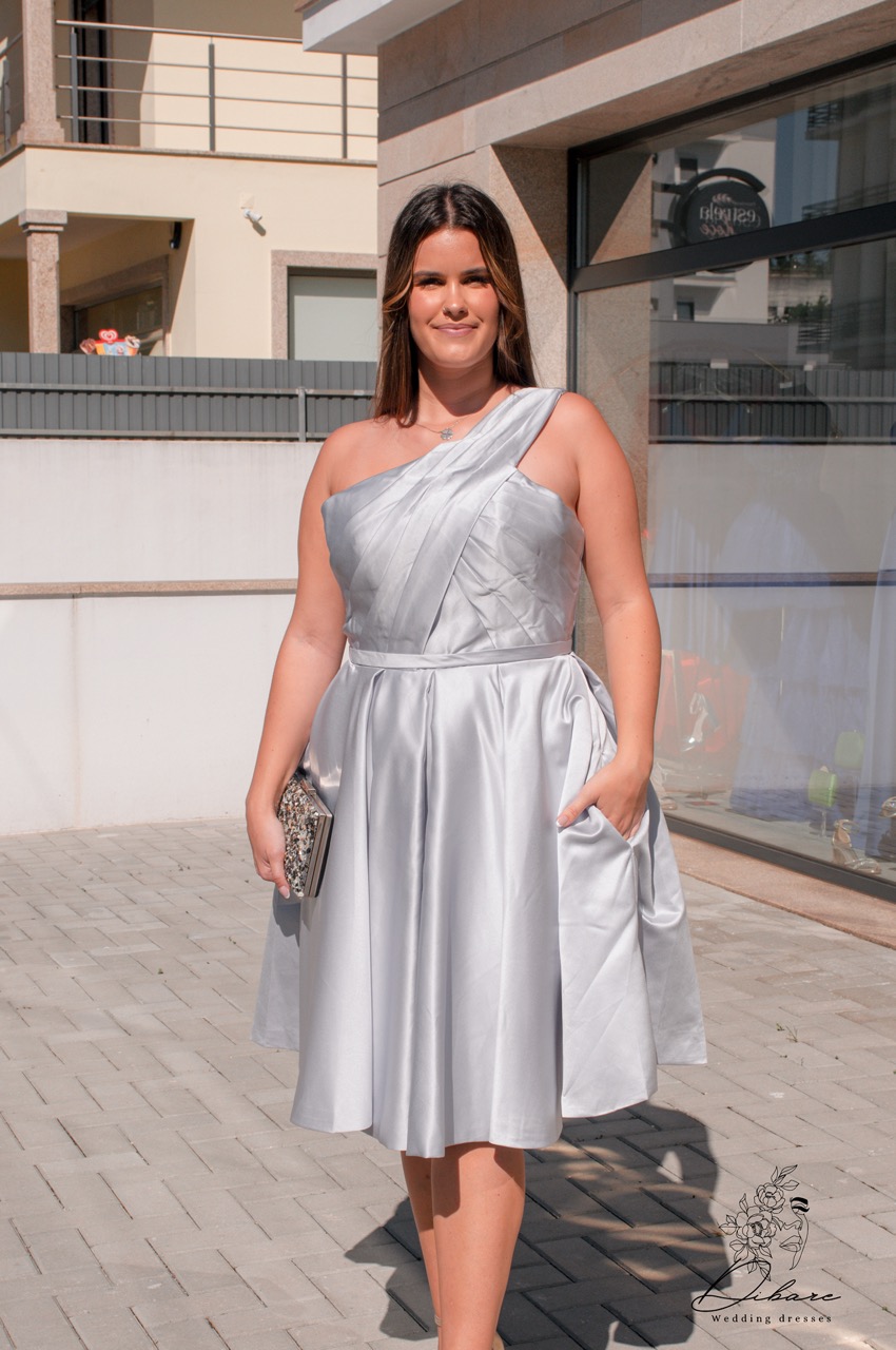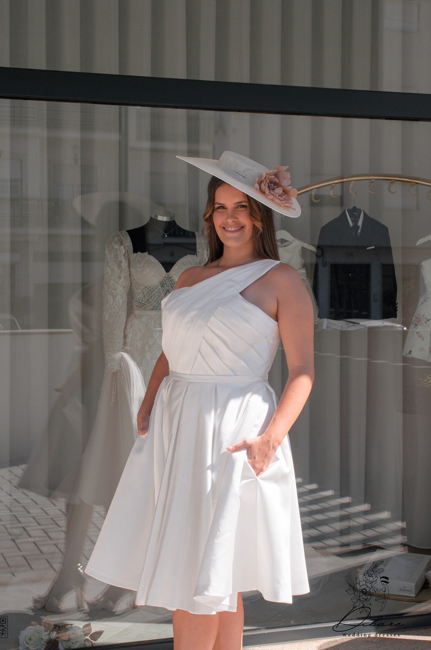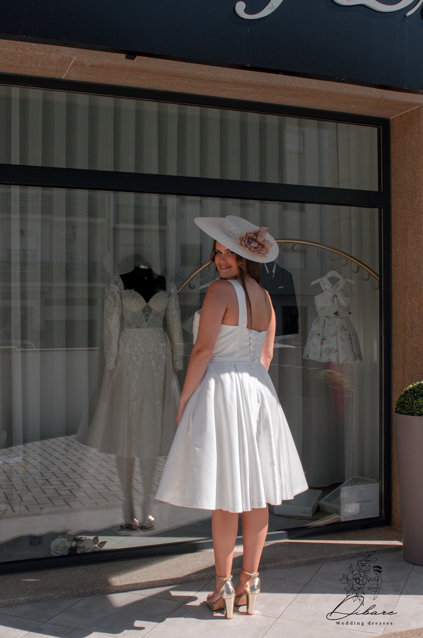 Um vestido curto confeccionado em um tecido firme e estruturado, ideal para quem procura elegância com um toque moderno. O design de uma única alça adiciona sofisticação e estilo, destacando o ombro com um corte assimétrico. Na parte de trás, uma delicada fita se ajusta para ser atada, oferecendo um detalhe charmoso e personalizado. Esse vestido também é perfeito como segundo look para noivas que desejam um visual mais leve e prático para a festa, sem perder a elegância do branco tradicional. A silhueta ajustada valoriza o corpo, mantendo a noiva confortável para dançar e celebrar a noite inteira com estilo e classe.